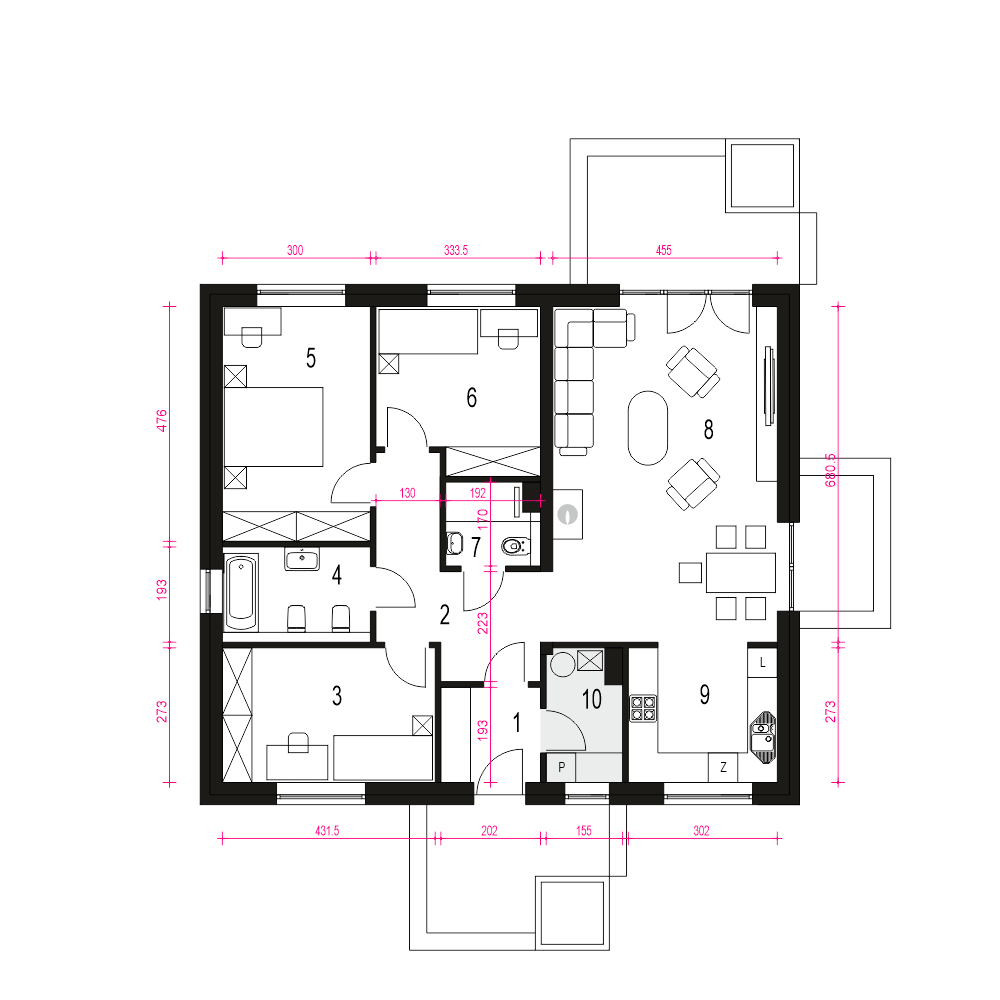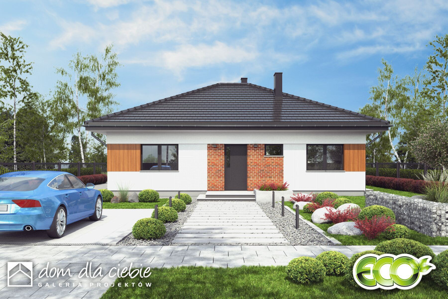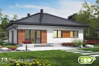 Kalcyt V - projekt domu parterowego dla 4-osobowej rodziny.fundamenty: BETONOWE ściany zewnętrzne: POROTHERM+STYROPIAN TERMO ORGANIKA ściany wewnętrzne: POROTHERM rodzaj stropu i konstrukcja dachu: wiązary prefabrykowane MITEK elewacje: TYNK STRUKTURALNY, CEGŁA KLINKIEROWA pokrycie dachu: DACHÓWKA CERAMICZNA