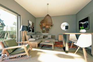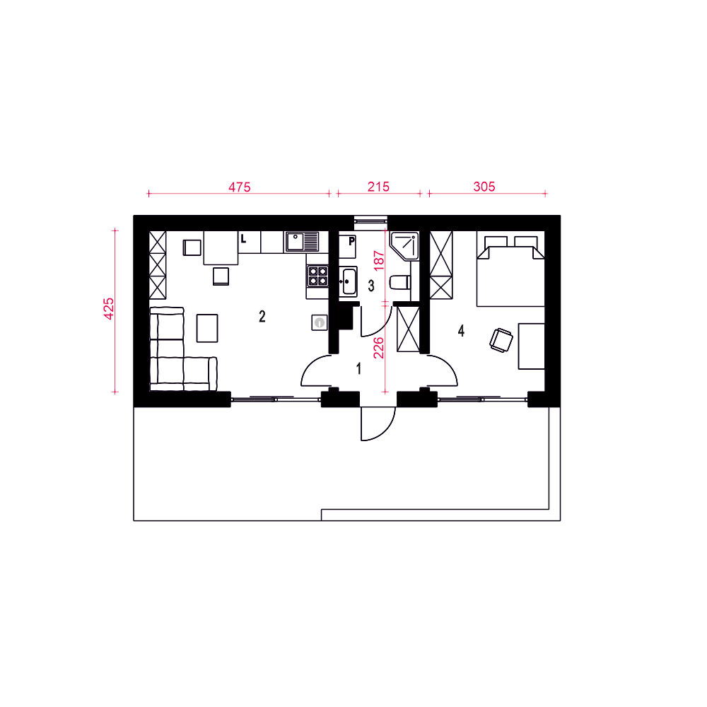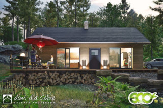 Opieńka to mały, murowany domek weekendowy o dwuspadowym dachu i naturalnej drewnianej elewacji z antracytowymi detalami. Projekt ten skupia się na ekonomicznym podejściu, oferując niewielkie witryny tarasowe dla kontaktu z naturą. Zaledwie 70 m2 powierzchni zabudowy pozwala na harmonijne wkomponowanie się w otoczenie. Wewnątrz znajduje się wiatrołap z szafą, łazienka z prysznicem, niewielka kuchnia, strefa wypoczynkowa z kominkiem oraz miejsce na stół jadalny. Taras stanowi płynne przedłużenie wnętrza na zewnątrz. Opieńka to propozycja ekonomicznego i ekologicznego domu, idealnego na relaksujące weekendy.fundamenty: BETONOWE ściany zewnętrzne: POROTHERM+STYROPIAN TERMO ORGANIKA ściany wewnętrzne: POROTHERM rodzaj stropu: DREWNIANY elewacje: DREWNIANA pokrycie dachu: DACHÓWKA