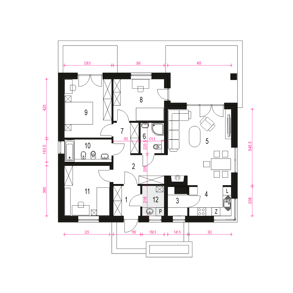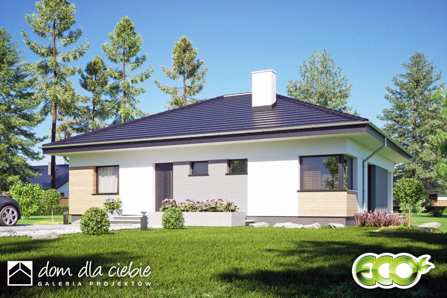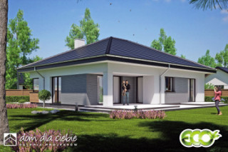 Topaz to niewielki projekt domu parterowego przeznaczony dla 4 osób, z czterospadowym symetrycznym dachem.fundamenty: BETONOWE ściany zewnętrzne: POROTHERM+STYROPIAN TERMO ORGANIKA ściany wewnętrzne: POROTHERM rodzaj stropu i konstrukcja dachu: wiązary prefabrykowane MITEK elewacje: TYNK STRUKTURALNY, CEGŁA KLINKIEROWA pokrycie dachu: DACHÓWKA CERAMICZNA