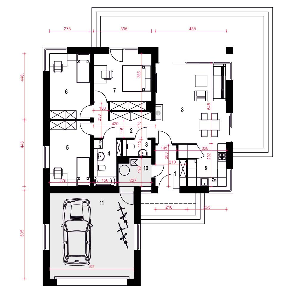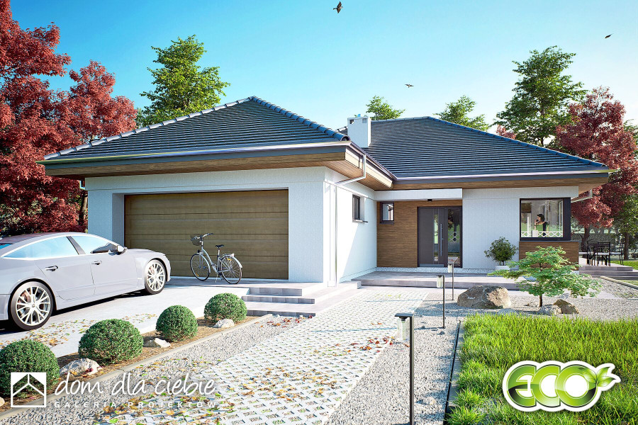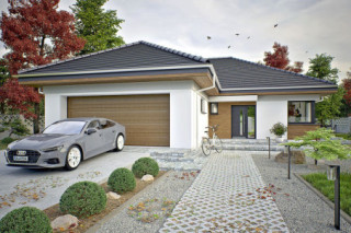 Oliwka to projekt małego, ale wygodnego i praktycznego domu jednorodzinnego z wielospadowym dachem i garażem dwustanowiskowym. Dom wyróżnia się estetycznym wyglądem i zapewnia komfort jego mieszkańcom. Stworzony został z myślą o czteroosobowej rodzinie, a jego uniwersalny design sprawia, że dobrze pasuje zarówno do nowoczesnych osiedli, jak i starszej zabudowy. Wejście prowadzi przez wiatrołap do otwartej przestrzeni dziennej, w której znajdują się salon, kuchnia i jadalnia. W tej strefie zaplanowano kominek oraz dwa wyjścia na taras – z salonu i jadalni. Przy kuchni znajduje się praktyczna spiżarnia, a centralnym miejscem jest jadalnia. Z holu, gdzie zaplanowano szafę wnękową, można przejść do części prywatnej, w której są trzy sypialnie i duża łazienka. Dom ma także eleganckie narożne okna, które dodają mu nowoczesnego wyglądu. To projekt idealny dla osób szukających taniego w budowie i utrzymaniu domu, który spełnia współczesne potrzeby. Uniwersalny styl tego domu to jego duża zaleta.