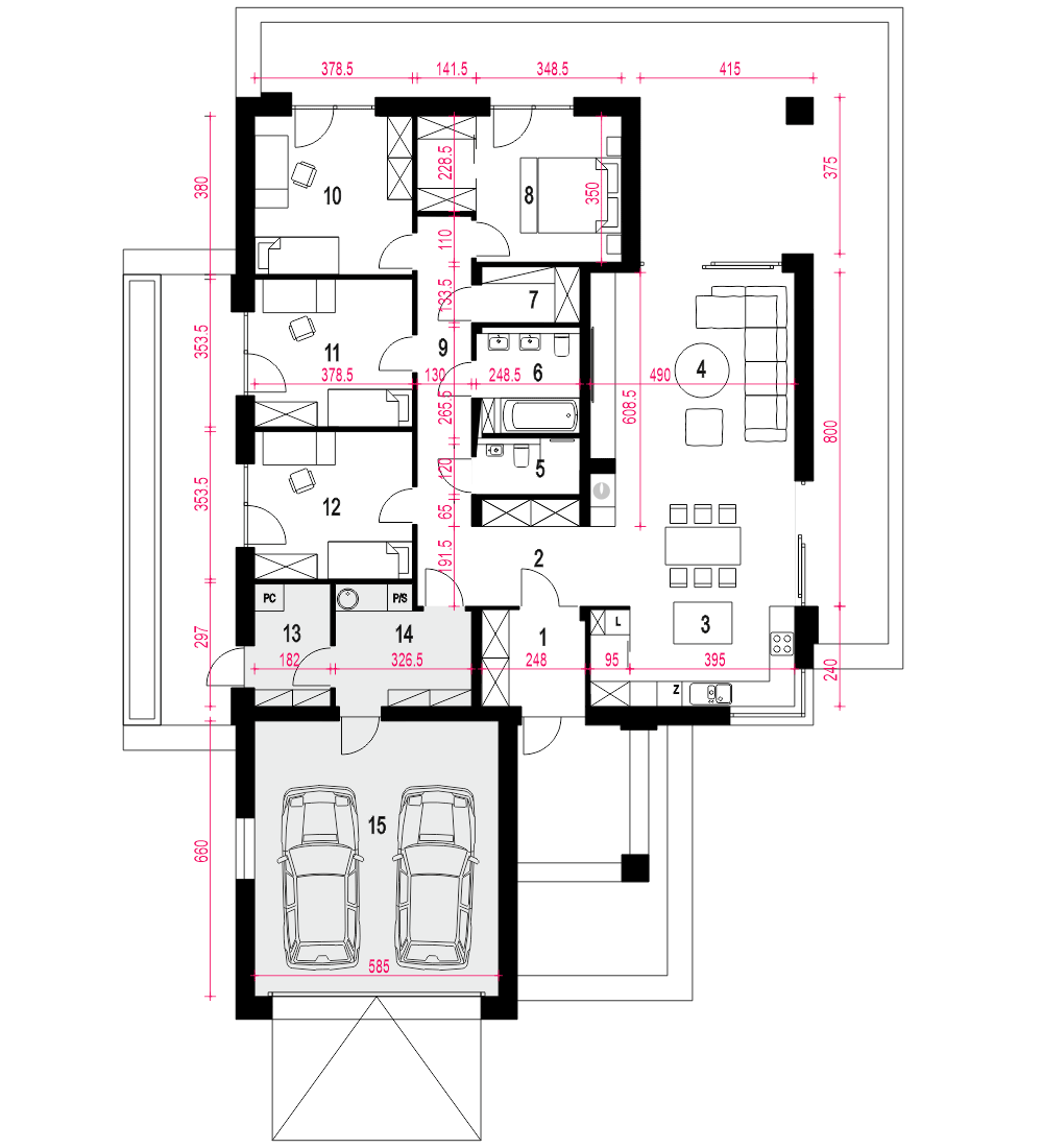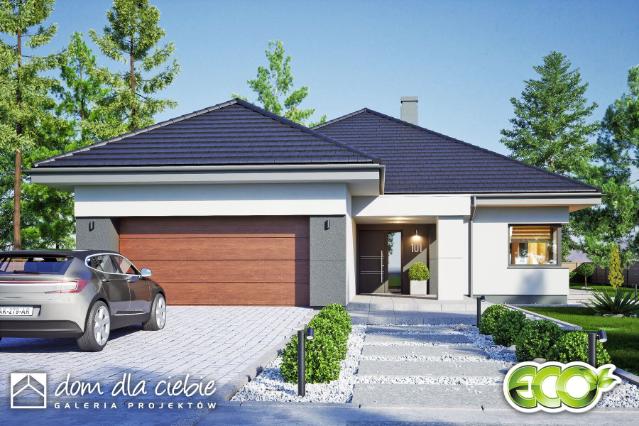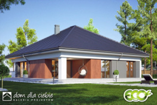 Projekt domu parterowego Laura II z garażem dwustanowiskowym to nowoczesny dom dla 4ro osobowej rodziny. Dom zaprojektowano w technologii murowanej z tradycyjną więźbą dachową, przekryty jest spadzistym dachem wielospadowym. Laura to funkcjonalny projekt domu parterowego, łączący strefę ogólnodostępną i prywatną w jednym poziomie. W części wejściowej projekt przewiduje wygodny wiatrołap, hol, łazienkę, toaletę, pralnię z której przewidziano dostęp do garażu oraz kotłowni. W części ogólnodostępnej zaprojektowano przestronny i dobrze doświetlony salon z miejscem na wygodny stół jadalniany z widokiem na ogród. Dzięki dużym drzwiom tarasowym od strony ogrodu, dostaniemy się wprost na obszerny taras zewnętrzny, zadaszony praktycznym podcieniem. Przy salonie od strony frontowej przewidziano wygodną kuchnię z wyspą i spiżarnią. Do części prywatnej dostaniemy się przez korytarz dostępny z holu wejściowego. W części prywatnej mamy do dyspozycji cztery pokoje sypialne w tym jeden z garderobą, przewidziano tu też wygodną, wspólną łazienkę z wanną. Laura to atrakcyjna propozycja domu energooszczędnego, o nowoczesnym wyglądzie. To projekt domu z serii "eco" - ekonomiczny w budowie i w utrzymaniu - idealna propozycja dla rodzin planujących budowę pierwszego domu.fundamenty: BETONOWE ściany zewnętrzne: POROTHERM+STYROPIAN TERMO ORGANIKA rodzaj stropu: TERIVA I elewacje: TYNK STRUKTURALNY pokrycie dachu: DACHÓWKA CEM. lub CER.