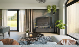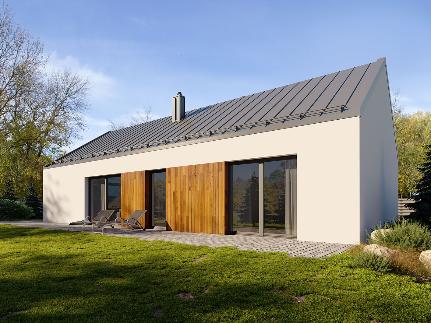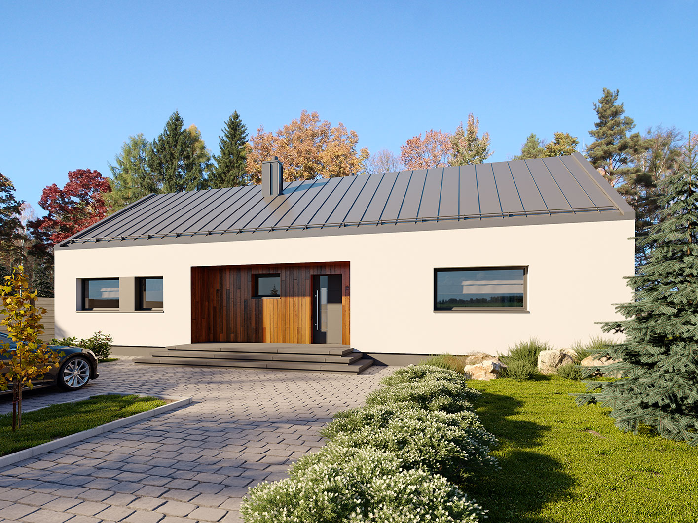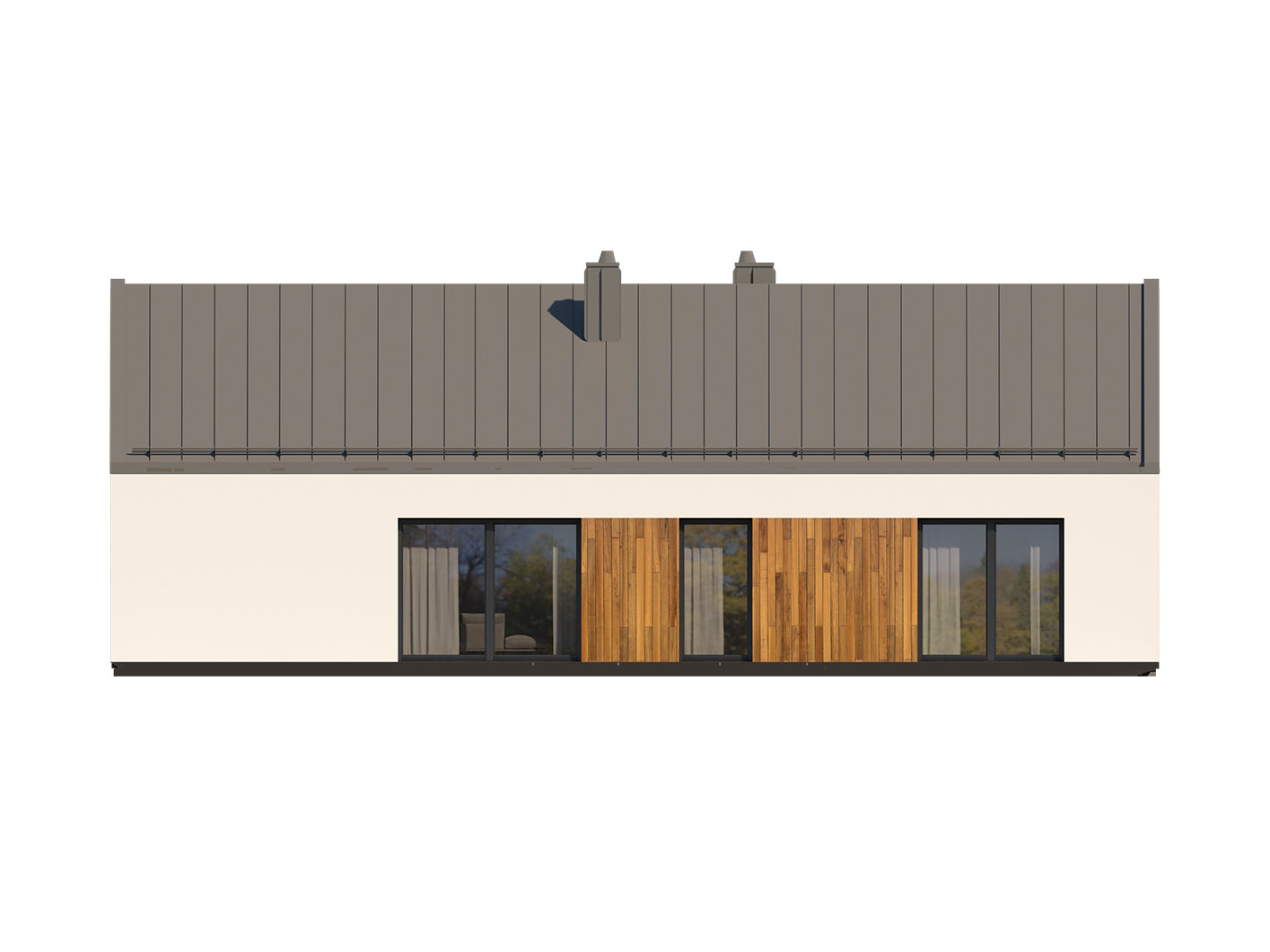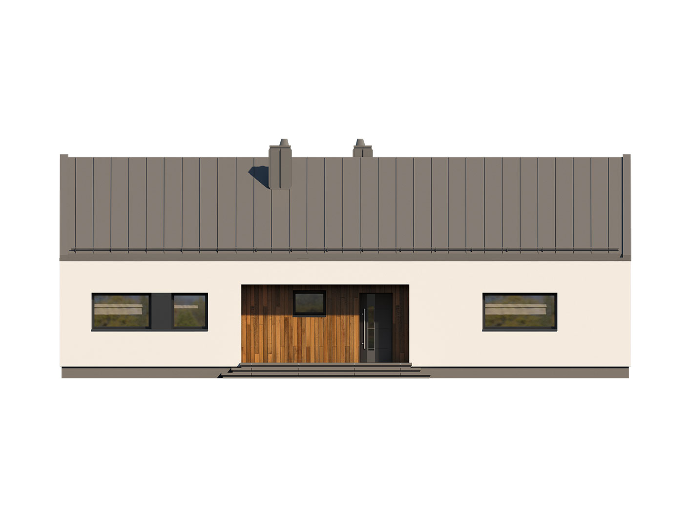 Piko to parterowy dom jednorodzinny w stylu nowoczesnej stodoły, łączący nowoczesny charakter elewacji z prostym, klasycznym układem pomieszczeń. Jest to bardzo wygodny, prosty i funkcjonalny dom, który swoim pełnym programem zapewnia optymalny komfort 4-osobowej rodzinie. Przestronna część dzienna to duży salon z jadalnią otwierający się na ogród poprzez ogromne przeszklenie oraz kuchnia ze spiżarnią. Atutem projektu jest duży, częściowo zadaszony taras dostępny z salonu, kuchni i jadalni. Tak zaproponowany, ciekawy i przestronny układ pomieszczeń umożliwia szereg aranżacji. Część nocna to 3 wygodne sypialnie, z czego dwie posiadają wyjście na taras oraz łazienka i pralnia. W domu zaprojektowano kotłownię dostępną z wiatrołapu, której parametry pozwalają na montaż kotła na każdy rodzaj paliwa, w tym na paliwo stałe. Ten optymalny i ciekawy program funkcjonalny został ujęty w prostej bryle, przykrytej dwuspadowym, bezokapowym dachem.