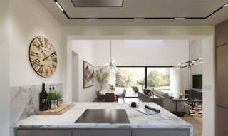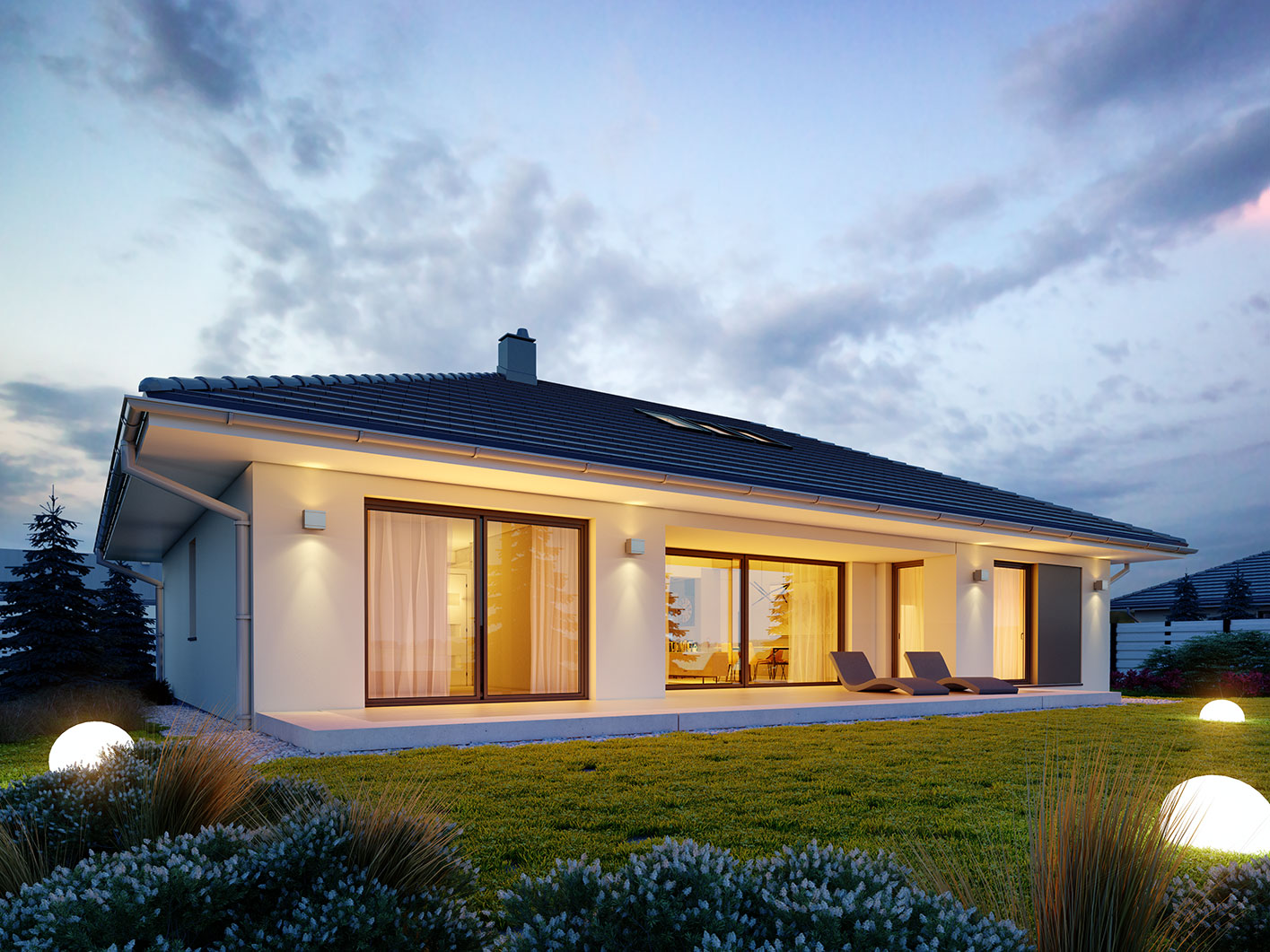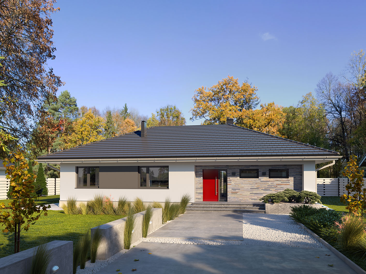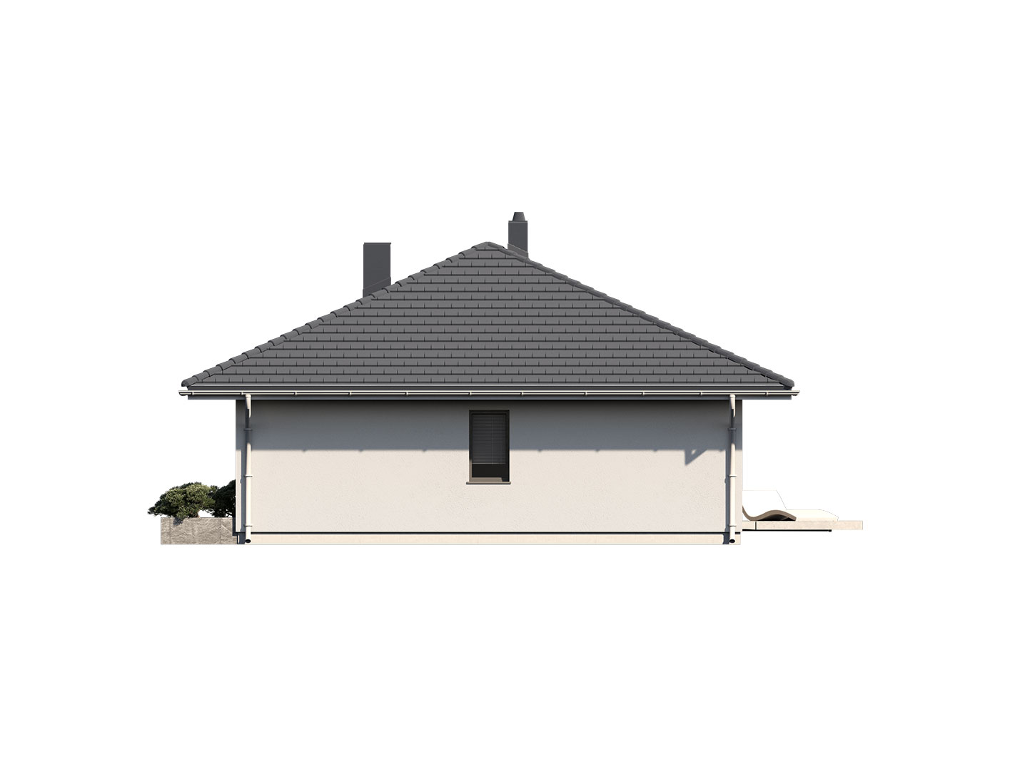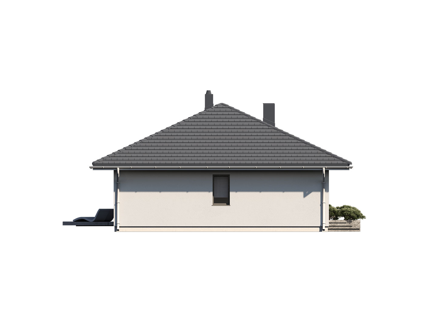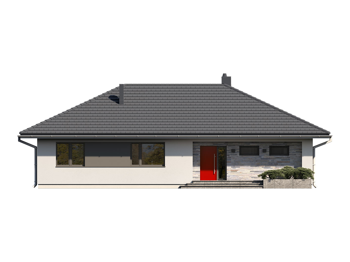 Otis 3 to ciekawy projekt nowoczesnego domu parterowego. Swoim programem funkcjonalnym zapewnia komfort i wygodę 4-osobowej rodzinie. Część dzienną tworzy przestronny salon z jadalnią, którego cechą charakterystyczną jest otwarcie po skosy dachu oraz duże przeszklenie całej ściany z wyjściem na duży zadaszony taras. Kuchnia może być otwarta na salon lub można ją przymknąć. Część nocna podzielona jest na dwie części. Sypialnia rodziców jest oddalona od pozostałych dwóch sypialni, posiada też własną łazienkę. W projekcie wyodrębniono również strefę gospodarczą, składającą się pralni, spiżarni oraz kotłowni. Dom Otis 3, mimo niedużych gabarytów i prostej bryły, oferuje przestronne, efektowne wnętrze które można zaaranżować na wiele sposobów.