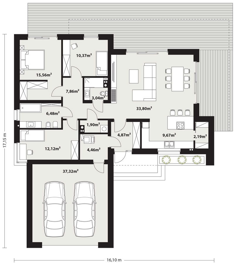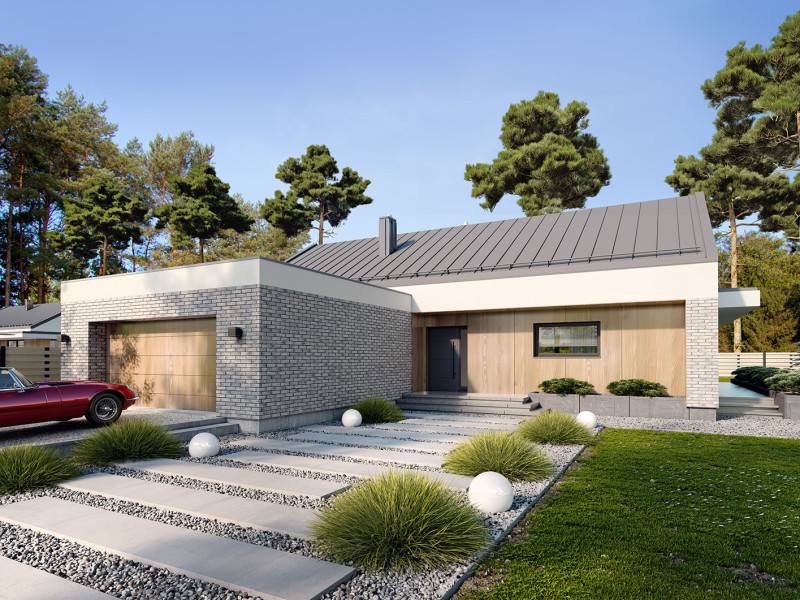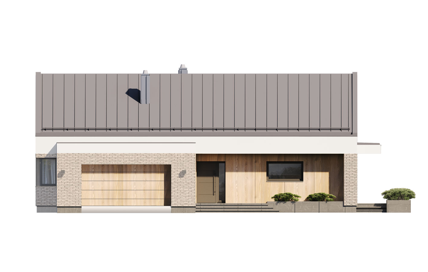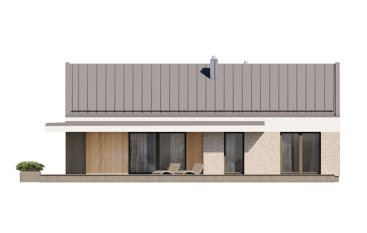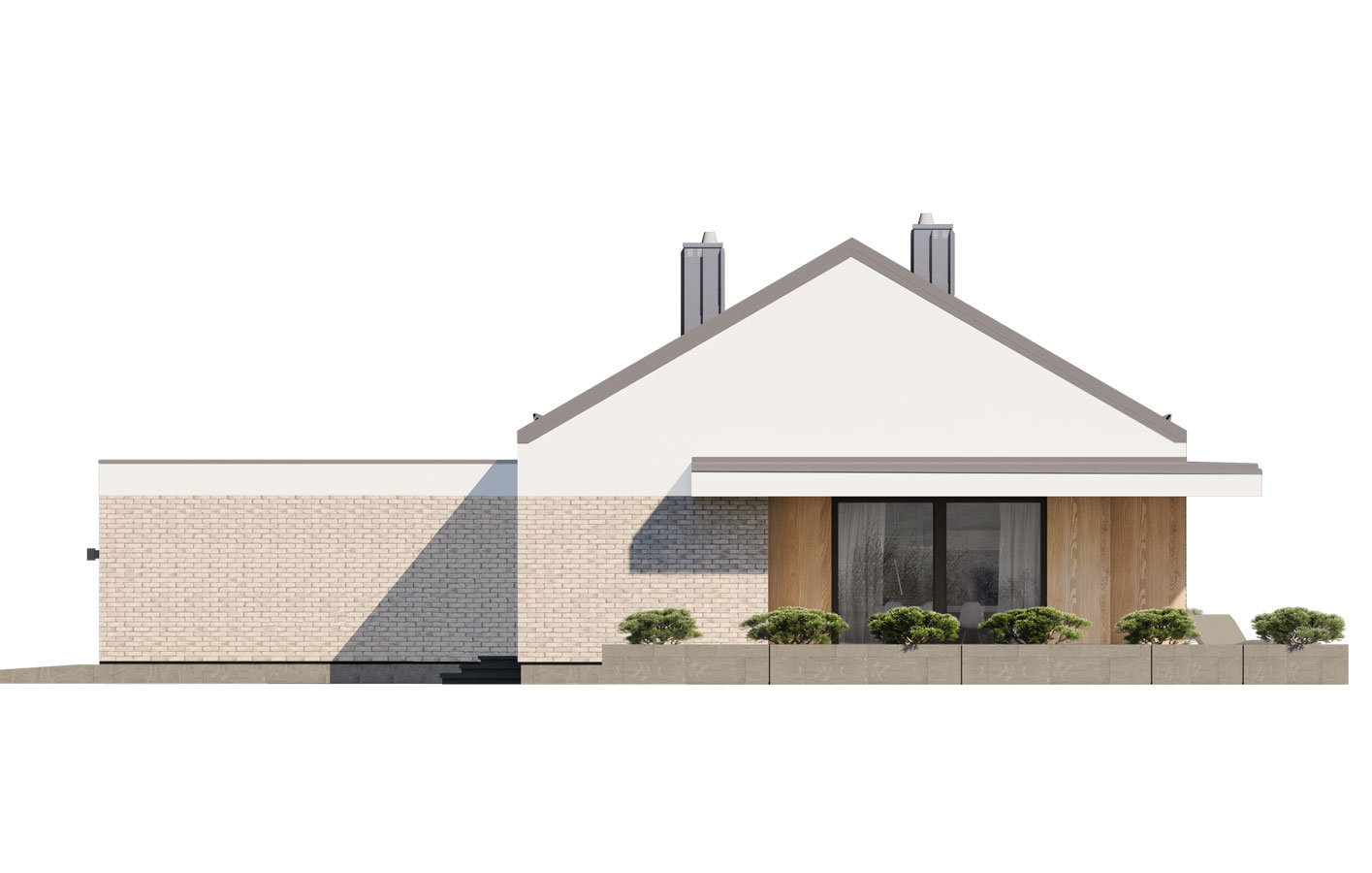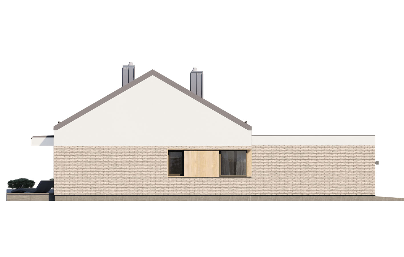 Nori 2 to parterowy dom jednorodzinny, łączący nowoczesny charakter elewacji z prostym, klasycznym układem pomieszczeń. Jest to bardzo wygodny, prosty i funkcjonalny dom, który swoim pełnym programem zapewnia optymalny komfort 4-osobowej rodzinie. Przestronna część dzienna to duży salon z jadalnią otwierający się na ogród poprzez ogromne przeszklenie, kuchnia ze spiżarnią oraz wc. Atutem projektu jest duży, zadaszony taras. Tak zaproponowany, ciekawy i przestronny układ pomieszczeń umożliwia szereg aranżacji. Część nocna to 3 wygodne sypialnie, z czego dwie posiadają wyjście na taras oraz przestronna łazienka i pralnia. W domu zaprojektowano dużą kotłownię dostępną z wiatrołapu, której parametry pozwalają na montaż kotła na każdy rodzaj paliwa, w tym na paliwo stałe oraz dwustanowiskowy garaż. Ten optymalny i ciekawy program funkcjonalny został ujęty w prostej bryle, przykrytej dwuspadowym, bezokapowym dachem. Atutem projektu jest jego prostota zarówno w układzie pomieszczeń jak i w rozwiązaniach elewacji, gdzie elegancki, nowoczesny styl osiągnięto poprzez klasyczne, proste ale szlachetne materiały oraz subtelny detal.