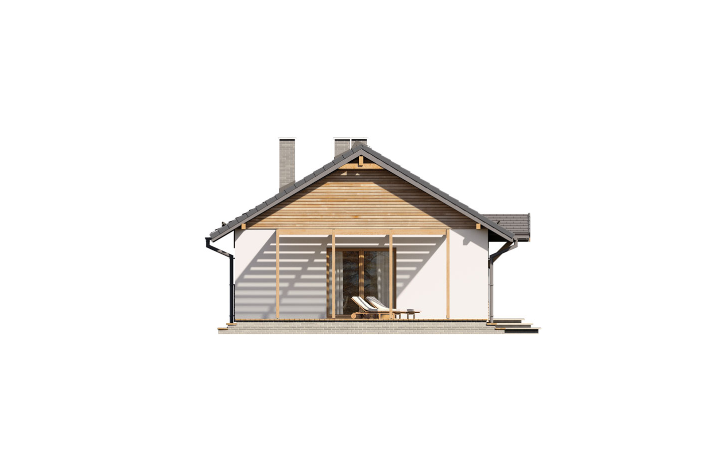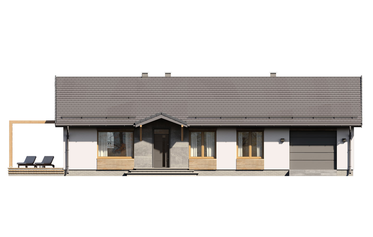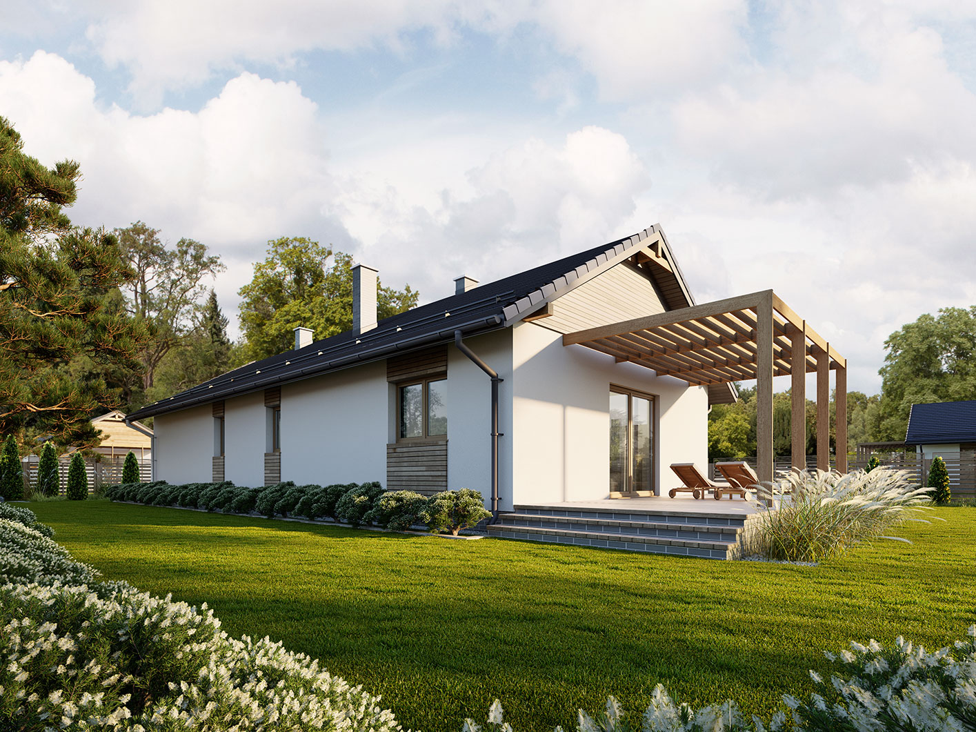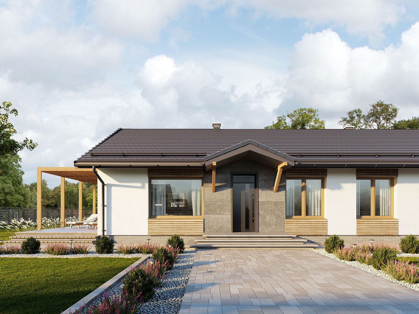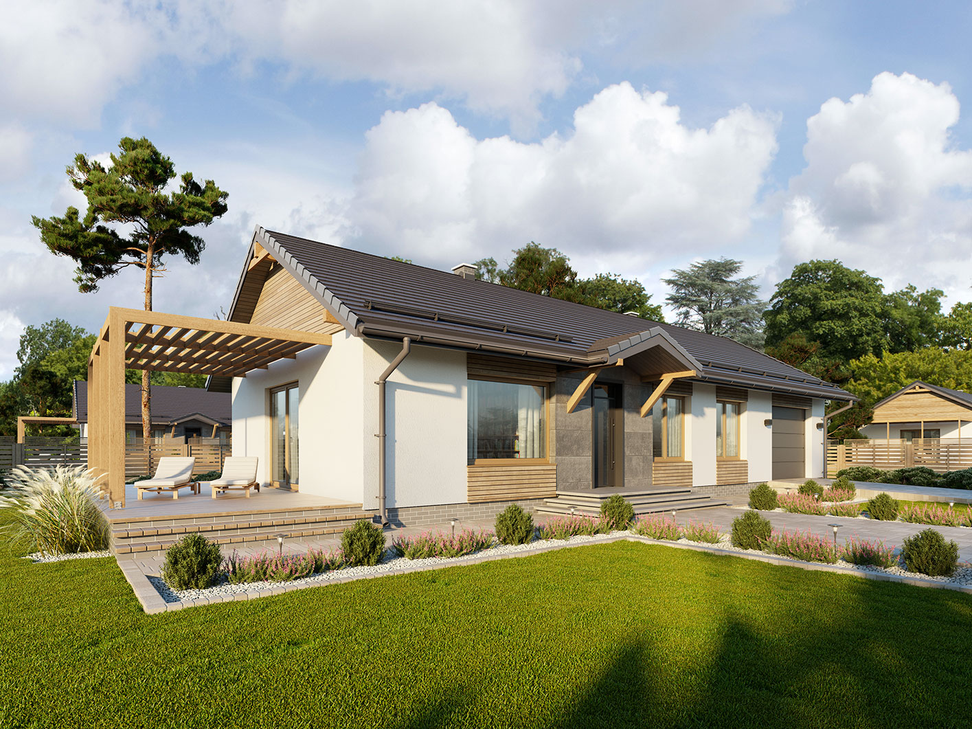 Neo to projekt domu parterowego z garażem, który pomimo prostej bryły prezentuje się niezwykle ciekawie. Zwarta bryła budynku została zaprojektowana na rzucie prostokąta. Przykryto ją dwuspadowym dachem. Na elewacji pojawiła się deska elewacyjna w kolorze naturalnego jasnego drewna. Dach został pokryty dachówką w grafitowym odcieniu. Neo to dom z dwoma sypialniami, częścią dzienną oraz gospodarczą. Dużo miejsca przewidziano na szafy i schowki. Część gospodarcza z garażem i dużą kotłownią także zapewnia sporo użytecznej przestrzeni.