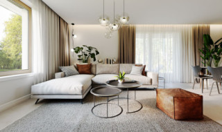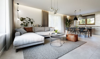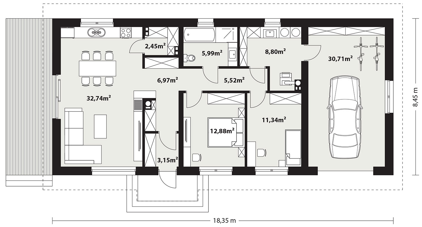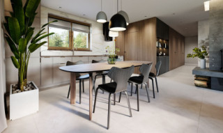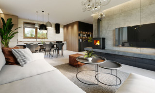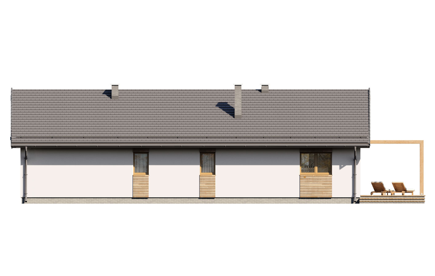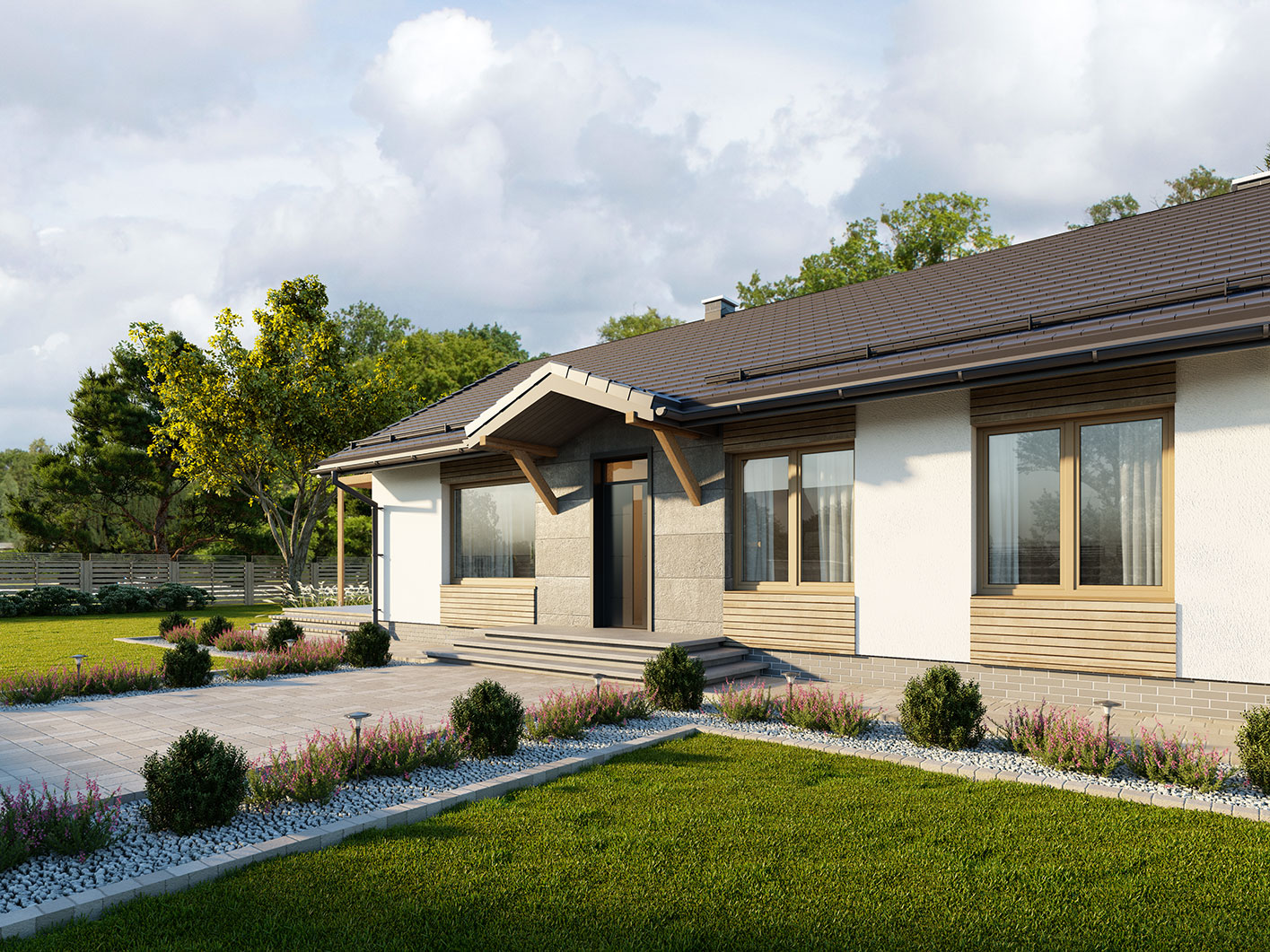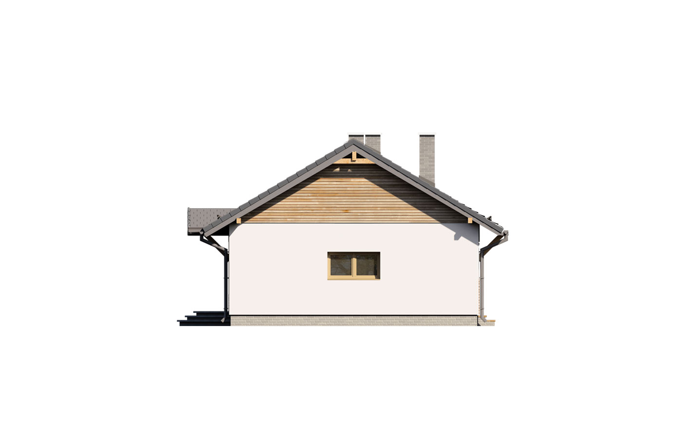 Neo to projekt domu parterowego z garażem, który pomimo prostej bryły prezentuje się niezwykle ciekawie. Zwarta bryła budynku została zaprojektowana na rzucie prostokąta. Przykryto ją dwuspadowym dachem. Na elewacji pojawiła się deska elewacyjna w kolorze naturalnego jasnego drewna. Dach został pokryty dachówką w grafitowym odcieniu. Neo to dom z dwoma sypialniami, częścią dzienną oraz gospodarczą. Dużo miejsca przewidziano na szafy i schowki. Część gospodarcza z garażem i dużą kotłownią także zapewnia sporo użytecznej przestrzeni.
