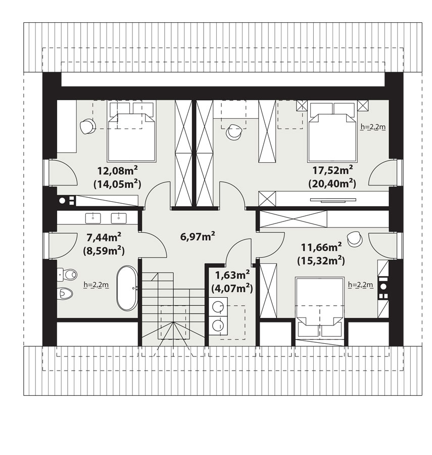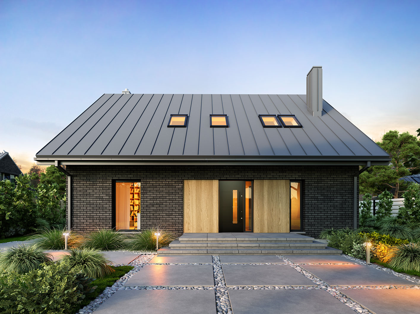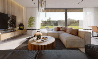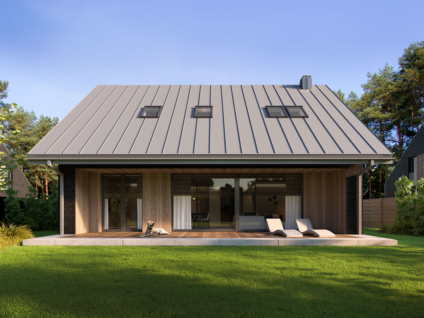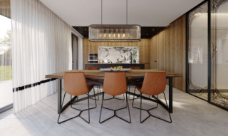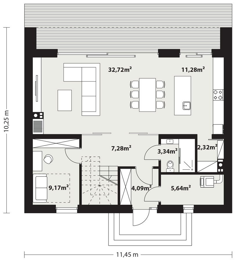 Projekt Muna to dom parterowy z użytkowym poddaszem o nowoczesnej formie i funkcjonalnych, przestronnych wnętrzach. Z pewnością spodoba się osobom preferującym nietuzinkowe rozwiązania i zafascynowanym nowoczesną architekturą. Prosta bryła budynku na rzucie prostokąta z dwuspadowym, bezokapowym dachem została urozmaicona przeszkleniami nadającym lekkości. Wyrafinowana stylistyka została osiągnięta poprzez subtelny detal oraz kontrast trzech materiałów - antracytowej blachy, płytki elewacyjnej imitującej cegłę i ciepłego koloru drewnianej szalówki. Atutem projektu domu Muna jest ciekawa, otwarta część dzienna, bardzo dobrze doświetlona dzięki ogromnym przeszkleniom. Przeszklenia te zarówno z salonu jak i jadalni prowadzą na częściowo zadaszony taras na całej długości budynku. Taka aranżacja kuchni, salonu i jadalni sprawia, że wydają się one jeszcze większe a krajobraz z zewnątrz przenika do wnętrza stając się jego nieodzowną częścią. Pasjonatom gotowania na pewno spodoba się wygodna, nowoczesna kuchnia dopełniona praktyczną, dużą spiżarnią. Funkcjonalny program parteru uzupełnia jeszcze gabinet, łazienka, duża kotłownia. Szerokie, wygodne schody prowadzą na poddasze gdzie znajdują się 3 sypialnie. Największa z nich posiada własną garderobę. Całość funkcjonalną poddasza dopełnia wspólna łazienka i pralnia. Projekt Muna jest idealną propozycją dla 4-5 osobowej rodziny, która ceni elegancki, nowoczesny wygląd budynku i jego wyrafinowaną stylistykę.