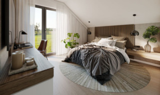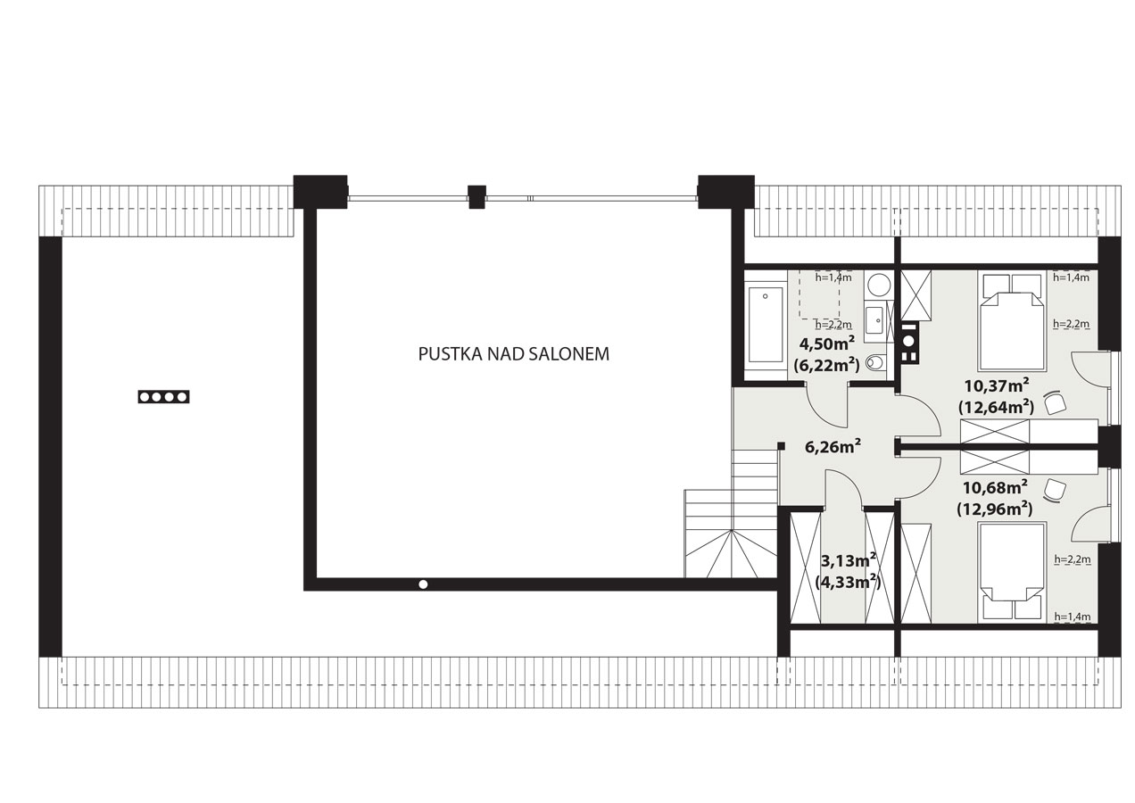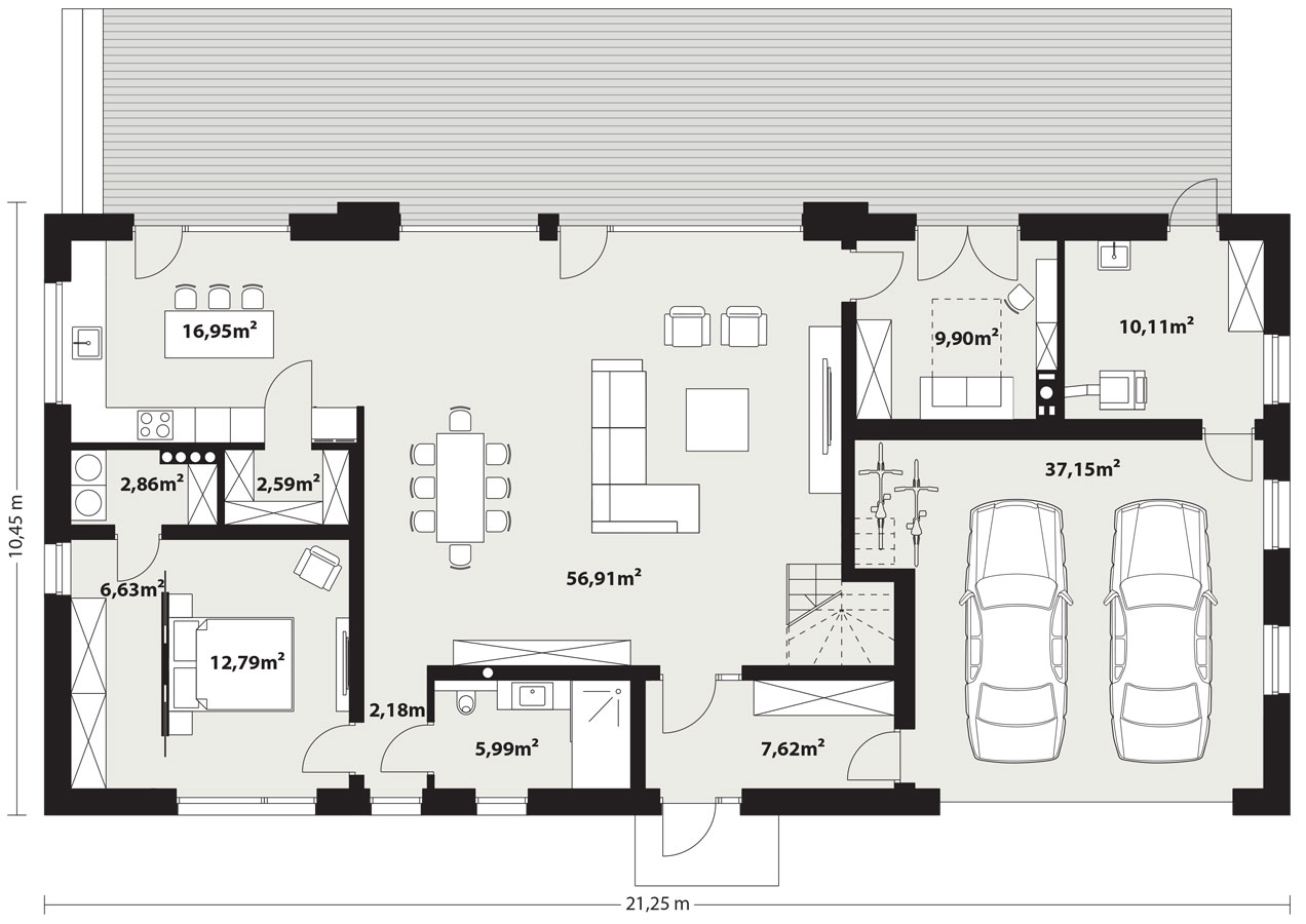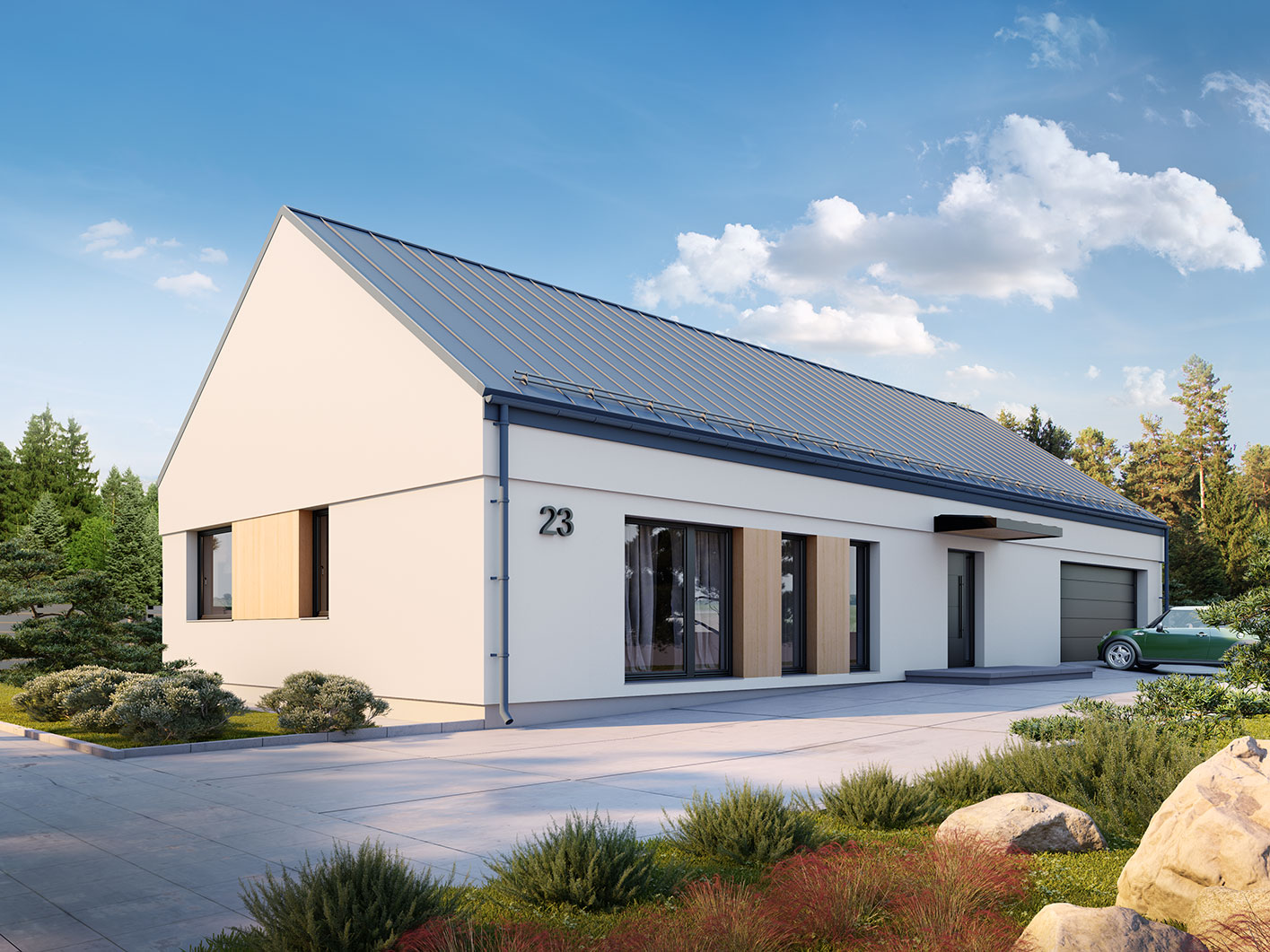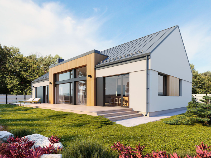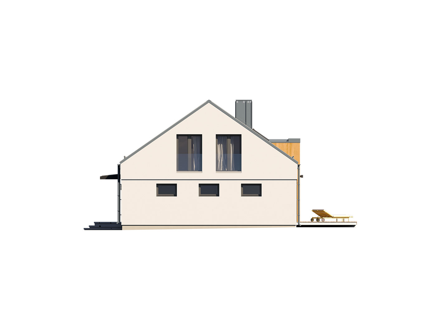 Dom Multi 2 to ciekawa propozycja dla inwestorów ceniących współczesne spojrzenie na architekturę. Projekt ma bardzo interesującą aranżację zewnętrzną i swoim charakterem nawiązuje do stylu nowoczesnej stodoły. Bryła domu, usytuowana jest na planie prostokąta i przykryta dwuspadowym dachem. Nowoczesną stylistykę podkreśla dodatkowo ogromne przeszklenie w części dziennej oraz podwyższony salon. We wnętrzu zachowano bardzo przejrzysty i funkcjonalny program użytkowy dla 4-5 osobowej rodziny. Układ domu został podzielony na 3 strefy. Część dzienna to przestronny salon z jadalnią, kuchnia ze spiżarnią i wc. Strefa intymna składa się z 2 sypialni na poddaszu oraz dużej sypialni z garderobą na parterze. Część gospodarcza to dwustanowiskowy garaż i kotłownia. Niewątpliwym atutem projektu jest zastosowanie dużego tarasu oraz licznych przeszkleń z możliwością wyjścia na taras zarówno z salonu jak i z kuchni i gabinetu.