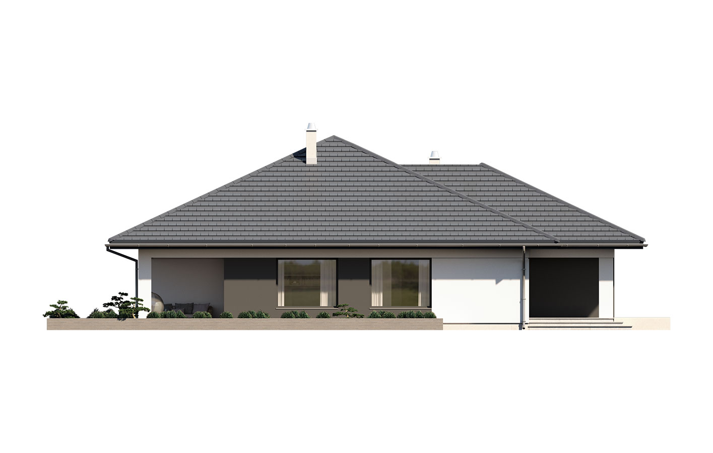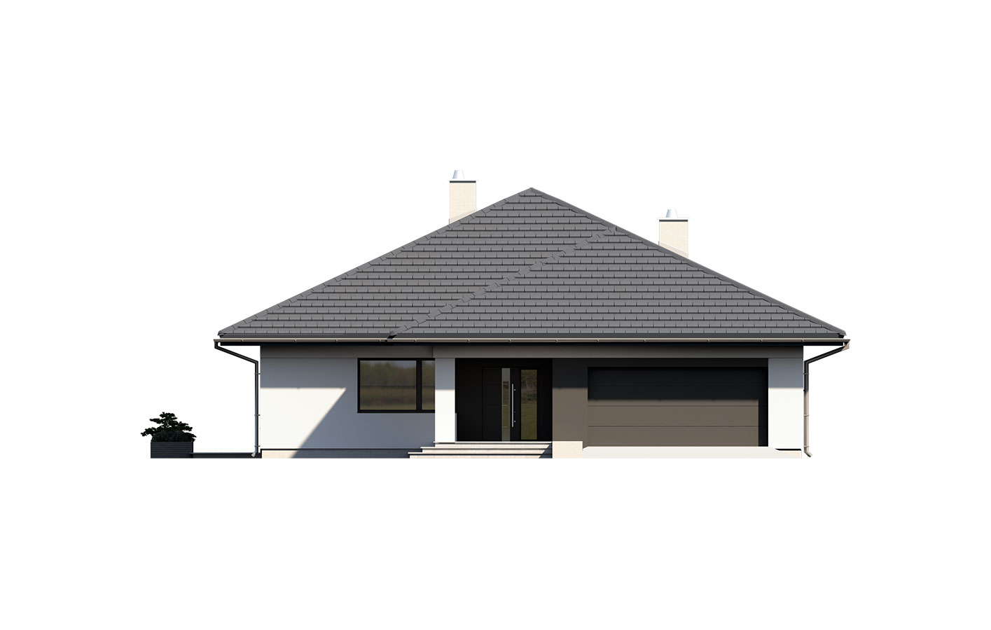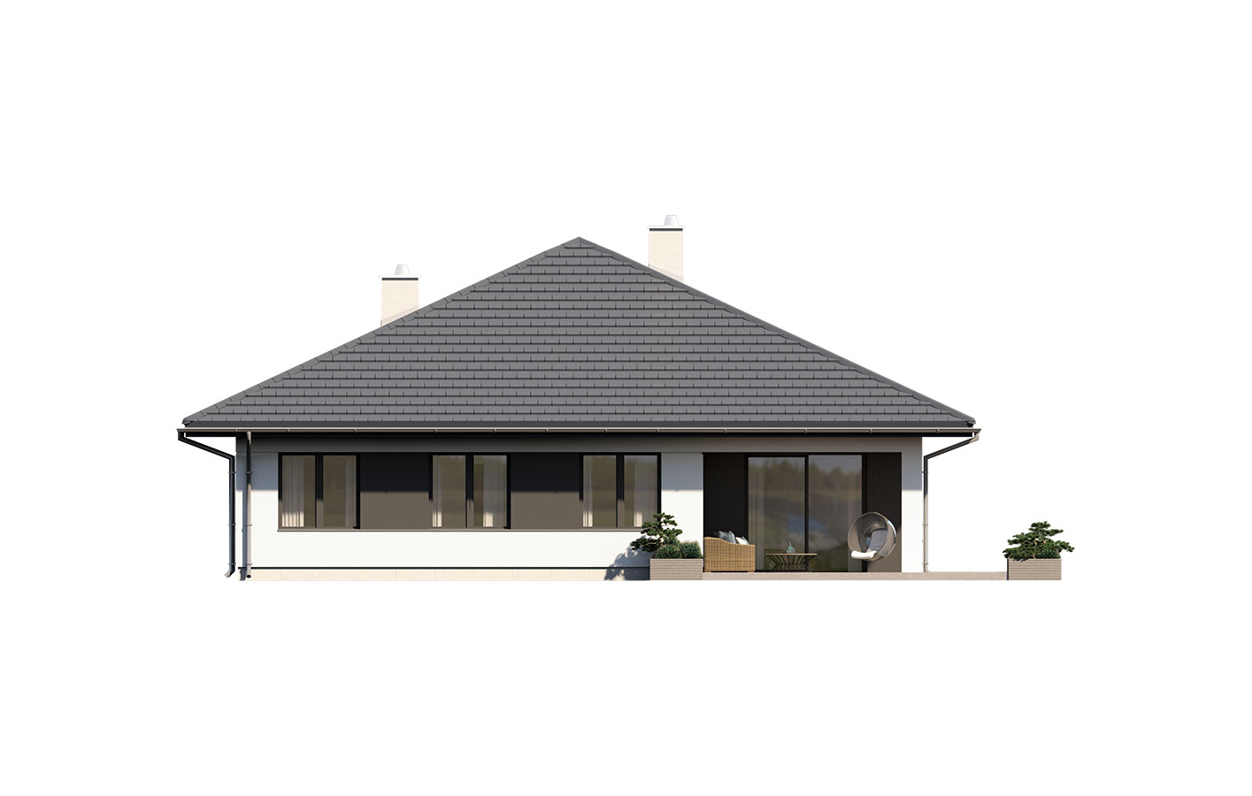 Irysek 7 to parterowy dom jednorodzinny, z dwustanowiskowym garażem. Swoim pełnym programem funkcjonalnym zapewnia komfort i wygodę 4,5-osobowej rodzinie. Przestronna część dzienna to wysoki salon połączony z jadalnią, otwierający się na ogród poprzez ogromne przeszklenie i zadaszony taras. Kuchnia posiada spiżarnię i może być oddzielona od jadalni ścianą lub przesuwnymi drzwiami. Część nocna to 4 wygodne sypialnie, łazienka i pralnia. Dodatkowo główna sypialnia posiada własną garderobę i łazienkę. W domu zaprojektowano dużą kotłownię dostępną z garażu. Część gospodarczą uzupełnia jeszcze dwustanowiskowy garaż. Ten optymalny i ciekawy program funkcjonalny został ujęty w prostej bryle przykrytej wielospadowym dachem. Atutem projektu jest jego prostota zarówno w układzie pomieszczeń, jak i w rozwiązaniach elewacji, gdzie elegancki, nowoczesny styl połączono z delikatnym i subtelnym detalem.