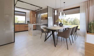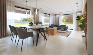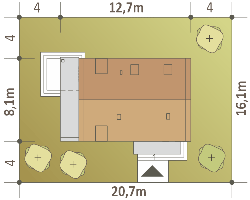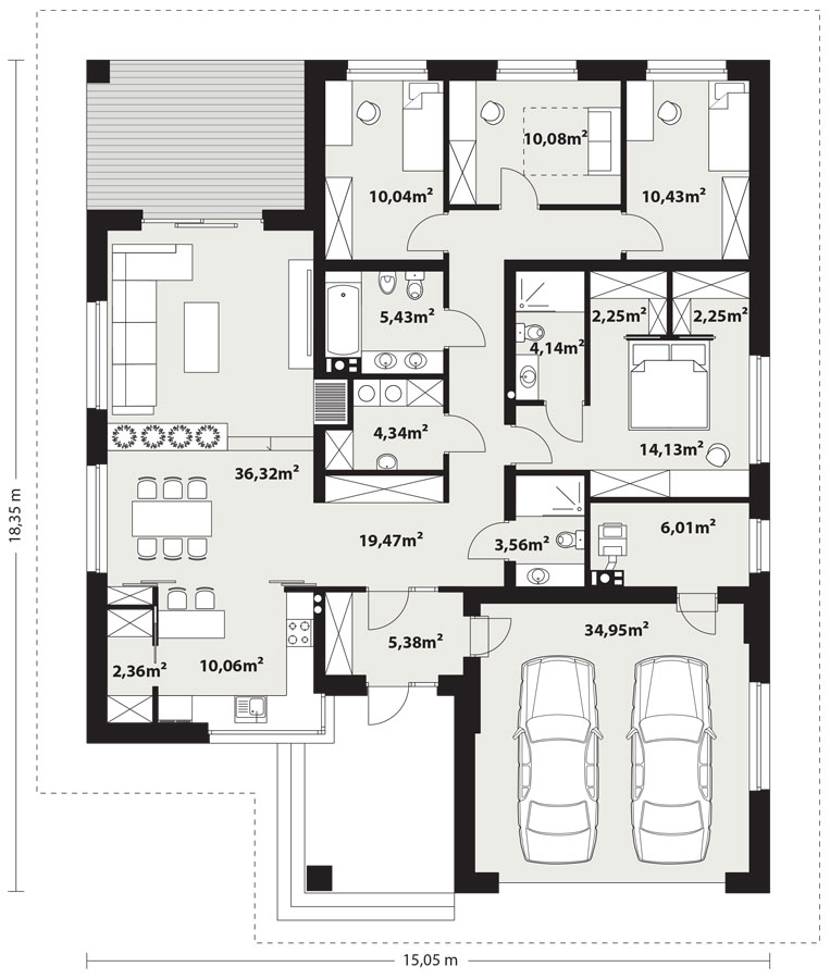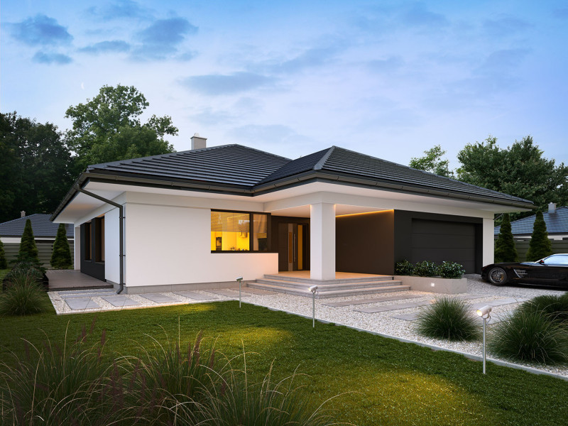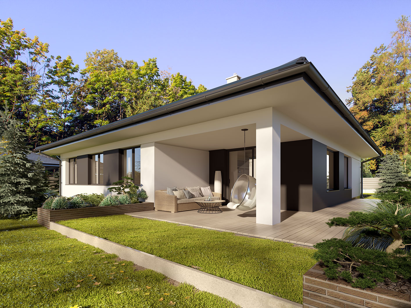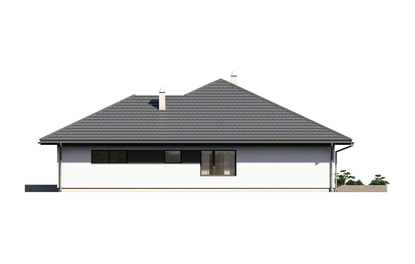 Irysek 7 to parterowy dom jednorodzinny, z dwustanowiskowym garażem. Swoim pełnym programem funkcjonalnym zapewnia komfort i wygodę 4,5-osobowej rodzinie. Przestronna część dzienna to wysoki salon połączony z jadalnią, otwierający się na ogród poprzez ogromne przeszklenie i zadaszony taras. Kuchnia posiada spiżarnię i może być oddzielona od jadalni ścianą lub przesuwnymi drzwiami. Część nocna to 4 wygodne sypialnie, łazienka i pralnia. Dodatkowo główna sypialnia posiada własną garderobę i łazienkę. W domu zaprojektowano dużą kotłownię dostępną z garażu. Część gospodarczą uzupełnia jeszcze dwustanowiskowy garaż. Ten optymalny i ciekawy program funkcjonalny został ujęty w prostej bryle przykrytej wielospadowym dachem. Atutem projektu jest jego prostota zarówno w układzie pomieszczeń, jak i w rozwiązaniach elewacji, gdzie elegancki, nowoczesny styl połączono z delikatnym i subtelnym detalem.