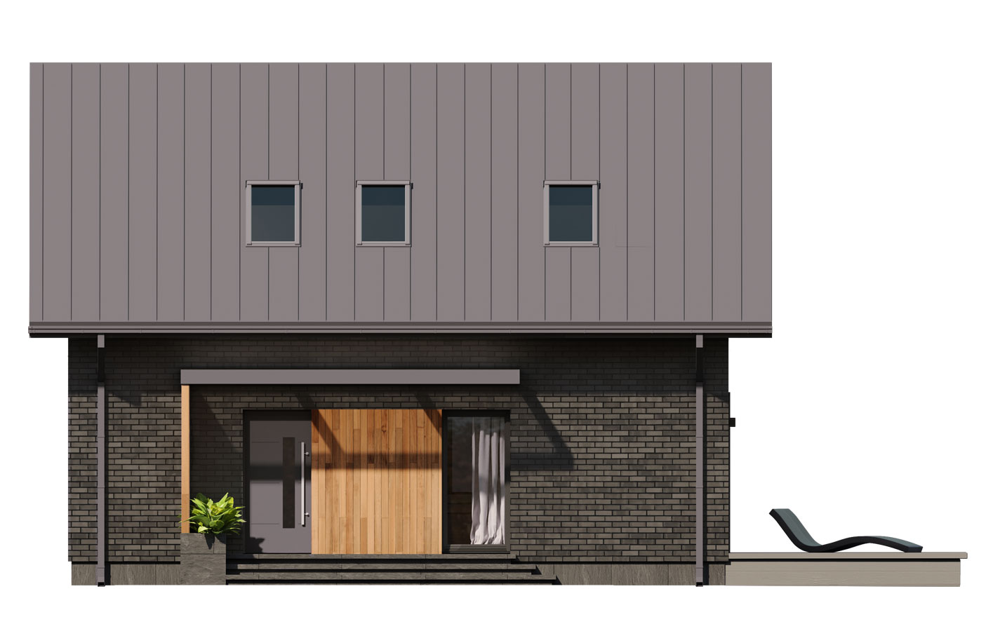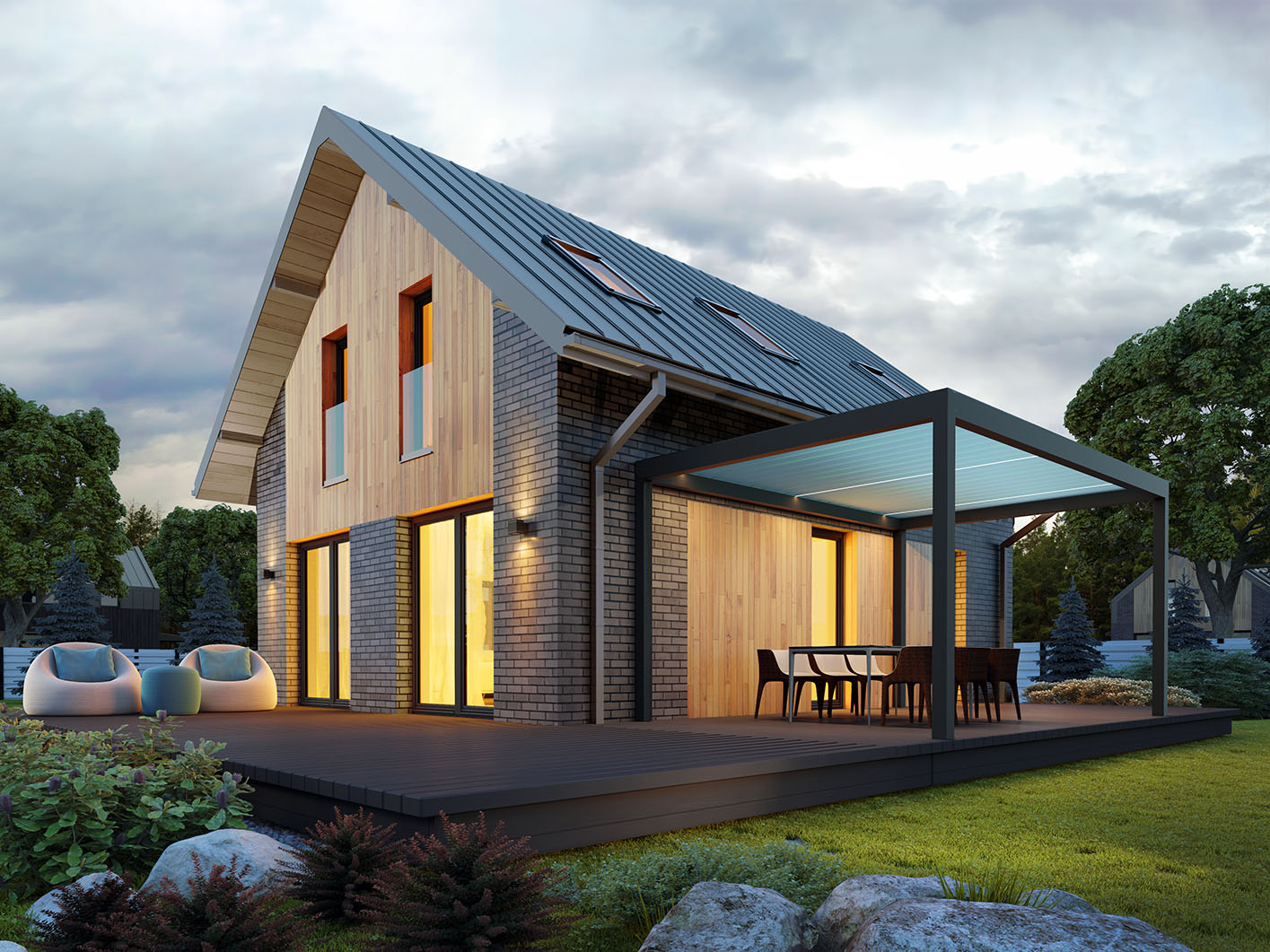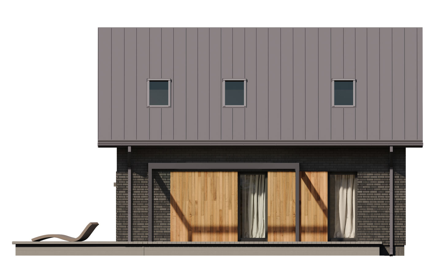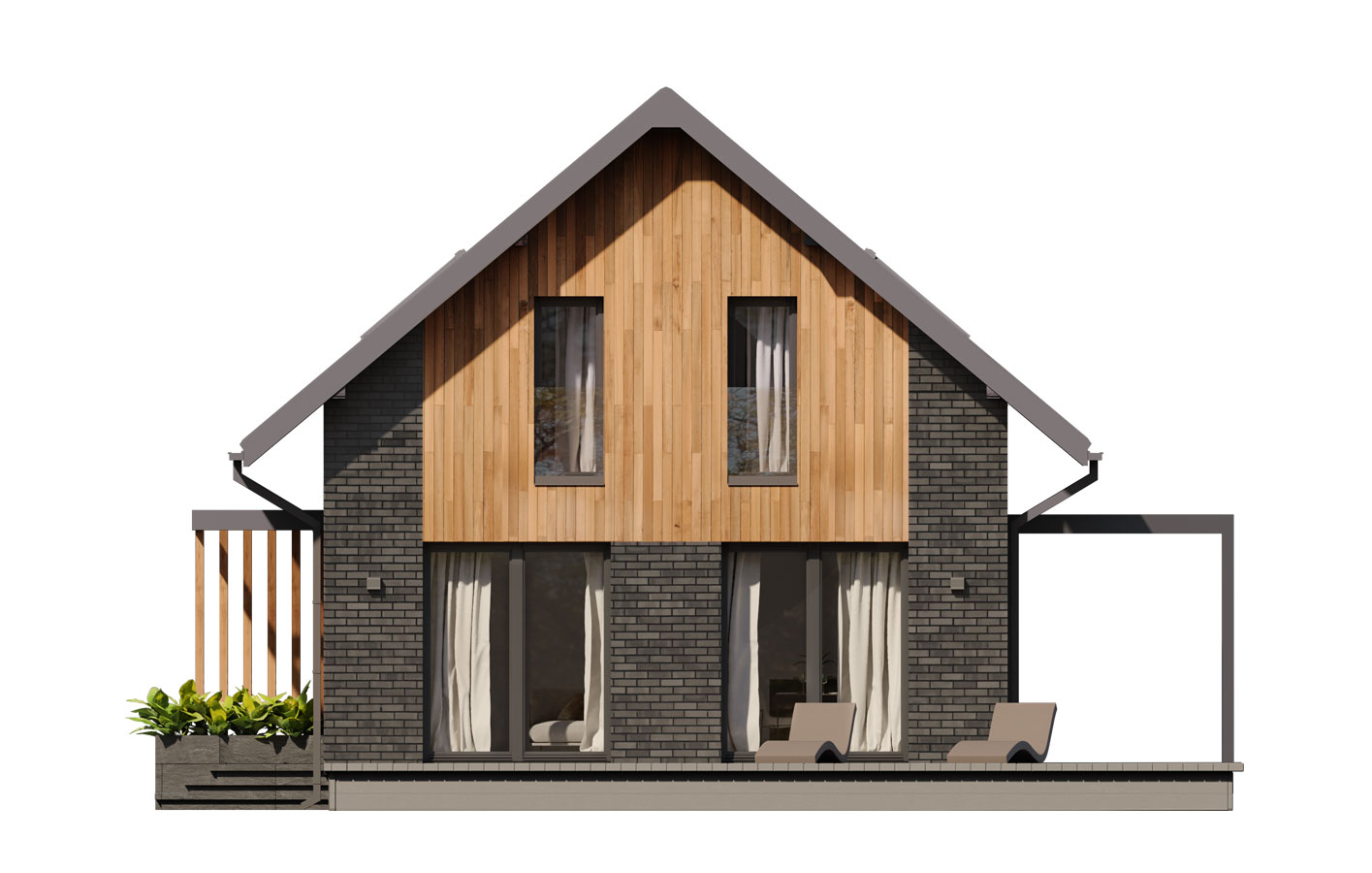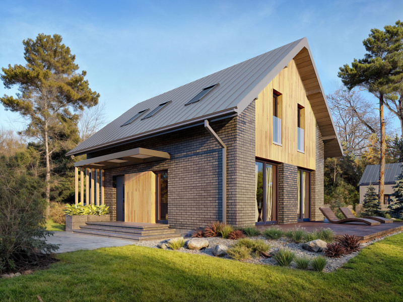 Helen 2 to projekt domu parterowego z użytkowym poddaszem, który wpisuje się w nurt nowoczesnej architektury. Pomimo niewielkich rozmiarów projekt ten zapewni pełen komfort mieszkania nawet 4-osobowej rodzinie. To niewielki dom parterowy o idealnie rozplanowanym układzie funkcjonalnym i nowoczesnym wyglądzie. Minimalistyczna bryła, dwuspadowy, dach oraz powierzchnia użytkowa nie przekraczająca 90 m2 to gwarancja niewielkich kosztów budowy. To projekt nie tylko tani i łatwy w budowie, ale również niezwykle funkcjonalny. Bryła budynku jest na rzucie prostokąta, co pozwala na optymalne wykorzystanie przestrzeni wewnątrz domu, co jest szczególnie ważne w przypadku niewielkich działek. Dom wykończono w nowoczesnym stylu. Uwagę przykuwa blacha na rąbek w kolorze antracytowym oraz ciemna płytka elewacyjna i stolarka, które zestawiono z panelami w kolorze naturalnego drewna. Zastosowane materiały nadają nieco surowego ale również oryginalnego charakteru. Duże, przeszklenia pozwalają na wprowadzenie do wnętrza dużych ilości naturalnego światła, co nie tylko sprawia, że pomieszczenia są jaśniejsze, ale także umożliwia cieszenie się widokiem otaczającego krajobrazu. Pomimo ograniczonej powierzchni użytkowej, układ funkcjonalny został starannie rozplanowany. Parter stanowi strefę dzienną z otwartą przestrzenią salonu, jadalni i kuchni. Otwarta przestrzeń to doskonałe miejsce do wspólnego spędzania czasu z rodziną. Dodatkowy pokój na parterze może pełnić różne funkcje, zależnie od potrzeb mieszkańców. Na parterze przewidziano również łazienkę oraz pomieszczenie gospodarcze, w którym zaprojektowano pompę ciepła. Na poddaszu zaprojektowano trzy funkcjonalne sypialnie, łazienkę oraz pralnię. Optymalne wykorzystanie przestrzeni na poddaszu umożliwia komfortowe warunki dla mieszkańców. Niewątpliwą zaletą projektu jest duży taras zaprojektowany w kształcie litery L. Taras okala dom z dwóch stron, dzięki czemu jest bardziej funkcjonalny. Helen 2 to projekt domu, który posiada powierzchnię zabudowy do 70 m2. Daje to możliwość jego budowy na zgłoszenie. Budowa domu na zgłoszenie to jedno z założeń programu Nowy Polski Ład. Wszystkie projekty, których powierzchnia zabudowy nie przekracza 70 m2 będą mogły być realizowane bez pozwolenia na budowę. Budowa taka nie będzie również wymagała kierownika budowy oraz prowadzenia dziennika budowy. Dom o takich gabarytach to oczywiście niższe koszty zarówno w fazie budowy, jak i w trakcie późniejszej eksploatacji. Mniejsza powierzchnia zabudowy oznacza także możliwość zakupu mniejszej działki, co może wpływać na korzystniejszy wybór lokalizacji. Projekt domu Helen 2 to doskonałe połączenie nowoczesnego designu, funkcjonalności oraz zrównoważonego podejścia do zagadnień budowlanych, co sprawia, że stanowi on atrakcyjną opcję dla tych, którzy cenią sobie komfort życia w mniejszych, nowoczesnych domach.