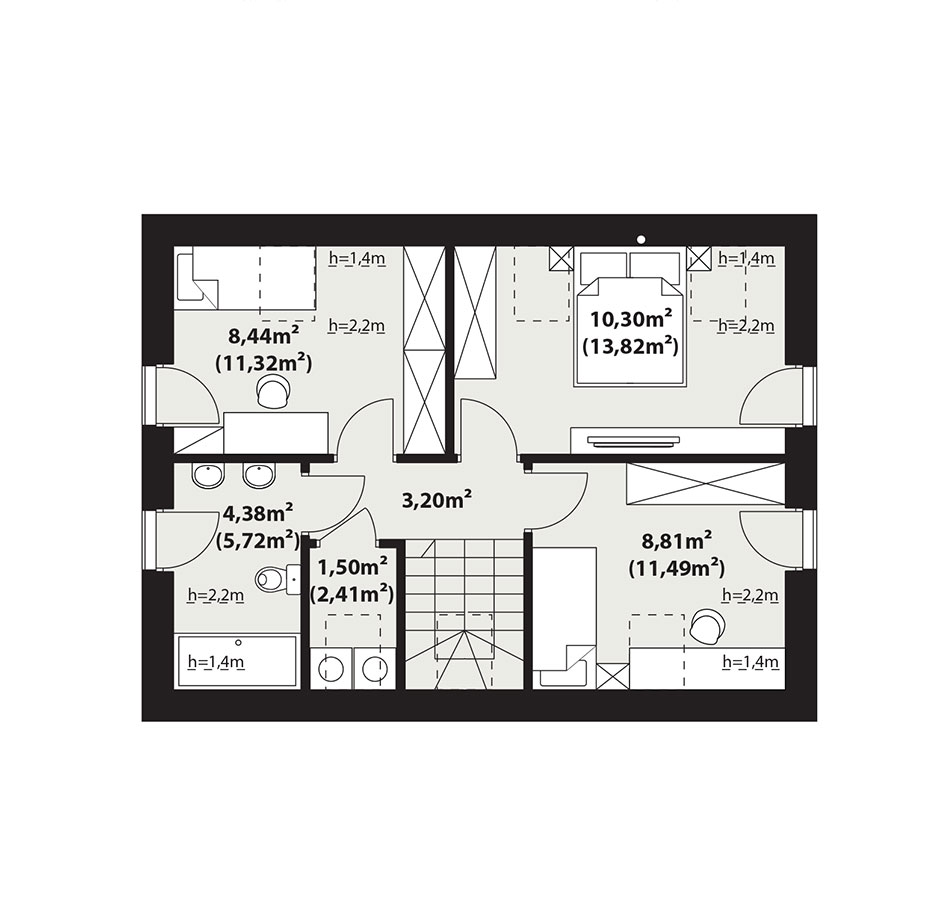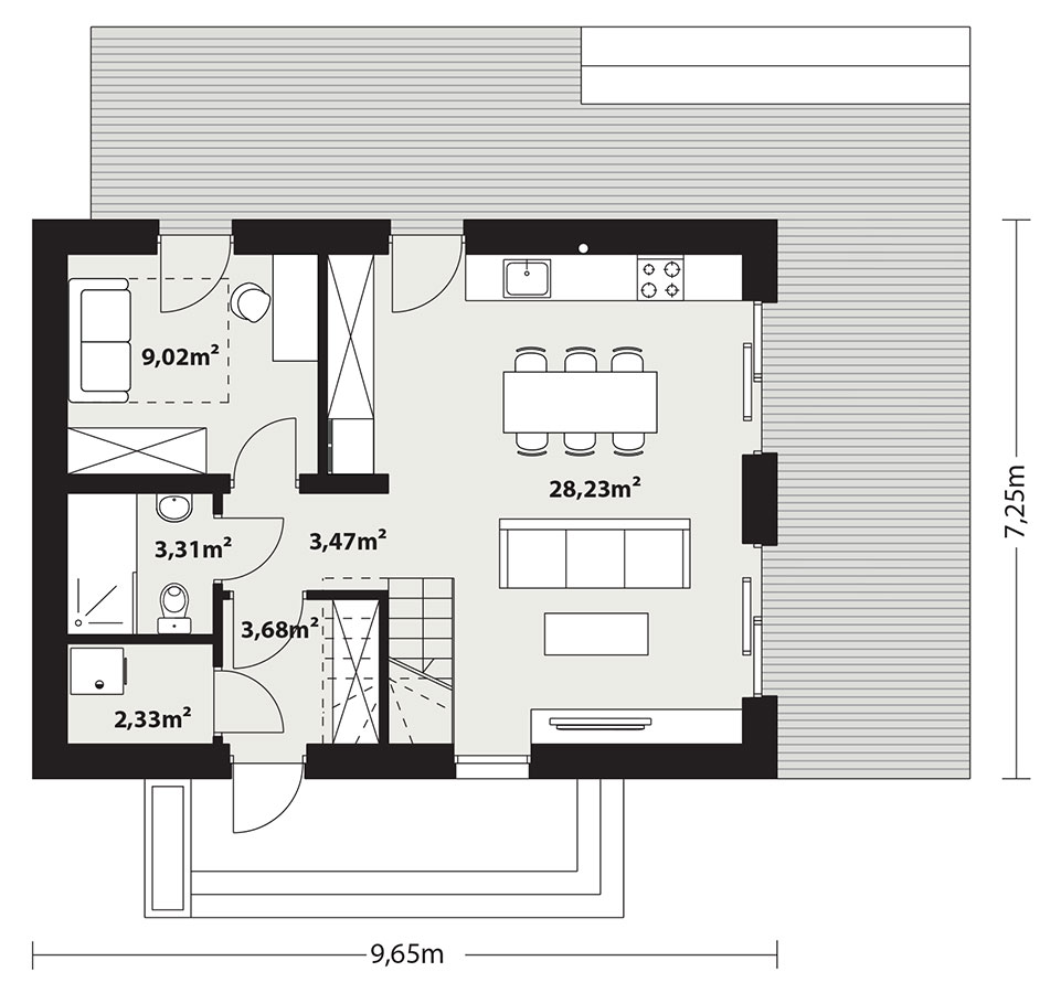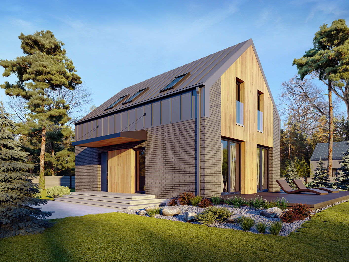 Helen to projekt domu parterowego z użytkowym poddaszem, który wpisuje się w nurt nowoczesnej architektury. Pomimo niewielkich rozmiarów projekt ten zapewni pełen komfort mieszkania nawet 4-osobowej rodzinie. To niewielki dom parterowy o idealnie rozplanowanym układzie funkcjonalnym i nowoczesnym wyglądzie. Minimalistyczna bryła, dwuspadowy, bezokapowy dach oraz powierzchnia użytkowa nie przekraczająca 90 m2 to gwarancja niewielkich kosztów budowy. To projekt nie tylko tani i łatwy w budowie, ale również niezwykle funkcjonalny. Bryła budynku jest na rzucie prostokąta, co pozwala na optymalne wykorzystanie przestrzeni wewnątrz domu, co jest szczególnie ważne w przypadku niewielkich działek. Dom wykończono w nowoczesnym stylu. Uwagę przykuwa blacha na rąbek w kolorze antracytowym oraz ciemna płytka elewacyjna i stolarka, które zestawiono z panelami w kolorze naturalnego drewna. Zastosowane materiały nadają nieco surowego ale również oryginalnego charakteru. Duże, przeszklenia pozwalają na wprowadzenie do wnętrza dużych ilości naturalnego światła, co nie tylko sprawia, że pomieszczenia są jaśniejsze, ale także umożliwia cieszenie się widokiem otaczającego krajobrazu. Pomimo ograniczonej powierzchni użytkowej, układ funkcjonalny został starannie rozplanowany. Parter stanowi strefę dzienną z otwartą przestrzenią salonu, jadalni i kuchni. Otwarta przestrzeń to doskonałe miejsce do wspólnego spędzania czasu z rodziną. Dodatkowy pokój na parterze może pełnić różne funkcje, zależnie od potrzeb mieszkańców. Na parterze przewidziano również łazienkę oraz pomieszczenie gospodarcze, w którym zaprojektowano pompę ciepła. Na poddaszu zaprojektowano trzy funkcjonalne sypialnie, łazienkę oraz pralnię. Optymalne wykorzystanie przestrzeni na poddaszu umożliwia komfortowe warunki dla mieszkańców. Niewątpliwą zaletą projektu jest duży taras zaprojektowany w kształcie litery L. Taras okala dom z dwóch stron, dzięki czemu jest bardziej funkcjonalny. Helen to projekt domu, który posiada powierzchnię zabudowy do 70 m2. Daje to możliwość jego budowy na zgłoszenie. Budowa domu na zgłoszenie to jedno z założeń programu Nowy Polski Ład. Wszystkie projekty, których powierzchnia zabudowy nie przekracza 70 m2 będą mogły być realizowane bez pozwolenia na budowę. Budowa taka nie będzie również wymagała kierownika budowy oraz prowadzenia dziennika budowy. Dom o takich gabarytach to oczywiście niższe koszty zarówno w fazie budowy, jak i w trakcie późniejszej eksploatacji. Mniejsza powierzchnia zabudowy oznacza także możliwość zakupu mniejszej działki, co może wpływać na korzystniejszy wybór lokalizacji. Projekt domu Helen to doskonałe połączenie nowoczesnego designu, funkcjonalności oraz zrównoważonego podejścia do zagadnień budowlanych, co sprawia, że stanowi on atrakcyjną opcję dla tych, którzy cenią sobie komfort życia w mniejszych, nowoczesnych domach.