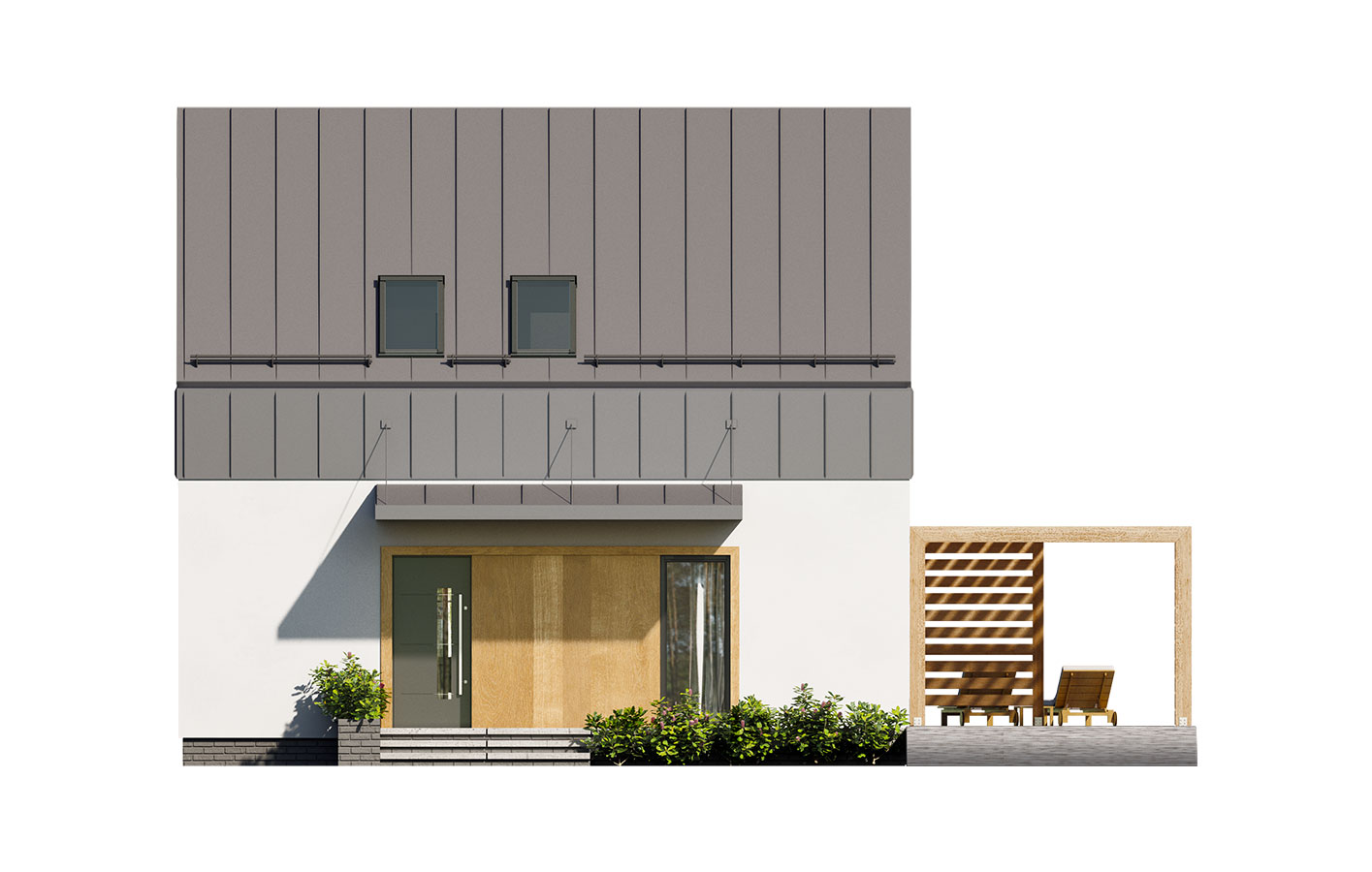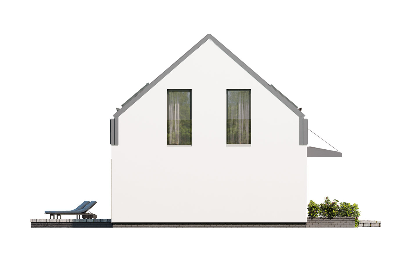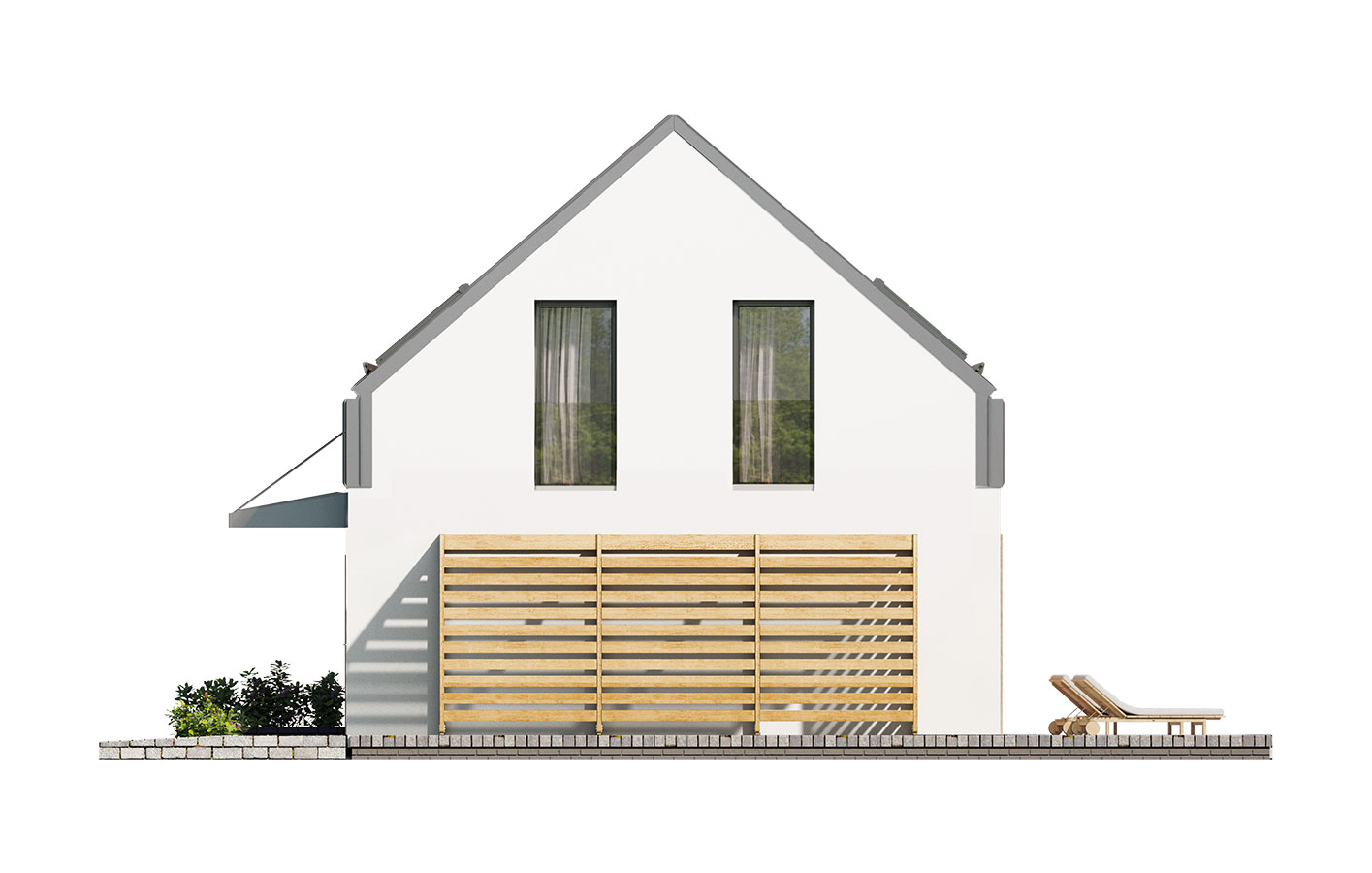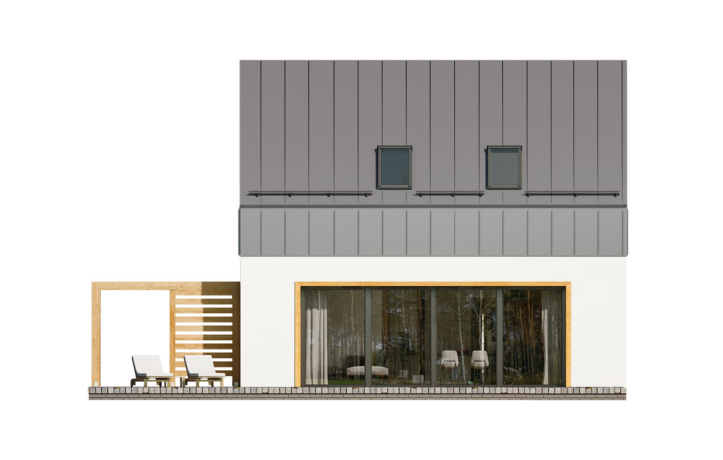 Gabi 2 to projekt niedużego domu parterowego z użytkowym poddaszem, który wpisuje się w nurt nowoczesnej architektury. Pomimo niewielkich rozmiarów projekt ten zapewnia pełen komfort mieszkania nawet 4-osobowej rodzinie. To niewielki dom o idealnie rozplanowanym układzie funkcjonalnym i nowoczesnym wyglądzie. Uwagę przykuwa blacha na rąbek w kolorze antracytowym zestawiona na zasadzie kontrastu z białym tynkiem i ciepłym naturalnym drewnem. Zastosowane materiały nadają oryginalnego charakteru. Duże przeszklenia pozwalają na wprowadzenie do wnętrza dużych ilości naturalnego światła, co nie tylko sprawia, że pomieszczenia są jaśniejsze, ale także umożliwia cieszenie się widokiem otaczającego krajobrazu. Prosta, minimalistyczna bryła na rzucie prostokąta, dwuspadowy, bezokapowy dach oraz powierzchnia zabudowy nie przekraczająca 70m2 to gwarancja niewielkich kosztów budowy. Daje to możliwość jego budowy na zgłoszenie, bez pozwolenia na budowę. Gabi 2 to projekt nie tylko tani i łatwy w budowie, ale również niezwykle funkcjonalny. Pomimo ograniczonej powierzchni użytkowej, układ funkcjonalny został starannie rozplanowany. Parter stanowi strefę dzienną z otwartą przestrzenią salonu, jadalni i kuchni. Otwarta przestrzeń to doskonałe miejsce do wspólnego spędzania czasu z rodziną. Dodatkowy pokój na parterze może pełnić różne funkcje, zależnie od potrzeb mieszkańców. Na parterze przewidziano również łazienkę oraz pomieszczenie gospodarcze, w którym zaprojektowano pompę ciepła. Na poddaszu zaprojektowano trzy funkcjonalne sypialnie, łazienkę oraz pralnię. Optymalne wykorzystanie przestrzeni na poddaszu umożliwia komfortowe warunki dla mieszkańców. Projekt domu Gabi 2 to doskonałe połączenie nowoczesnego designu, funkcjonalności oraz zrównoważonego podejścia do zagadnień budowlanych, co sprawia, że stanowi on atrakcyjną opcję dla tych, którzy cenią sobie komfort życia w mniejszych, nowoczesnych domach.