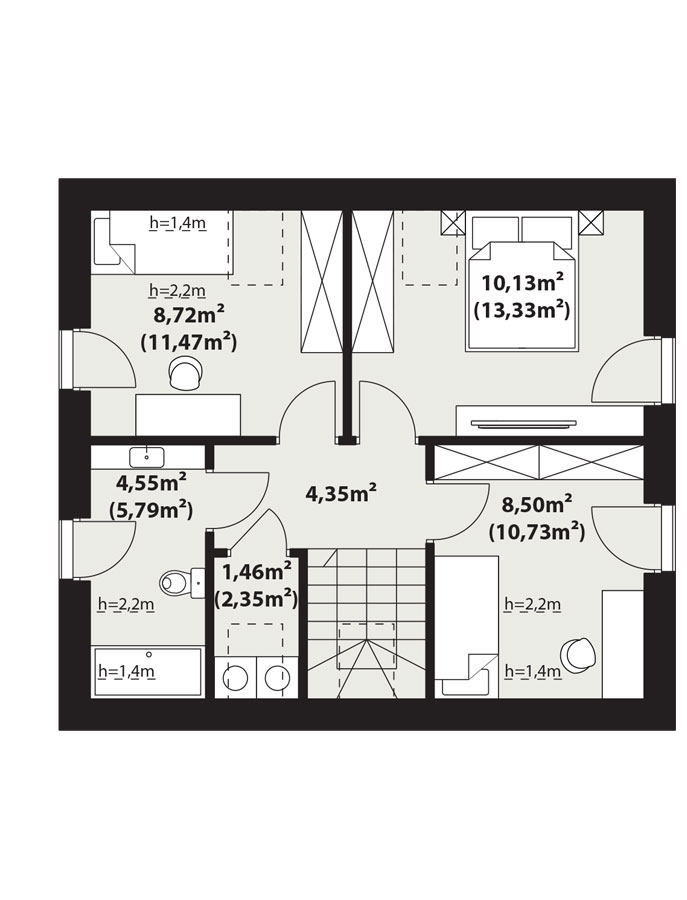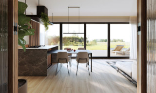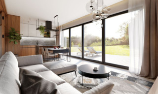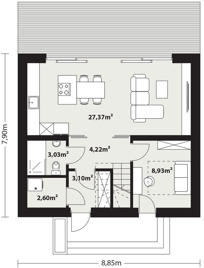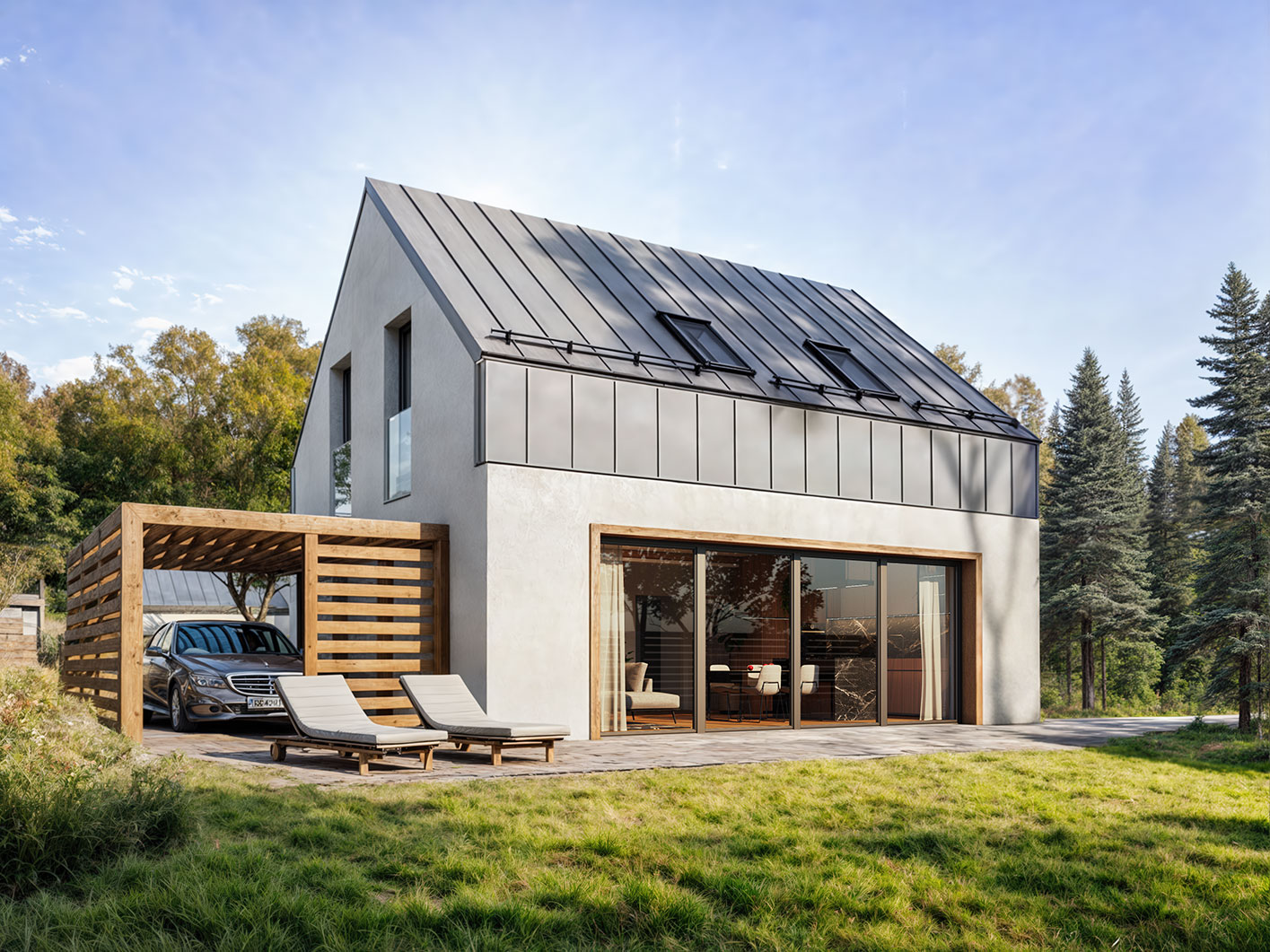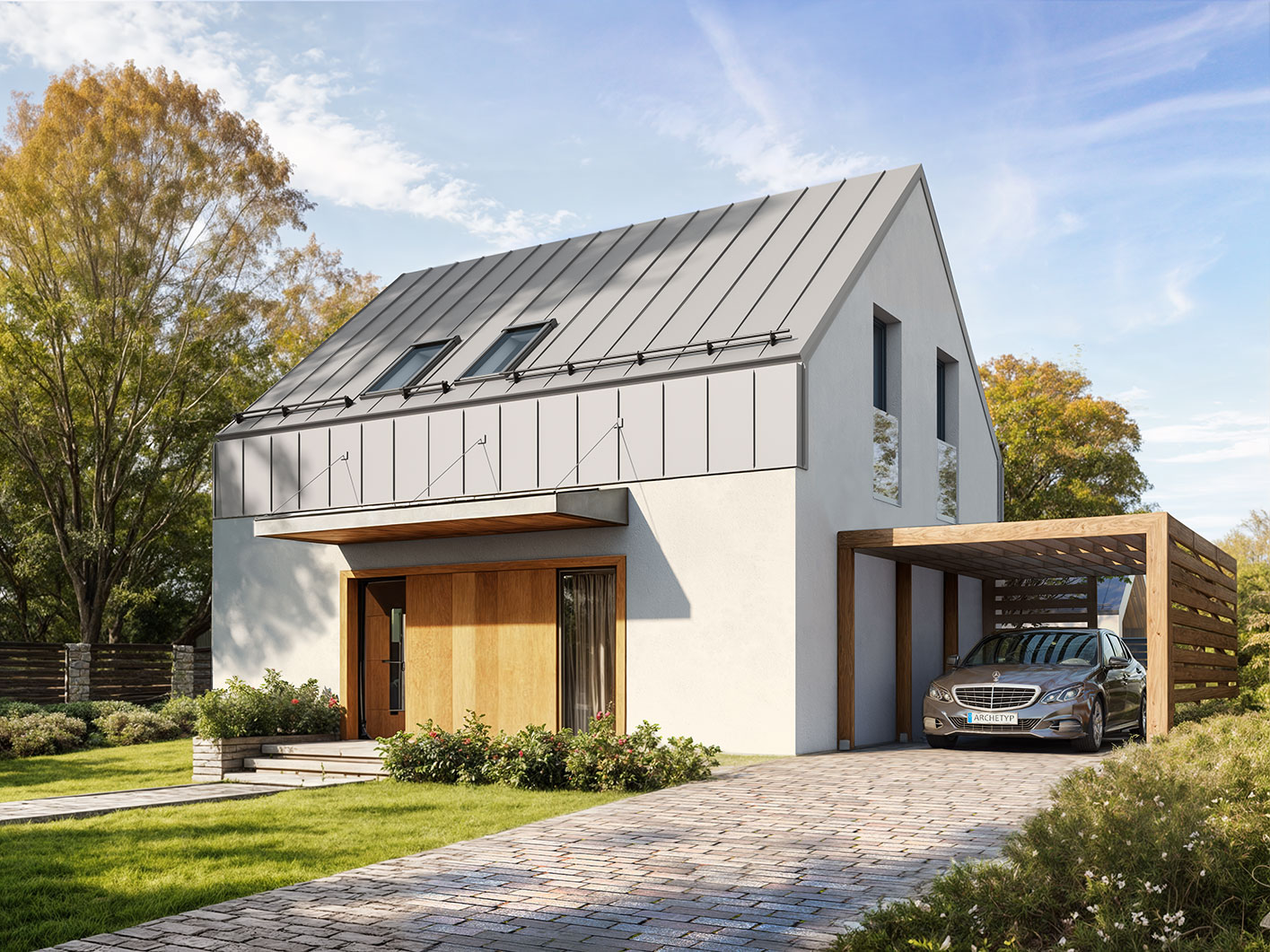 Gabi 2 to projekt niedużego domu parterowego z użytkowym poddaszem, który wpisuje się w nurt nowoczesnej architektury. Pomimo niewielkich rozmiarów projekt ten zapewnia pełen komfort mieszkania nawet 4-osobowej rodzinie. To niewielki dom o idealnie rozplanowanym układzie funkcjonalnym i nowoczesnym wyglądzie. Uwagę przykuwa blacha na rąbek w kolorze antracytowym zestawiona na zasadzie kontrastu z białym tynkiem i ciepłym naturalnym drewnem. Zastosowane materiały nadają oryginalnego charakteru. Duże przeszklenia pozwalają na wprowadzenie do wnętrza dużych ilości naturalnego światła, co nie tylko sprawia, że pomieszczenia są jaśniejsze, ale także umożliwia cieszenie się widokiem otaczającego krajobrazu. Prosta, minimalistyczna bryła na rzucie prostokąta, dwuspadowy, bezokapowy dach oraz powierzchnia zabudowy nie przekraczająca 70m2 to gwarancja niewielkich kosztów budowy. Daje to możliwość jego budowy na zgłoszenie, bez pozwolenia na budowę. Gabi 2 to projekt nie tylko tani i łatwy w budowie, ale również niezwykle funkcjonalny. Pomimo ograniczonej powierzchni użytkowej, układ funkcjonalny został starannie rozplanowany. Parter stanowi strefę dzienną z otwartą przestrzenią salonu, jadalni i kuchni. Otwarta przestrzeń to doskonałe miejsce do wspólnego spędzania czasu z rodziną. Dodatkowy pokój na parterze może pełnić różne funkcje, zależnie od potrzeb mieszkańców. Na parterze przewidziano również łazienkę oraz pomieszczenie gospodarcze, w którym zaprojektowano pompę ciepła. Na poddaszu zaprojektowano trzy funkcjonalne sypialnie, łazienkę oraz pralnię. Optymalne wykorzystanie przestrzeni na poddaszu umożliwia komfortowe warunki dla mieszkańców. Projekt domu Gabi 2 to doskonałe połączenie nowoczesnego designu, funkcjonalności oraz zrównoważonego podejścia do zagadnień budowlanych, co sprawia, że stanowi on atrakcyjną opcję dla tych, którzy cenią sobie komfort życia w mniejszych, nowoczesnych domach.