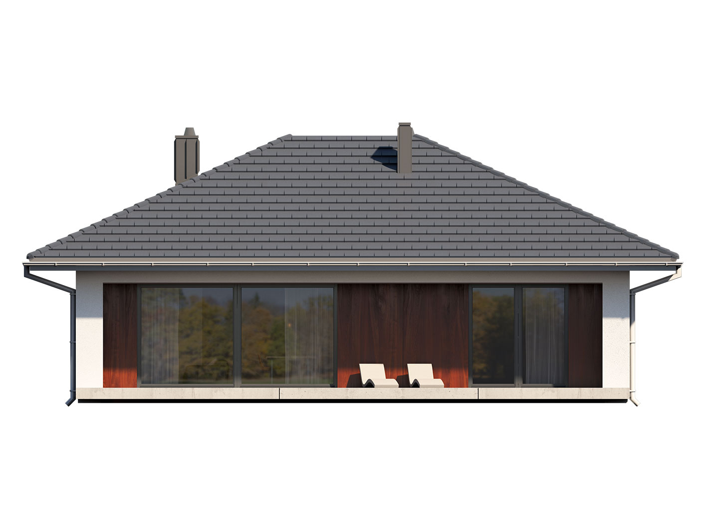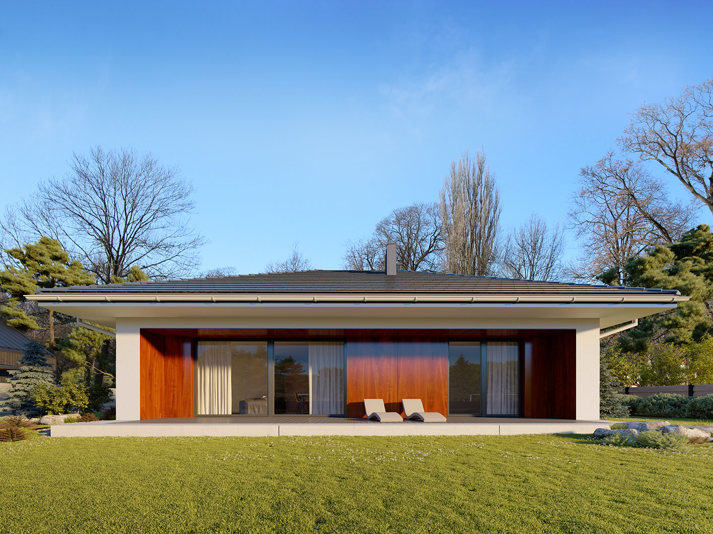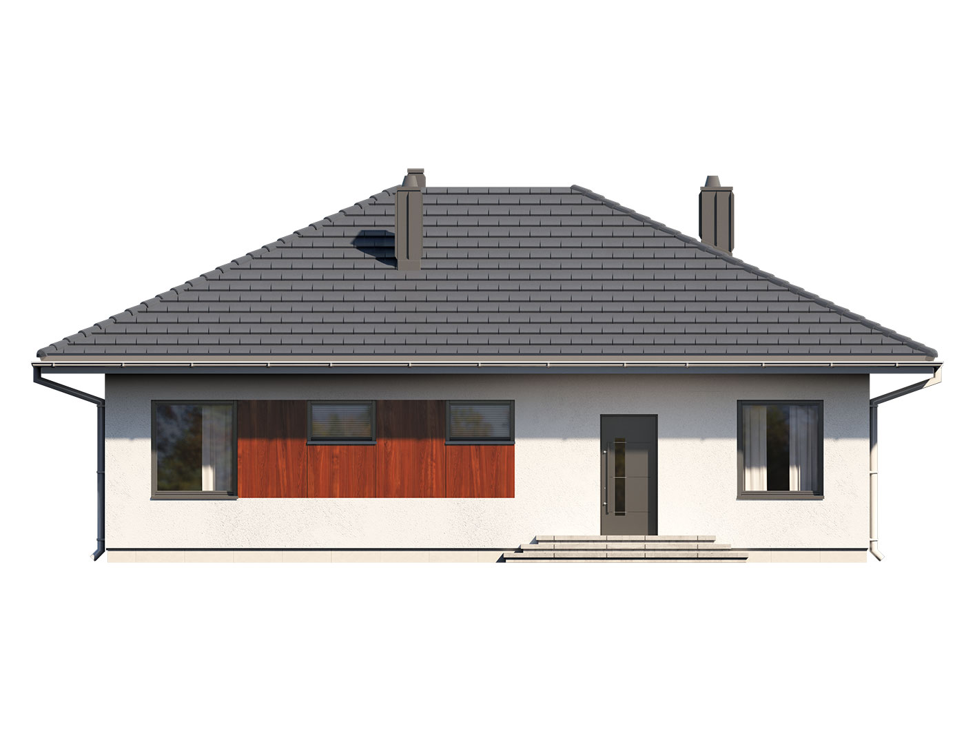 Fino to projekt domu parterowego, który pomimo prostej bryły prezentuje się niezwykle ciekawie. Posiada oryginalnie wykończoną elewację oraz dopracowany w każdym szczególe układ funkcjonalny. Zwarta bryła budynku została zaprojektowana na rzucie prostokąta. Przykryto ją czterospadowym dachem. Na elewacji pojawiła się deska elewacyjna w kolorze naturalnego ciemnego drewna. Dach został pokryty dachówką w grafitowym odcieniu. Kolejnym charakterystycznym elementem są panoramiczne przeszklenia, które sprawiają, że dom nie jest tylko monolityczną bryłą. Duże przeszklenia nie tylko gwarantują piękne widoki na ogród, ale również dobrze doświetlają wnętrze. Duża ilości naturalnego światła jakie wpada do wnętrza pozwala ograniczyć koszty ogrzewania.Fino to parterówka z wyraźnie zaznaczonym podziałem na dwie strefy: dzienną i nocną. Część dzienna to jedna, otwarta przestrzeń z licznymi przeszkleniami. Zaprojektowano tu przestronny salon, w którym pojawiła się wygodna kanapa i stolik z fotelami oraz otwarta kuchnia ze spiżarnią. Autor projektu wygospodarował również miejsce na jadalnię, w której pojawił się duży stół z krzesłami. Strefa nocna to prywatna część mieszkańców. Znalazły się tu trzy wygodne sypialnie oraz dwie łazienki i pralnia.