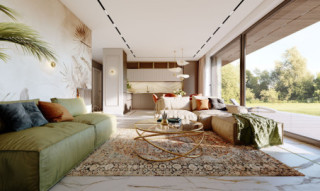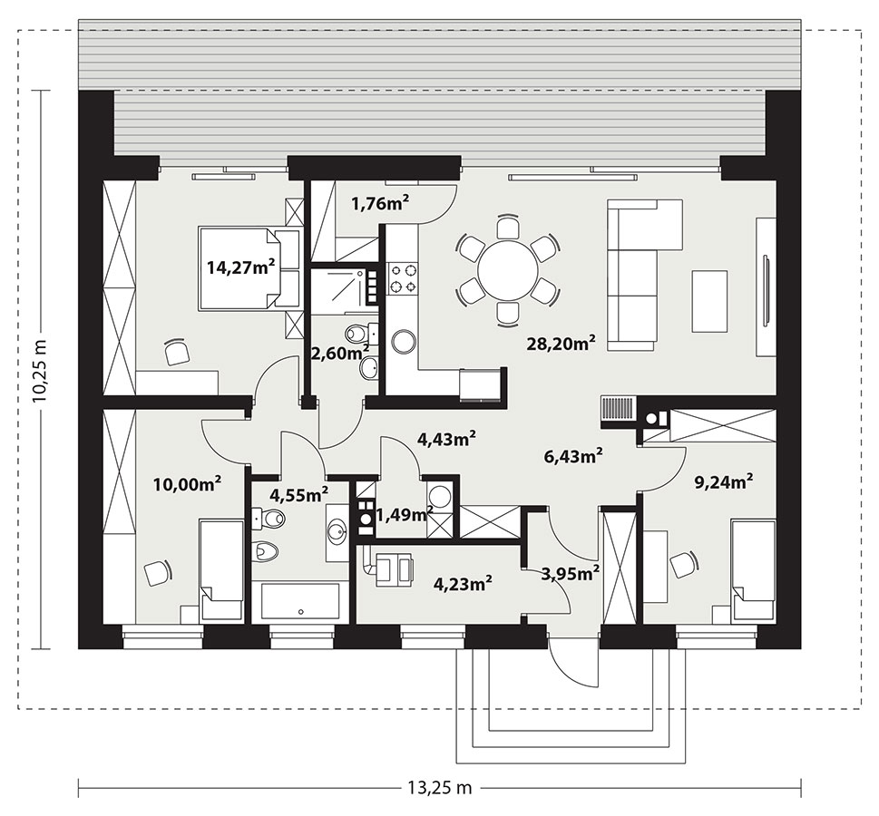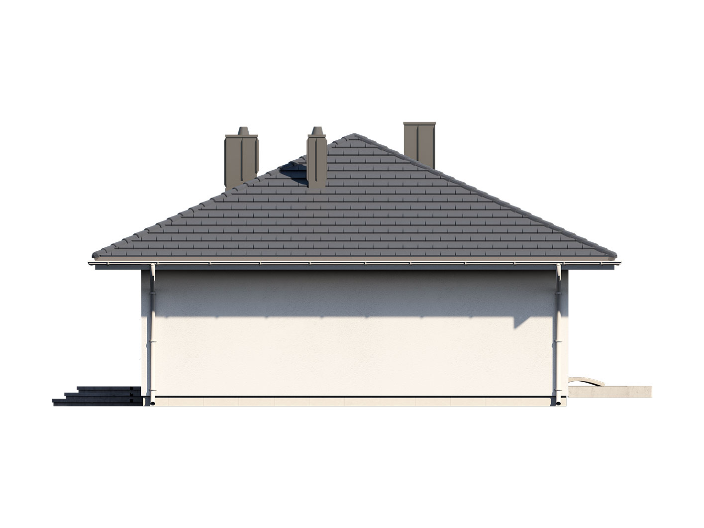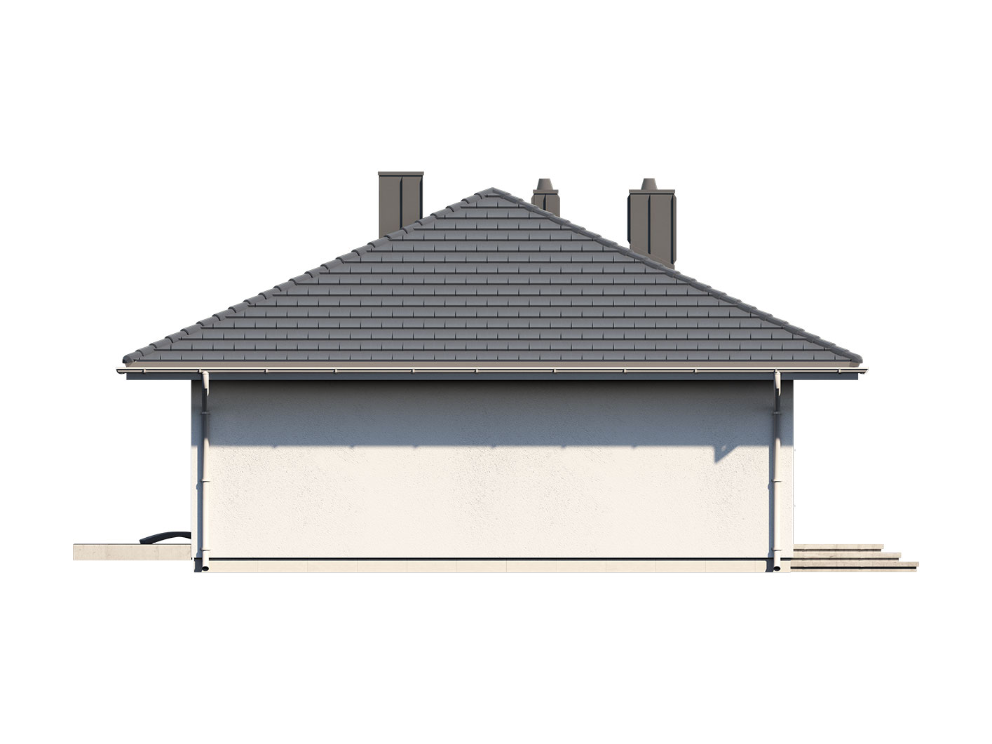 Fino to projekt domu parterowego, który pomimo prostej bryły prezentuje się niezwykle ciekawie. Posiada oryginalnie wykończoną elewację oraz dopracowany w każdym szczególe układ funkcjonalny. Zwarta bryła budynku została zaprojektowana na rzucie prostokąta. Przykryto ją czterospadowym dachem. Na elewacji pojawiła się deska elewacyjna w kolorze naturalnego ciemnego drewna. Dach został pokryty dachówką w grafitowym odcieniu. Kolejnym charakterystycznym elementem są panoramiczne przeszklenia, które sprawiają, że dom nie jest tylko monolityczną bryłą. Duże przeszklenia nie tylko gwarantują piękne widoki na ogród, ale również dobrze doświetlają wnętrze. Duża ilości naturalnego światła jakie wpada do wnętrza pozwala ograniczyć koszty ogrzewania.Fino to parterówka z wyraźnie zaznaczonym podziałem na dwie strefy: dzienną i nocną. Część dzienna to jedna, otwarta przestrzeń z licznymi przeszkleniami. Zaprojektowano tu przestronny salon, w którym pojawiła się wygodna kanapa i stolik z fotelami oraz otwarta kuchnia ze spiżarnią. Autor projektu wygospodarował również miejsce na jadalnię, w której pojawił się duży stół z krzesłami. Strefa nocna to prywatna część mieszkańców. Znalazły się tu trzy wygodne sypialnie oraz dwie łazienki i pralnia.