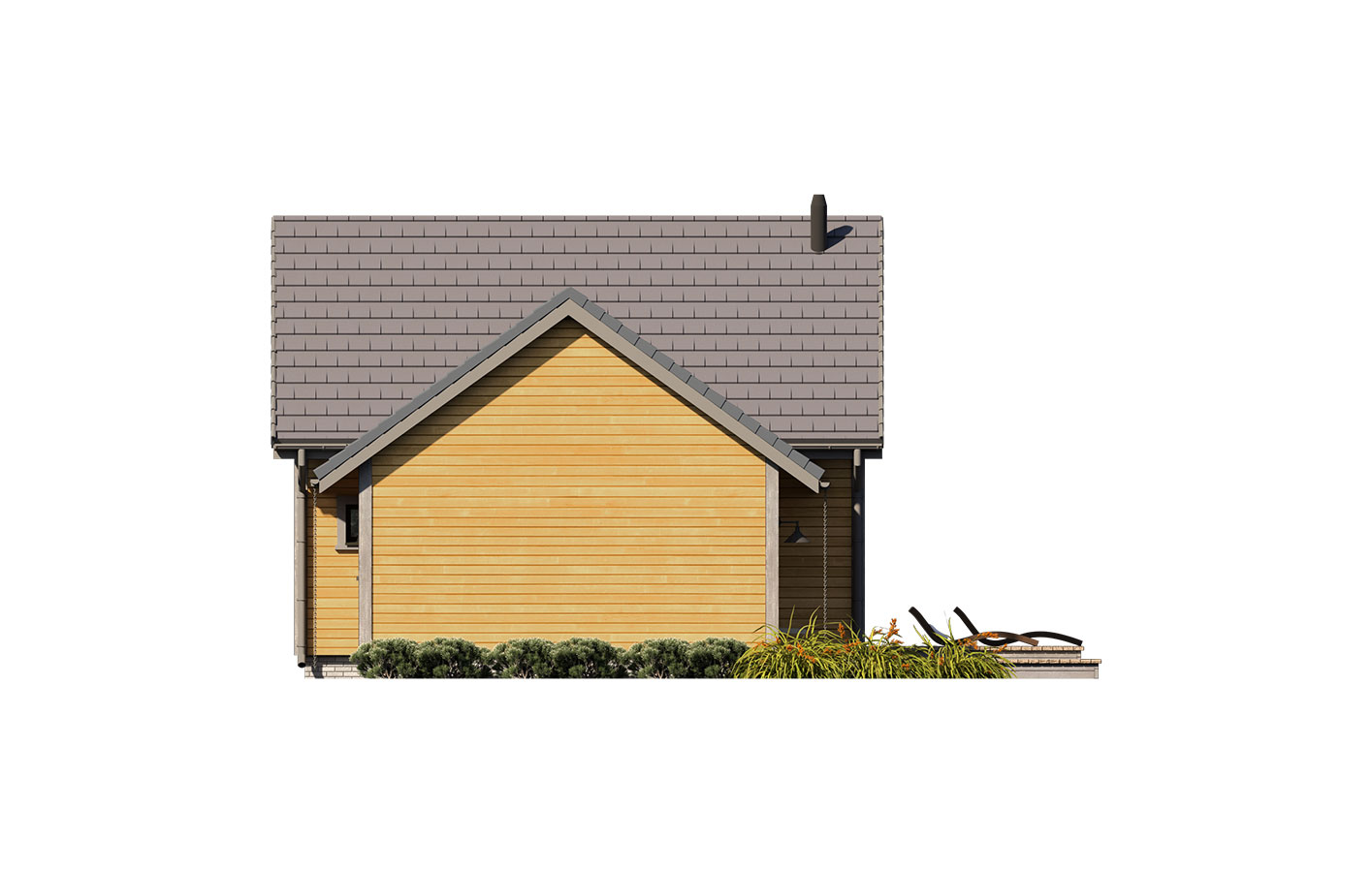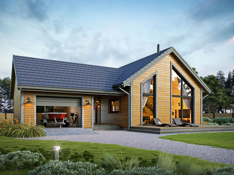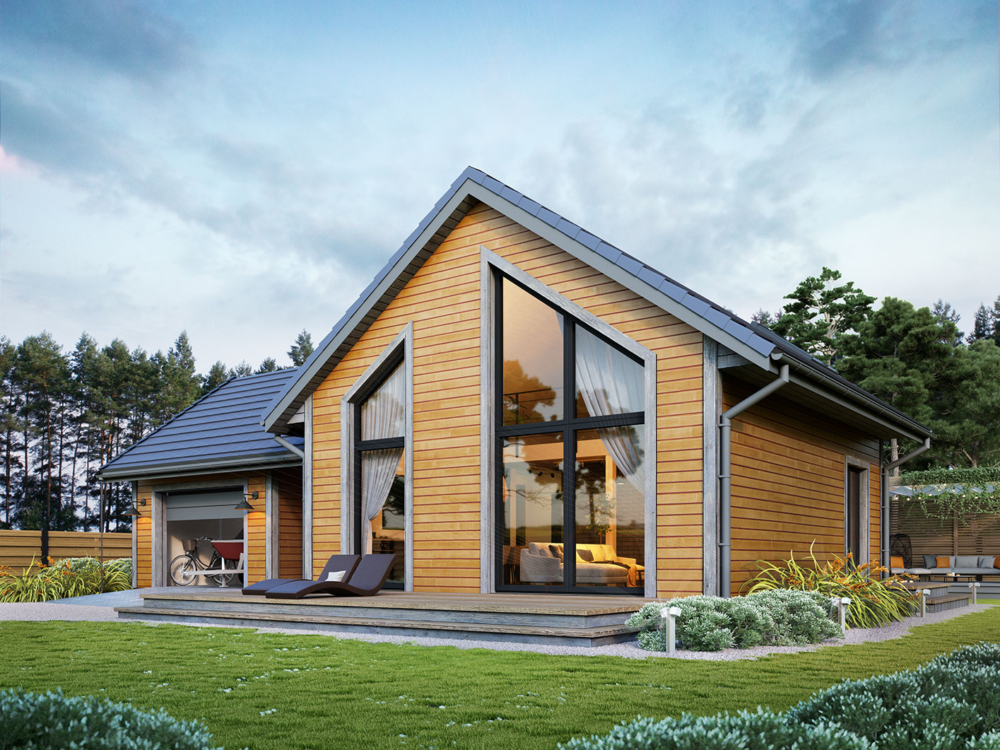 Erna 4 drewniana to niewielki dom jednorodzinny lub letniskowy z garażem. Posiada sypialnię na parterze oraz otwartą część dzienną z antresolą na której jest dodatkowa przestrzeń do dowolnej aranżacji. Dom posiada duże przeszklenie w ścianie szczytowej z wyjściem na taras. Standardowo dom wyposażony jest w pompę ciepła oraz kominek.