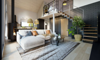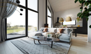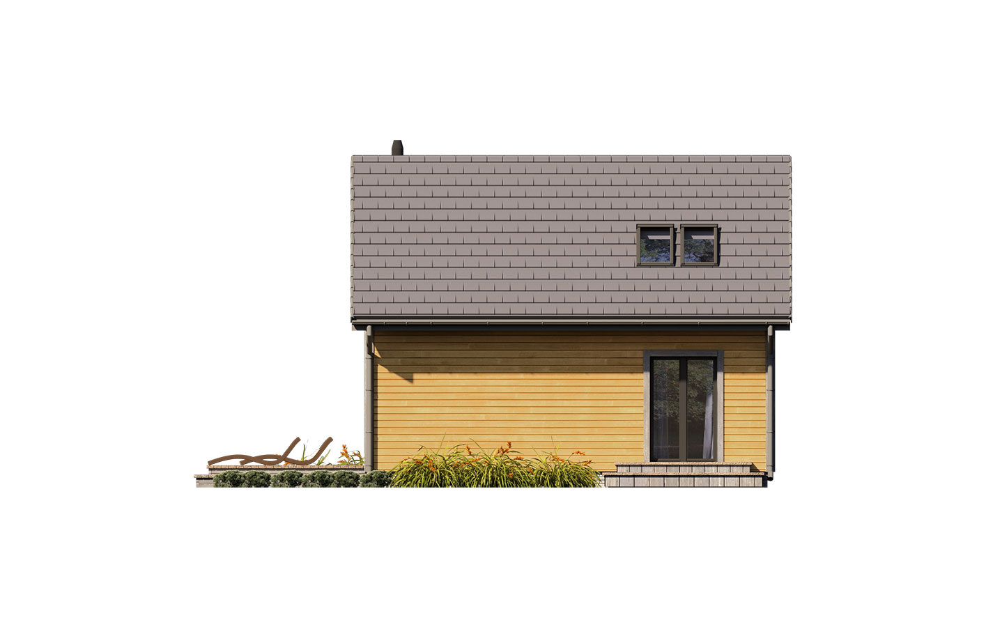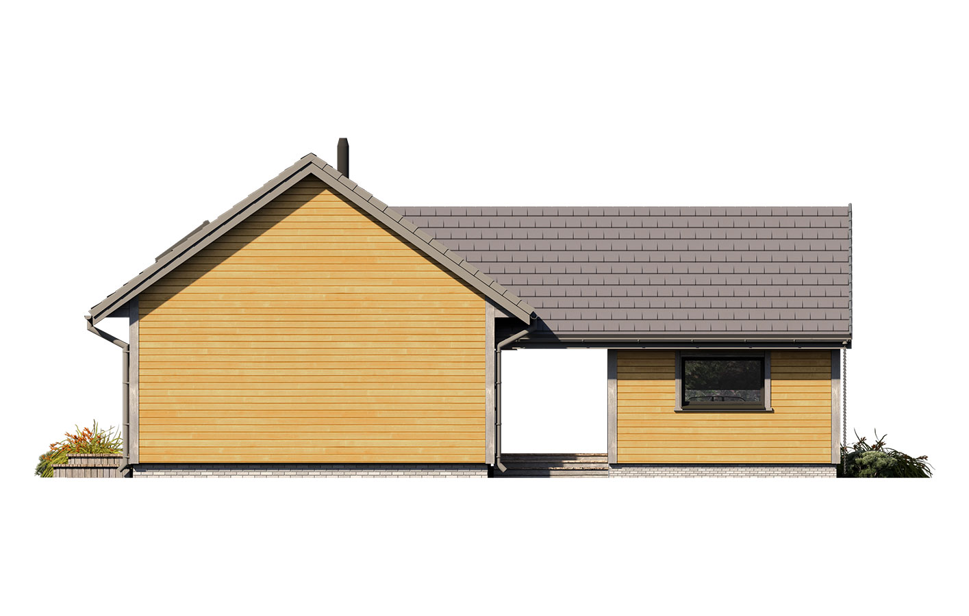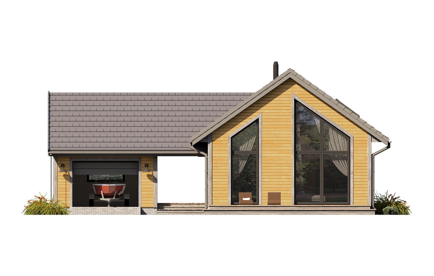 Erna 4 drewniana to niewielki dom jednorodzinny lub letniskowy z garażem. Posiada sypialnię na parterze oraz otwartą część dzienną z antresolą na której jest dodatkowa przestrzeń do dowolnej aranżacji. Dom posiada duże przeszklenie w ścianie szczytowej z wyjściem na taras. Standardowo dom wyposażony jest w pompę ciepła oraz kominek.