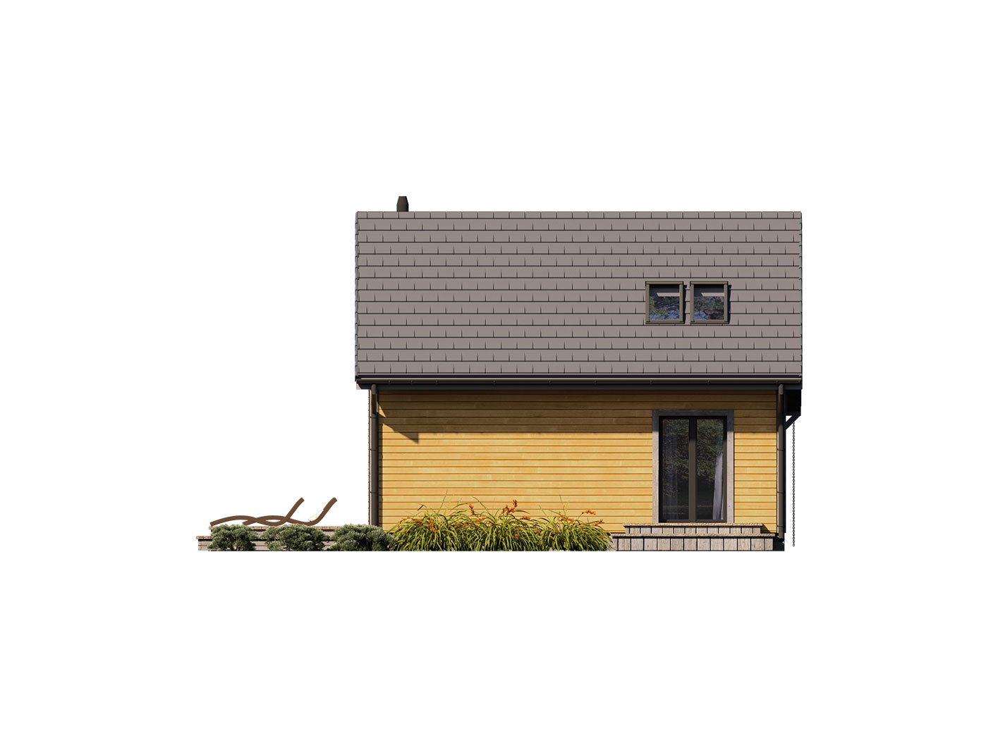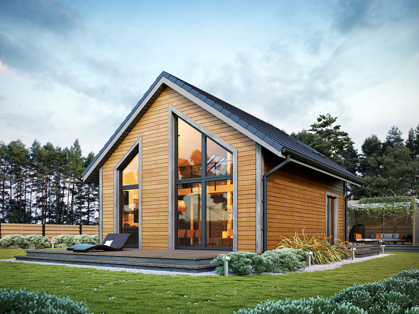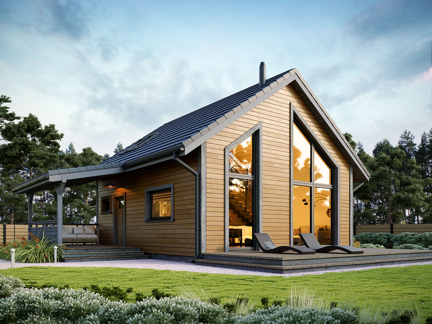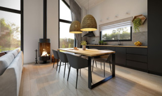 Erna 3 drewniana to niewielki dom jednorodzinny lub letniskowy. Posiada sypialnię na parterze oraz otwartą część dzienną z antresolą na której jest dodatkowa przestrzeń do dowolnej aranżacji. Dzięki powierzchni zabudowy 69,5 m2, może być budowany na zgłoszenie. Dom posiada duże przeszklenie w ścianie szczytowej a wejście jest przez zadaszony taras z boku domu co pozwala sytuować dom również na działkach z wejściem od południa. Standardowo dom wyposażony jest w pompę ciepła oraz kominek.