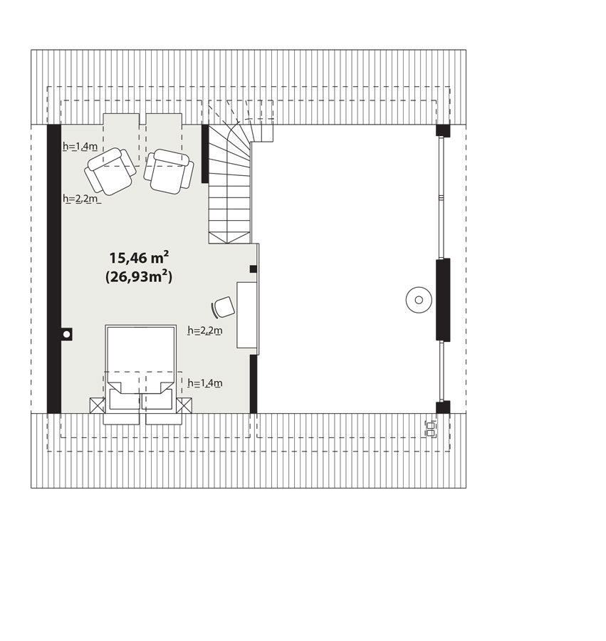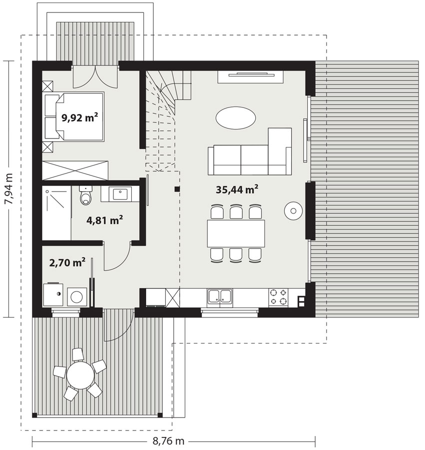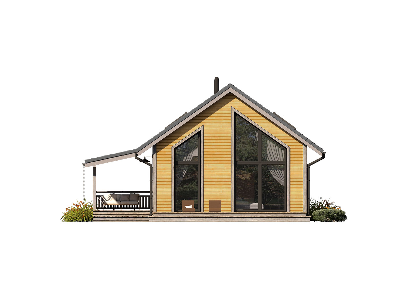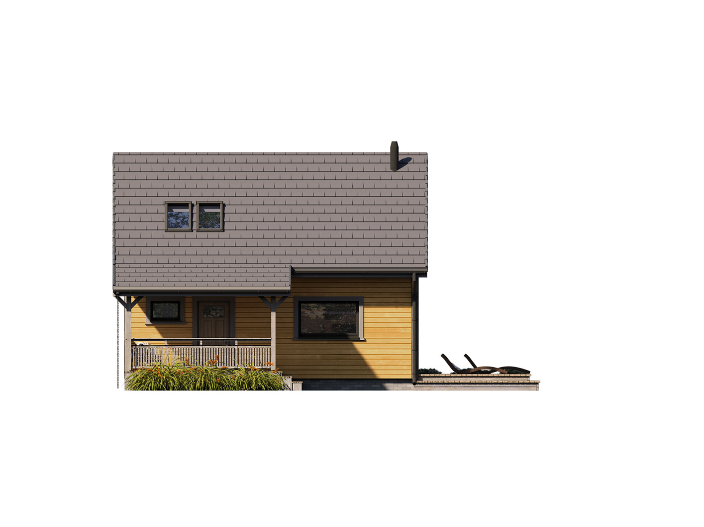 Erna 3 drewniana to niewielki dom jednorodzinny lub letniskowy. Posiada sypialnię na parterze oraz otwartą część dzienną z antresolą na której jest dodatkowa przestrzeń do dowolnej aranżacji. Dzięki powierzchni zabudowy 69,5 m2, może być budowany na zgłoszenie. Dom posiada duże przeszklenie w ścianie szczytowej a wejście jest przez zadaszony taras z boku domu co pozwala sytuować dom również na działkach z wejściem od południa. Standardowo dom wyposażony jest w pompę ciepła oraz kominek.