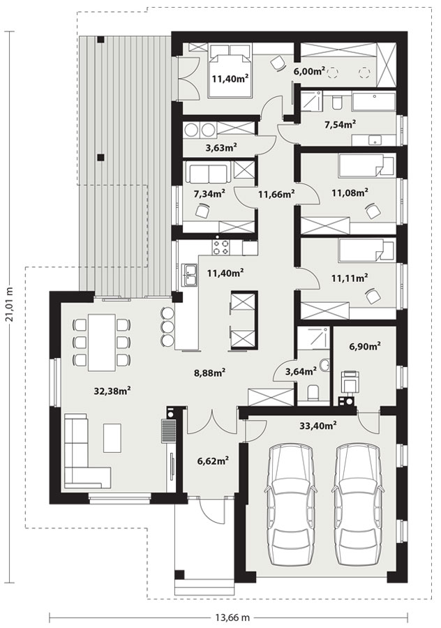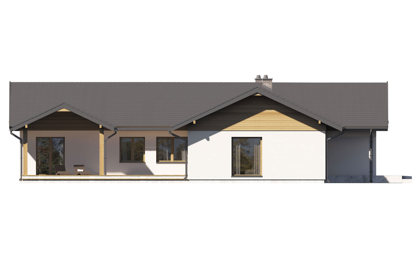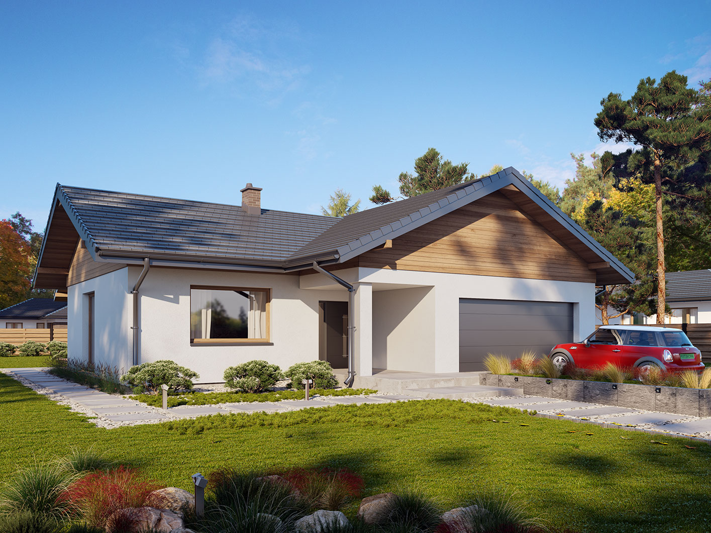 Della 2 to parterowy dom jednorodzinny z dwustanowiskowym garażem. Swoim pełnym programem funkcjonalnym zapewnia komfort i wygodę nawet 5-osobowej rodzinie. Przestronna część dzienna to salon z jadalnią otwierający się na ogród oraz częściowo otwartra kuchnia. Część nocna to 3 wygodne sypialnie, gabinet i łazienka. Dodatkowo główna sypialnia posiada własną garderobę. W domu zaprojektowano dużą kotłownię dostępną z garażu, której parametry pozwalają na montaż kotła na każdy rodzaj paliwa, w tym na paliwo stałe. Część gospodarczą uzupełnia jeszcze pralnia i dwustanowiskowy garaż. Ten optymalny i ciekawy program funkcjonalny został ujęty w tradycyjnej bryle przykrytej wielospadowym dachem.