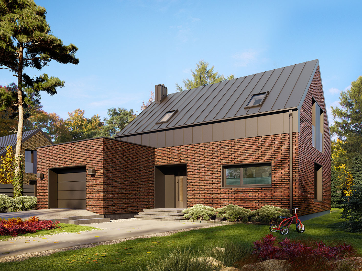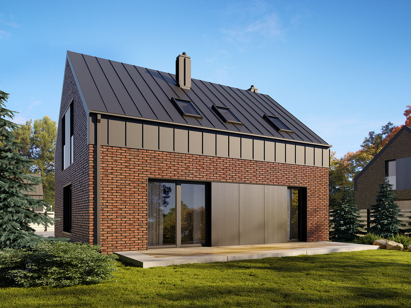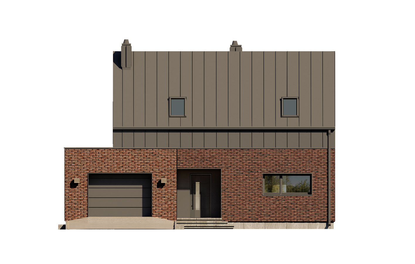 Projekt Pulio 2 to prosty dom parterowy z użytkowym poddaszem o nowoczesnej formie i funkcjonalnych, przestronnych wnętrzach. Z pewnością spodoba się osobom preferującym nietuzinkowe rozwiązania i zafascynowanym nowoczesną architekturą. Prosta bryła budynku na rzucie prostokąta z dwuspadowym, bezokapowym dachem została urozmaicona przeszkleniami nadającym lekkości. Wyrafinowana stylistyka została osiągnięta poprzez subtelny detal oraz kontrast dwóch materiałów - antracytowej blachy i tynku w tym samym kolorze oraz płytki elewacyjnej imitującej cegłę. Bardzo funkcjonalny układ pomieszczeń zapewnia optymalny komfort 4-osobowej rodzinie. Na parterze zaprojektowano kuchnię ze spiżarnią, salon, kotłownię, łazienkę oraz garaż. Atutem tego projektu, przy tak niewielkiej powierzchni użytkowej jest dodatkowy pokój na parterze, który może pełnić rolę gabinetu. Na poddaszu przewidziano 3 sypialnie oraz łazienkę i pralnię. Elegancki styl tego budynku uzyskano poprzez połączenie klasycznej bryły domu jednorodzinnego z nowoczesnymi elewacjami i materiałami.