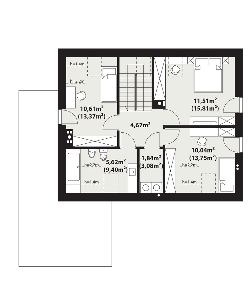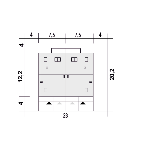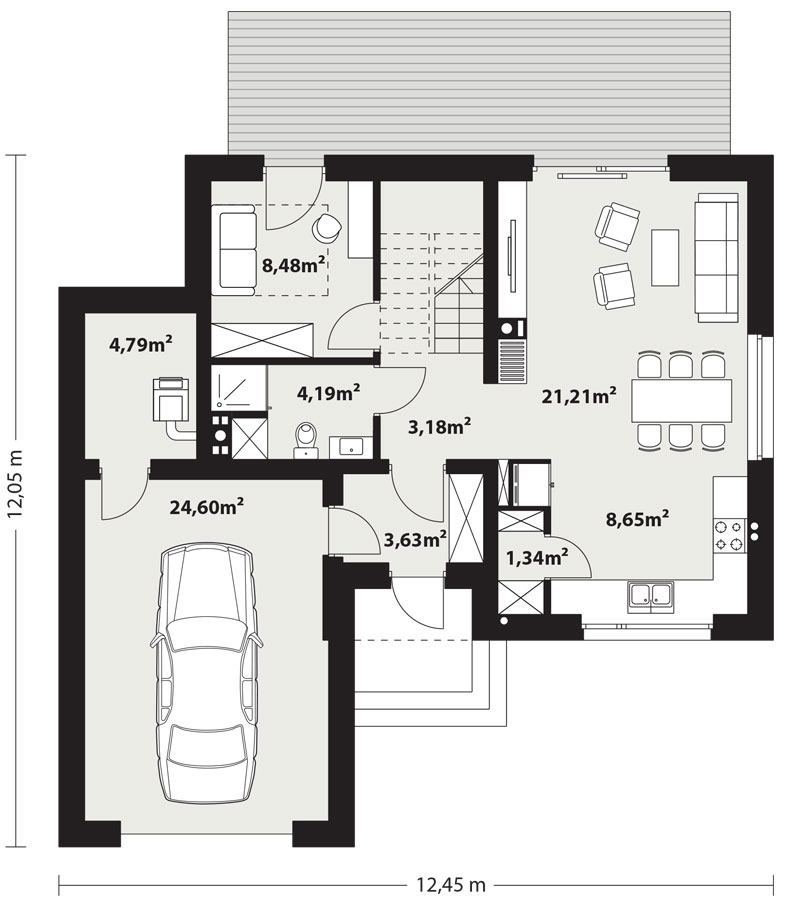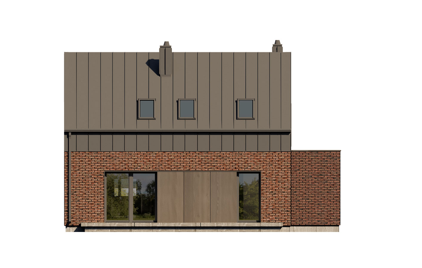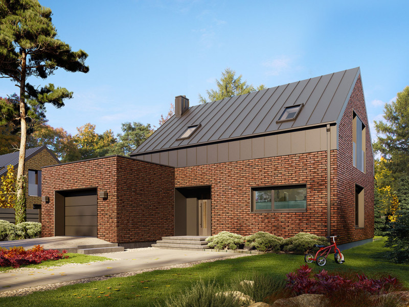 Projekt Pulio 2 to prosty dom parterowy z użytkowym poddaszem o nowoczesnej formie i funkcjonalnych, przestronnych wnętrzach. Z pewnością spodoba się osobom preferującym nietuzinkowe rozwiązania i zafascynowanym nowoczesną architekturą. Prosta bryła budynku na rzucie prostokąta z dwuspadowym, bezokapowym dachem została urozmaicona przeszkleniami nadającym lekkości. Wyrafinowana stylistyka została osiągnięta poprzez subtelny detal oraz kontrast dwóch materiałów - antracytowej blachy i tynku w tym samym kolorze oraz płytki elewacyjnej imitującej cegłę. Bardzo funkcjonalny układ pomieszczeń zapewnia optymalny komfort 4-osobowej rodzinie. Na parterze zaprojektowano kuchnię ze spiżarnią, salon, kotłownię, łazienkę oraz garaż. Atutem tego projektu, przy tak niewielkiej powierzchni użytkowej jest dodatkowy pokój na parterze, który może pełnić rolę gabinetu. Na poddaszu przewidziano 3 sypialnie oraz łazienkę i pralnię. Elegancki styl tego budynku uzyskano poprzez połączenie klasycznej bryły domu jednorodzinnego z nowoczesnymi elewacjami i materiałami.