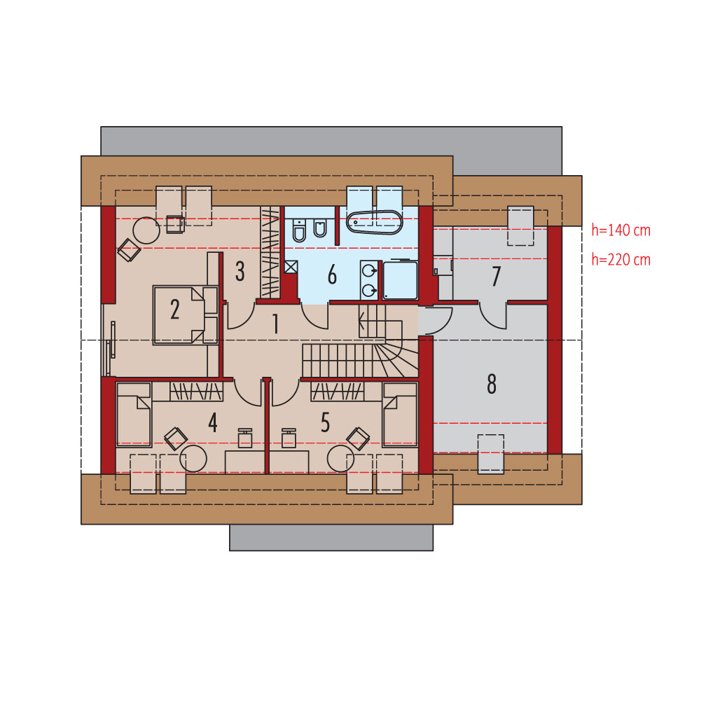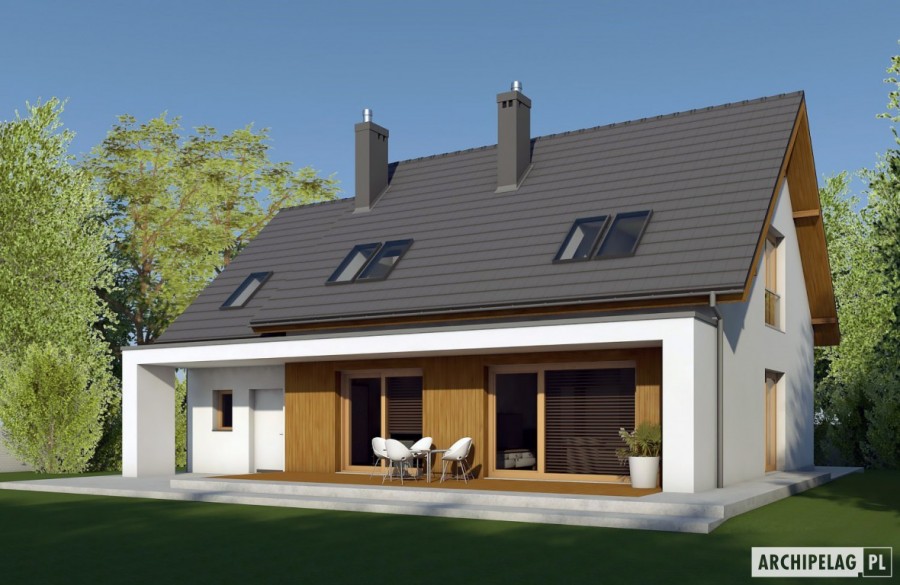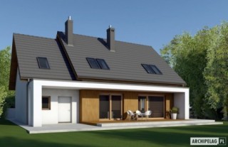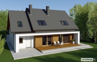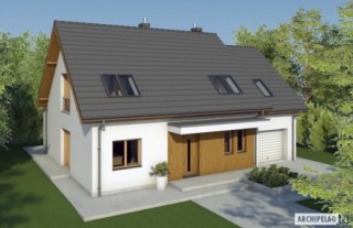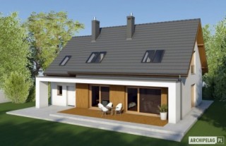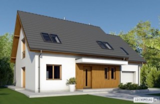 Charakterystyka: Dom parterowy z poddaszem użytkowym, niepodpiwniczony, z garażem jednostanowiskowymPrzeznaczenie: Dom dla 3-4-osobowej rodziny Technologia i konstrukcja:Ściany zewnętrzne: murowane, dwuwarstwowe, beton komórkowy firmy Solbet 24 cm, ocieplenie wełna mineralna typ Fasoterm 35 firmy Isover 20 cmŚciany wewnętrzne: nośne i działowe murowane, beton komórkowy firmy Solbet 24 cm i 12 cmStrop: międzypiętrowy gęstożebrowy Teriva, ocieplenie wełna mineralna firmy Isover 30 cmDach: konstrukcja drewniana, ocieplenie wełna mineralna Isover 30 cm, dachówka ceramiczna płaska Bergamo firmy Röben,Schody: schody wewnętrzne drewnianeInne: Dom spełnia standardy Grupy Saint-Gobain; Marka Isover, Rigips i Weber zapewniają najwyższą jakość wbudowanych produktów: systemy ociepleń, okładziny ścienne i sufitowe, paroizolacje, systemy podłogowe, zaprawy, kleje, hydroizolacjeRozwiązania instalacyjne:Ogrzewanie: kocioł gazowy kondensacyjny firmy Viessmann, rozprowadzenie ciepła: grzejniki firmy PurmoWentylacja: grawitacyjnaOZE: kolektory słoneczne firmy ViessmannDodatkowo: stacja uzdatniania wody firmy Viessmann Wykończenie:Elewacje: tynk cienkowarstwowy mineralny w kolorze białym TO-PA 001 z palety firmy Termo Organika Weber, okładzina - system elewacji wentylowanej: deski włóknocementowe Cedral w kolorze CL104Stolarka: drewniana, PVC lub aluminiowa, drzwi tarasowe podnoszono-przesuwne typu HS aluminiowo-drewniane Innowiev firmy Fakro, drzwi wejściowe i brama garażowa firmy Hörmann, rolety zewnętrzne w systemie QuadBox firmy BeCleverOkna połaciowe: rozwiązania technologiczne i wyłaz dachowy firmy FakroOtoczenie: kostka betonowa i płyty tarasowe firmy Libet, system tarasowy ProDeck - deska kompozytowa Terra w kolorze orzech, meble ogrodowe firmy B&B Italia Wersje domów w serii Iga – zapytaj o dostępność:- Iga II G1 – wersja podstawowa, standardowe instalacje: kocioł gazowy kondensacyjny, wentylacja grawitacyjna, dom z rozwiązaniami materiałowo-technologicznymi Grupy Saint-Gobain- IGA III G1 ENERGO PLUS reco - instalacje energooszczędne firmy Vaillant: pompa ciepła, wentylacja mechaniczna z rekuperacją, system fotowoltaiczny oraz ogrzewanie podłogowe firmy Purmo, podobny układ funkcjonalny, inne wykończenie elewacji, dom z rozwiązaniami materiałowo-technologicznymi Grupy Saint-Gobain- wszystkie wersje o podobnym układzie funkcji oraz z inną propozycją wykończenia elewacji- wszystkie wersje z trzema wariantami garaży: bez garażu, z garażem jedno- i dwustanowiskowym- odbicie lustrzane do każdej wersjiIstnieją techniczne możliwości wykonania zmian:- podpiwniczenia budynku- wykonania budynku w technologii szkieletowej- zbliźniaczenia lub wykonania domu dwulokalowego- dokonania zmian funkcjonalnych wg indywidualnych wymagań