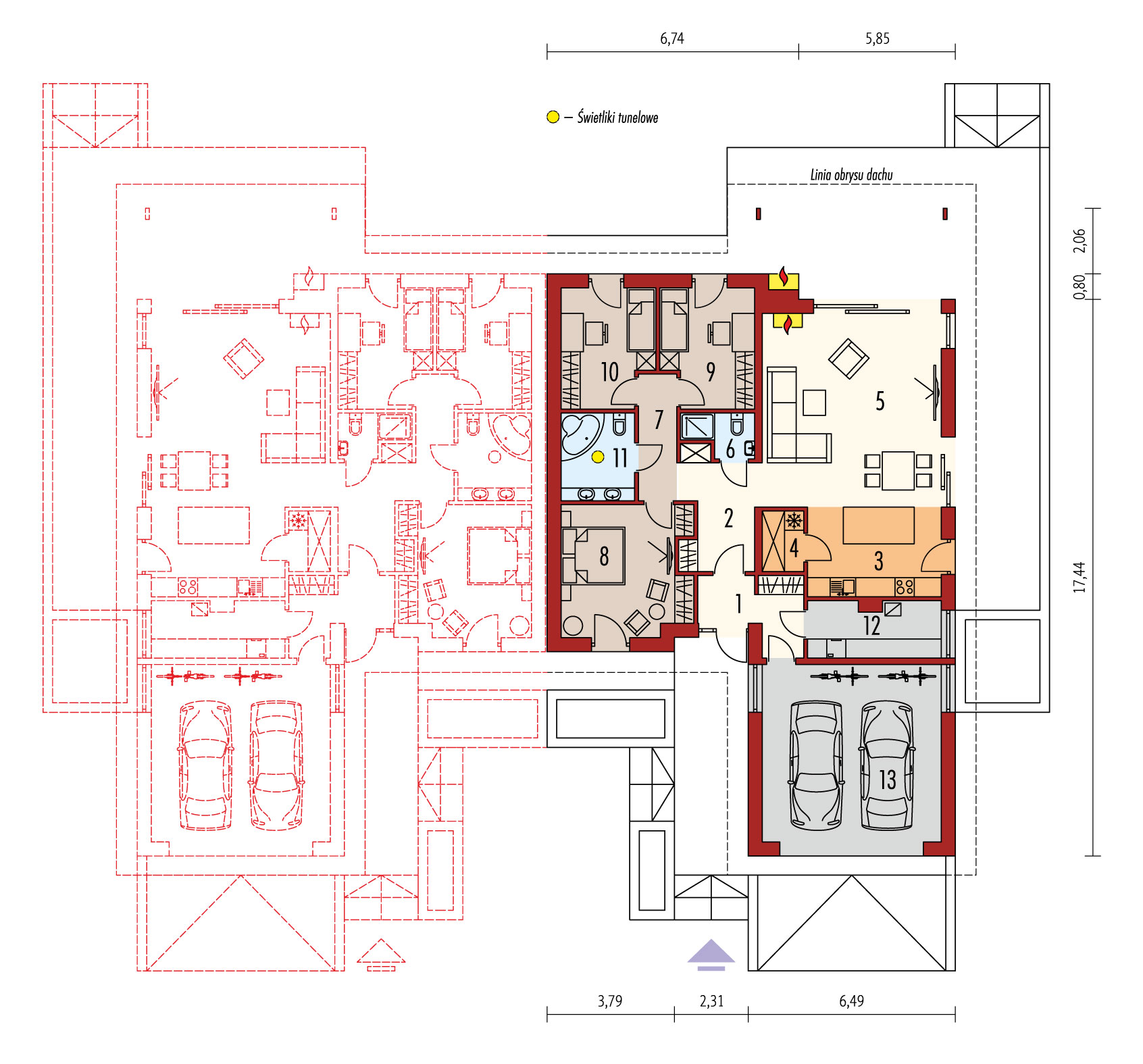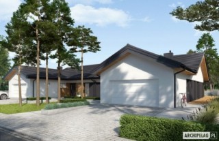 Powierzchnie i pozostałe dane liczbowe podano dla pojedynczego domu (połowa bliźniaka). Koszty budowy dotyczą pojedynczego domu (połowa bliźniaka). Cena dokumentacji technicznej obejmuje obydwa domy.Charakterystyka: Dom jednorodzinny w zabudowie bliźniaczej, parterowy, niepodpiwniczony, każdy segment z garażem dwustanowiskowym Przeznaczenie: Każdy segment dla 3-4-osobowej rodziny Technologia i konstrukcja: Ściany zewnętrzne: murowane, dwuwarstwowe, beton komórkowy firmy H+H 24 cm, ocieplenie styropian Termo Organika 20 cm Ściany wewnętrzne: nośne i działowe murowane, beton komórkowy firmy H+H 24 cm i 12 cm Strop: gęstożebrowy Teriva, ocieplenie wełna mineralna Isover 30 cm Dach: konstrukcja drewniana, dachówka ceramiczna płaska Bergamo firmy Röben, więźba dachowa dostępna również w systemie prefabrykacji drewnianejRozwiązania instalacyjne: Ogrzewanie: kocioł gazowy kondensacyjny firmy Viessmann, rozprowadzenie ciepła: grzejniki firmy Purmo Wentylacja: grawitacyjna OZE: kolektory słoneczneWykończenie: Elewacje: tynk cienkowarstwowy mineralny w kolorze białym TO-PA001 i grafitowym TO-GY011 z palety firmy Termo Organika, okładzina drewniana w pionowym układzie desek Stolarka: drewniana, PVC lub aluminiowa, rolety zewnętrzne w systemie CleverBox firmy BeClever, drzwi wejściowe i brama garażowa firmy Hörmann, świetliki tunelowe firmy Velux Pobierz ekspercki poradnik VELUX i dowiedz się jak wybrać okna dachoweOtoczenie: kostka betonowa i płyty tarasowe firmy Libet, system tarasowy ProDeck - deska kompozytowa Terra w kolorze orzechWersje domów w serii Simon - zapytaj o dostępność: - Simon – dom z poddaszem do adaptacji, 3 sypialnie, dach o kącie nachylenia 30° - Simon II – dom z poddaszem użytkowym, 3 sypialnie + gabinet, dach o kącie nachylenia 35° - Simon III – dom parterowy, 4 sypialnie, dach o kącie nachylenia 25° - Simon IV – dom parterowy, 3 sypialnie, dach o kącie nachylenia 25° - Simon (mały) – dom z poddaszem do adaptacji, mniejsza powierzchnia użytkowa, 3 sypialnie, dach o kącie nachylenia 35° - Simon III (wiązary) – system suchej zabudowy ścian działowych Rigips, wiązary prefabrykowane, rozwiązania materiałowo-technologiczne Grupy Saint-Gobain, układ funkcji jak w domu Simon III G2, dom parterowy, 4 sypialnie, dach o kącie nachylenia 25° - Simon IV (bliźniak) – dom parterowy w zabudowie bliźniaczej, 3 sypialnie, dach o kącie nachylenia 25° - Simon 01 (dwulokalowy) – dom z dwoma mieszkaniami, z poddaszem do adaptacji, dach o kącie nachylenia 30° – wszystkie wersje o podobnym układzie funkcji oraz z inną propozycją wykończenia elewacji – wszystkie wersje z trzema wariantami garaży: bez garażu, z garażem jedno- i dwustanowiskowym (wyjątek: dom dwulokalowy – tylko w wariancie bez garażu) – odbicie lustrzane do każdej wersjiWszystkie wersje domów możliwe w dwóch standardach/wariantach instalacyjnych: - ENERGO: kocioł gazowy kondensacyjny, grzejniki, wentylacja grawitacyjna, OZE: kolektory słoneczne - ENERGO PLUS: pompa ciepła, ogrzewanie podłogowe, wentylacja mechaniczna, OZE: kolektory słoneczne lub panele fotowoltaiczne Istnieją techniczne możliwości wykonania zmian:– podpiwniczenia budynku– zmiany kąta nachylenia dachu do 30° lub 35° i adaptacji poddasza na cele mieszkalne– wykonania budynku w technologii szkieletowej – dokonania zmian funkcjonalnych wg indywidualnych wymagań