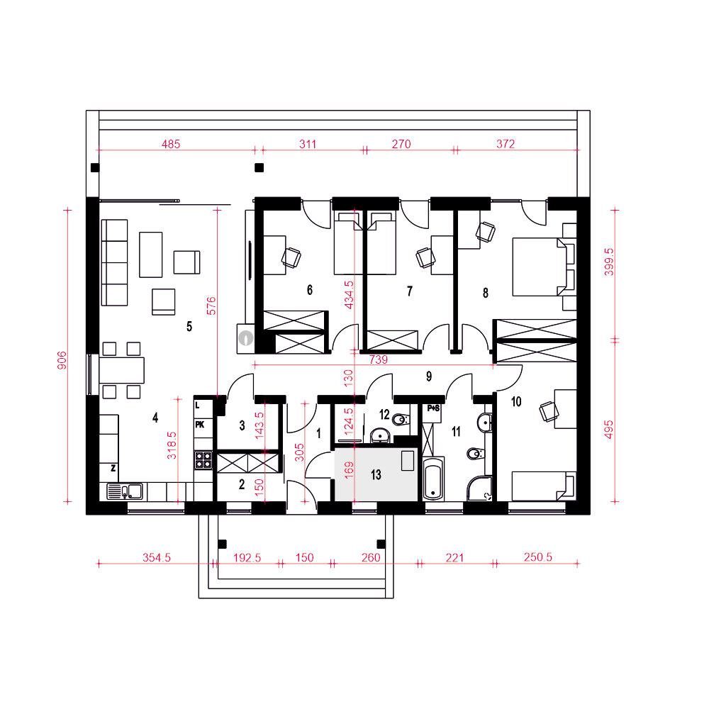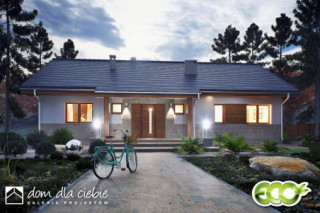 Projekt domu Gąska III to funkcjonalne i ekonomiczne rozwiązanie dla 4-5 osobowej rodziny. Na kompaktowej powierzchni zaplanowano cztery sypialnie, salon z otwartą kuchnią i jadalnią, dwie łazienki, spiżarnię oraz garderobę. Większość pomieszczeń rozmieszczono wzdłuż korytarza. Od frontu i ogrodu przewidziano zadaszenia na słupach. Nowoczesna elewacja z elementami drewna i kamienia nadaje bryle stylowy wygląd. Gąska III to połączenie estetyki, komfortu i rozsądnych kosztów budowy.fundamenty: BETONOWE ściany zewnętrzne: POROTHERM+OCIEPLENIE ściany wewnętrzne: POROTHERM rodzaj stropu: TERIVA I elewacje: TYNK STRUKTURALNY, OKŁADZINA KAMIENNA, DREWNIANA pokrycie dachu: DACHÓWKA