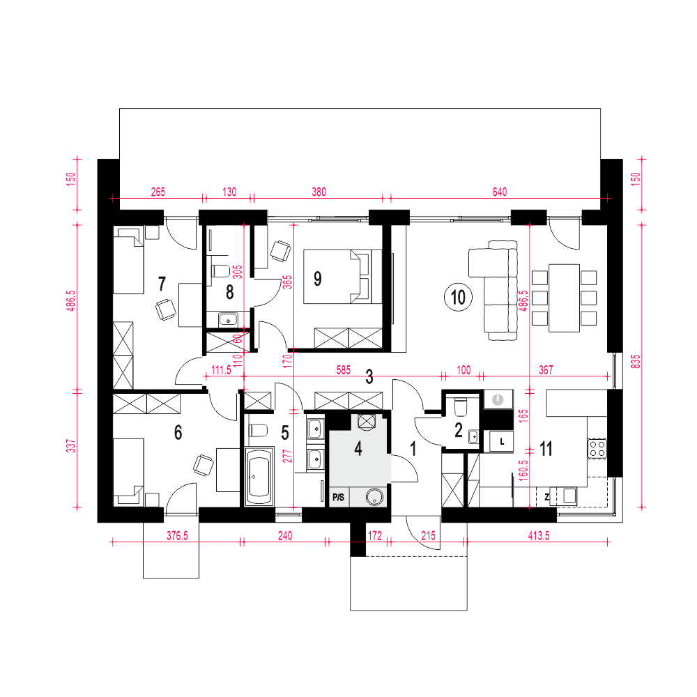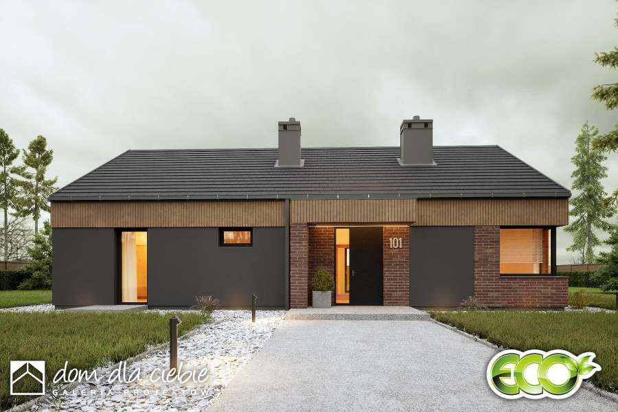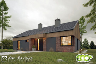 Projekt domu Hyzop III bez garażu to nowoczesny dom parterowy, typu stodoła, przeznaczony dla 4 do 5cio osobowej rodziny. Zaprojektowany jest w technologii murowanej z prefabrykowaną dwuspadową więźbą dachową. Hyzop III to bardzo funkcjonalny projekt domu parterowego, łączący strefę ogólnodostępną i prywatną na jednym poziomie. W strefie wejścia mamy przewidziany wygodny wiatrołap z wnękową szafą. Mamy tu też bezpośredni dostęp do kotłowni z pralnią oraz do osobnej toalety. W części ogólnodostępnej przestronny i dobrze doświetlony salon z jadalnia i kuchnią. Dzięki dużym drzwiom tarasowym od strony ogrodowej, dostaniemy się wprost na zewnętrzny zadaszony taras - na całej długości domu. W części prywatnej mamy do dyspozycji trzy pokoje sypialne w tym jeden z wygodną łazienką. Mamy tu też przewidzianą wspólną łazienkę z wanną i prysznicem dostępną z wygodnego korytarza na którym zapewniono sporo miejsca na szafy. Hyzop III to atrakcyjna propozycja parterowego domu energooszczędnego, o nowoczesnym wyglądzie. To projekt domu z serii "eco" - ekonomiczny w budowie i w utrzymaniu - idealna propozycja dla rodzin planujących budowę pierwszego domu.fundamenty: BETONOWE ściany zewnętrzne: POROTHERM+STYROPIAN TERMO ORGANIKA rodzaj stropu i konstrukcja dachu: wiązary prefabrykowane MITEK elewacje: OKŁADZINA KLINKIEROWA, TYNK STRUKTURALNY pokrycie dachu: BLACHA