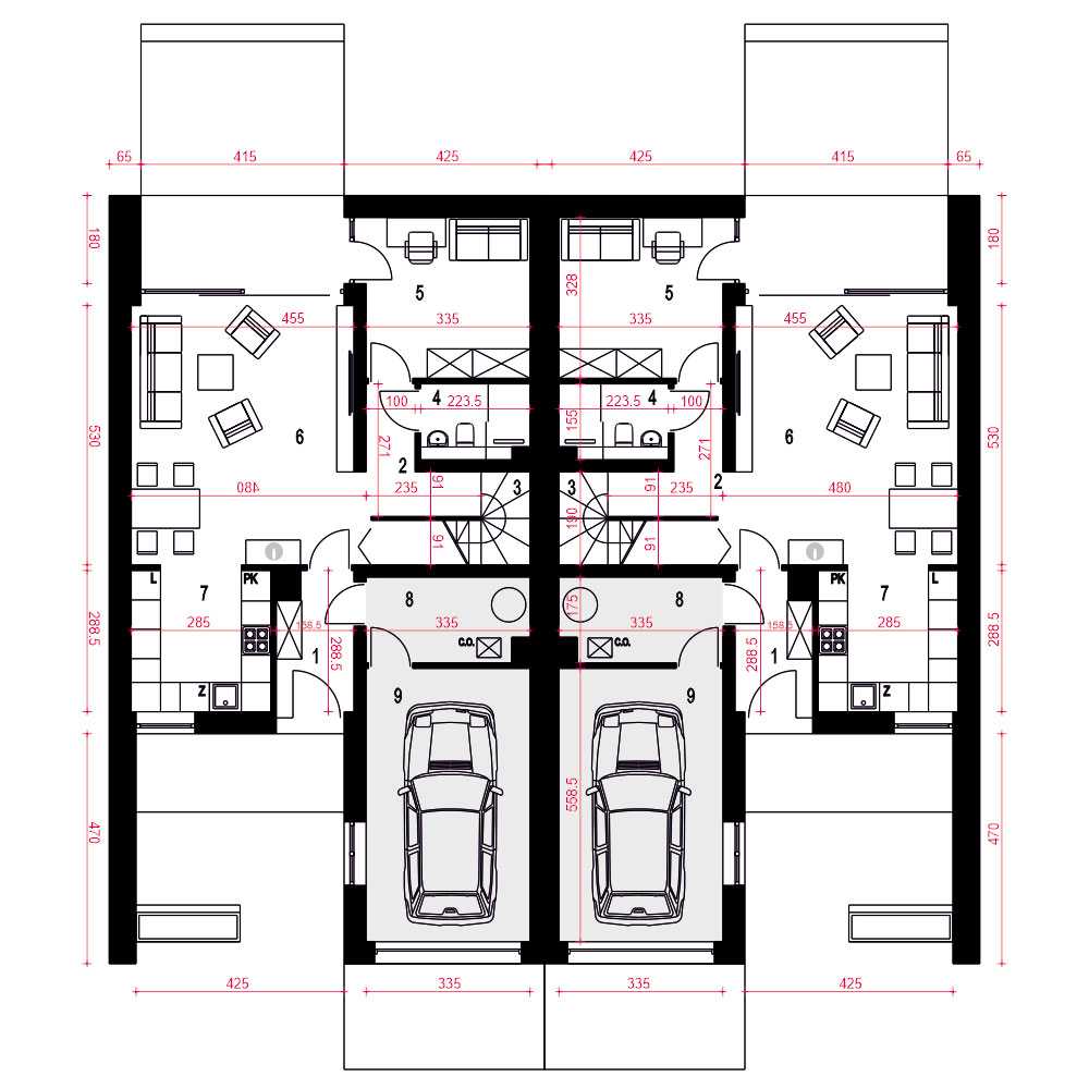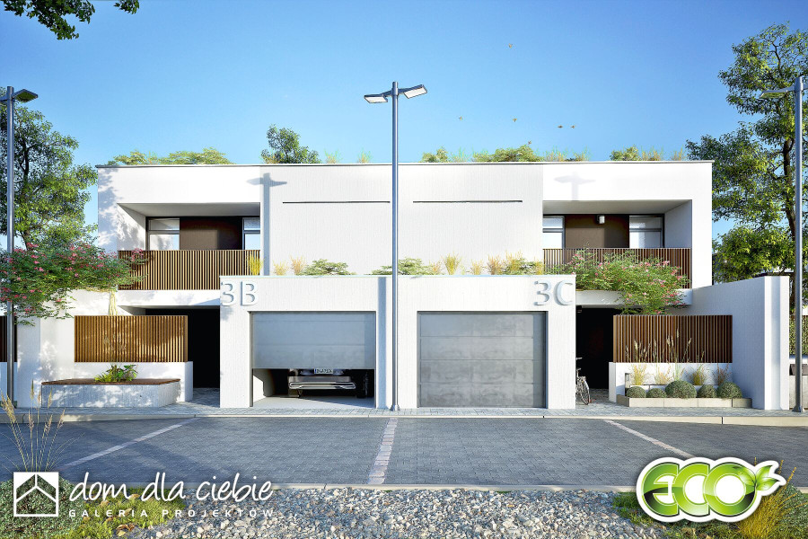 Poniższy opis odnosi się do jednego segmentu: Talia to nowoczesny, funkcjonalny dom rodzinny, dostępny jako wolnostojący lub w zabudowie bliźniaczej. Jego kompaktowa forma pozwala na posadowienie na wąskich działkach, co czyni go atrakcyjnym dla deweloperów. Parter obejmuje wiatrołap z wejściem do pomieszczenia gospodarczego i garażu, garderobę pod schodami, małą łazienkę, pokój oraz przestronną strefę dzienną z kuchnią, jadalnią i salonem. Garaż łączy się z częścią mieszkalną przez pomieszczenie techniczne. Na piętrze znajdują się trzy sypialnie, duża łazienka oraz wnęki na pralkę i suszarkę. Każda sypialnia ma dostęp do balkonu. Zielone tarasy nad garażem i pokojem na parterze podkreślają nowoczesny, ekologiczny charakter domu, który doskonale wpisuje się w estetykę współczesnych osiedli.
