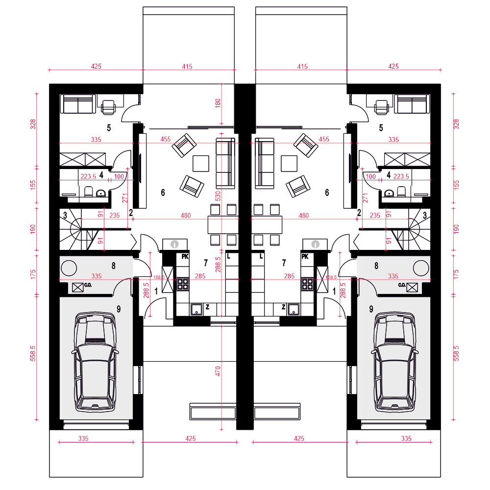 Poniższy opis odnosi się do jednego segmentu: Talia to nowoczesny, funkcjonalny dom rodzinny, dostępny jako wolnostojący lub w zabudowie bliźniaczej. Jego kompaktowa forma pozwala na posadowienie na wąskich działkach, co czyni go atrakcyjnym dla deweloperów. Parter obejmuje wiatrołap z wejściem do pomieszczenia gospodarczego i garażu, garderobę pod schodami, małą łazienkę, pokój oraz przestronną strefę dzienną z kuchnią, jadalnią i salonem. Garaż łączy się z częścią mieszkalną przez pomieszczenie techniczne. Na piętrze znajdują się trzy sypialnie, duża łazienka oraz wnęki na pralkę i suszarkę. Każda sypialnia ma dostęp do balkonu. Zielone tarasy nad garażem i pokojem na parterze podkreślają nowoczesny, ekologiczny charakter domu, który doskonale wpisuje się w estetykę współczesnych osiedli.