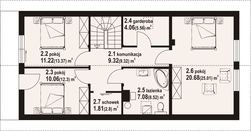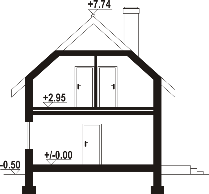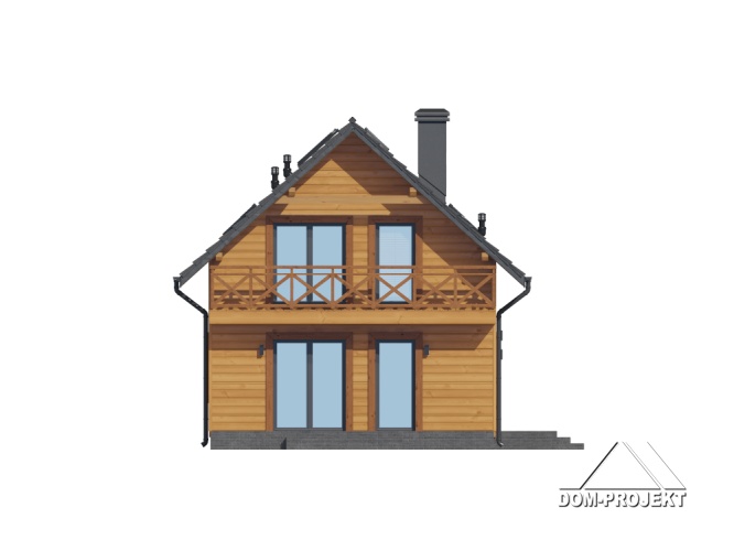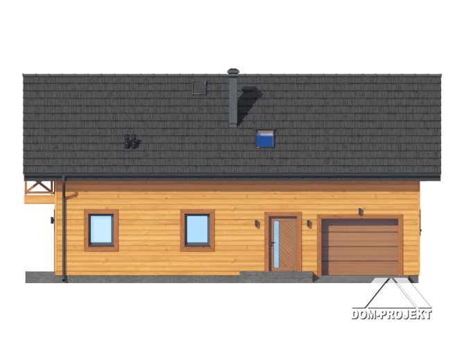 Dom w konstrukcji szkieletu drewnianego. Na parterze salon z aneksem kuchennym oraz wyjściem na taras. Komunikacja, łazienka, pokój do pracy, wiatrołap, garaż. Na poddaszu trzy pokoje, łazienka, schowek, komunikacja, garderoba oraz balkon dostępny z dwóch pokoi. Zwarta bryła budynku i dach dwuspadowy sprzyjają szybkiej i taniej budowie oraz niskim kosztom eksploatacji.