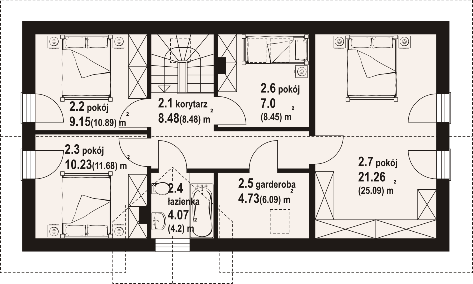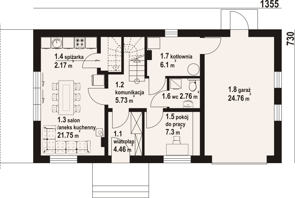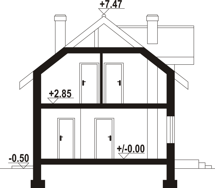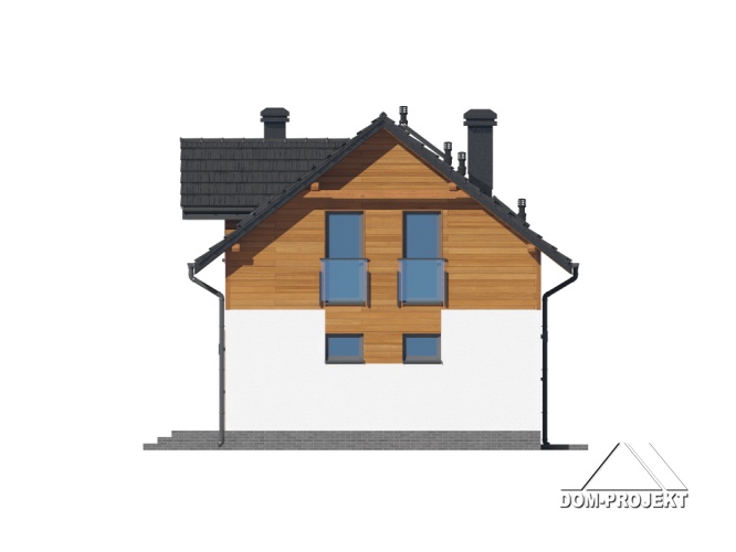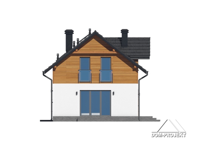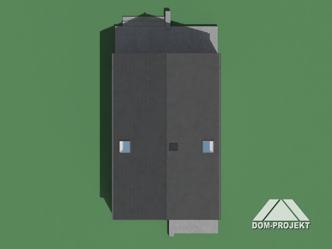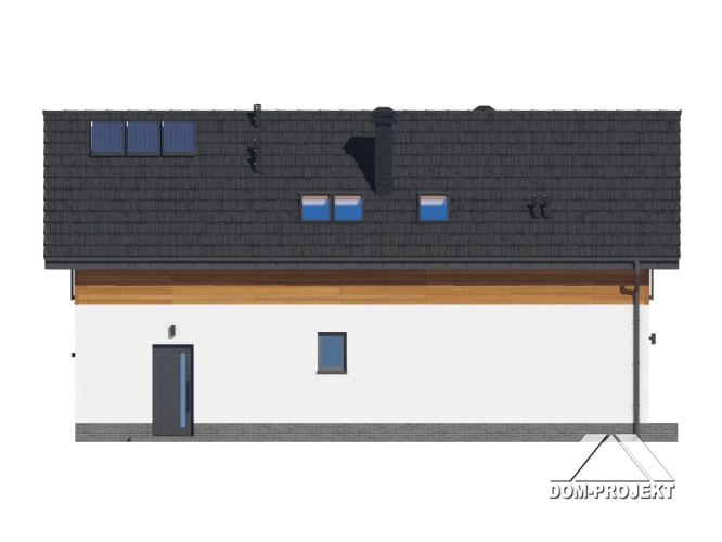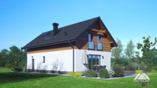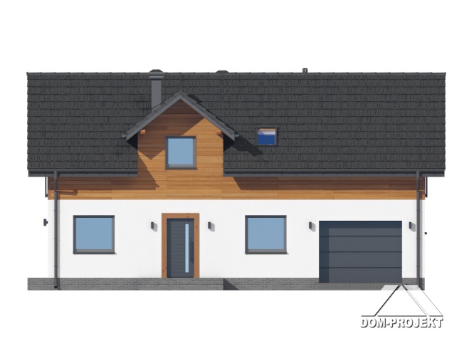 Dom z poddaszem użytkowym. Na parterze salon z aneksem kuchennym oraz wyjściem na taras. Komunikacja, wiatrołap, pokój do pracy, wc, kotłownia, garaż. Na poddaszu cztery pokoje, łazienka, garderoba, korytarz. Zwarta bryła budynku oraz dach dwuspadowy sprzyjają szybkiej i taniej budowie oraz niskim kosztom eksploatacji.