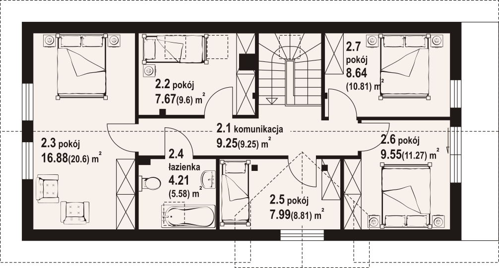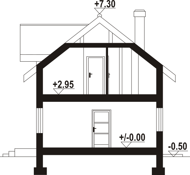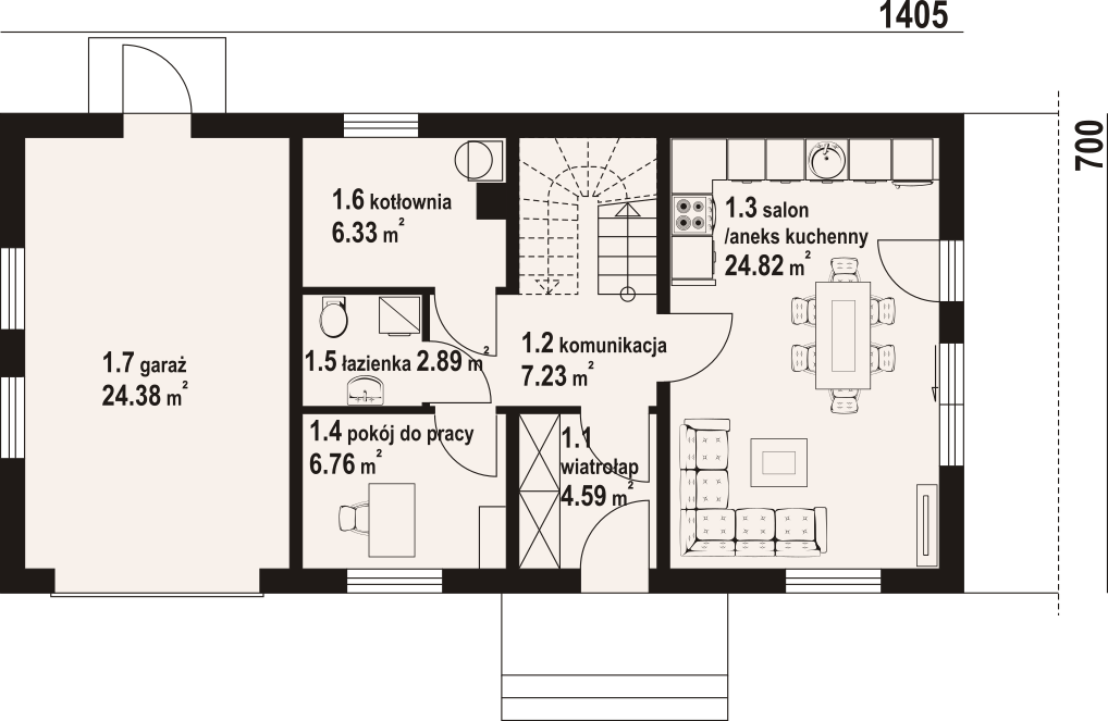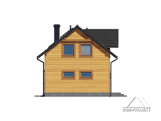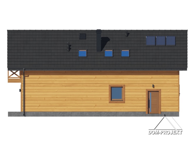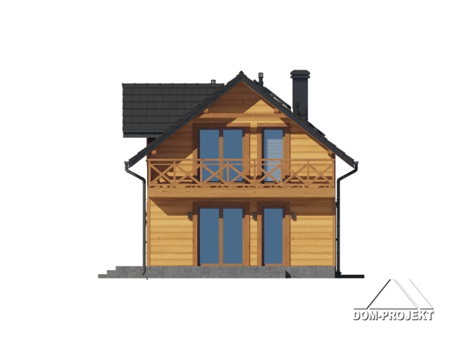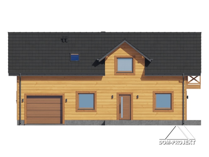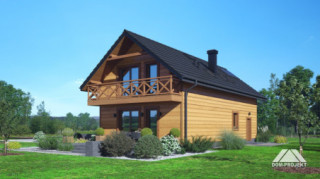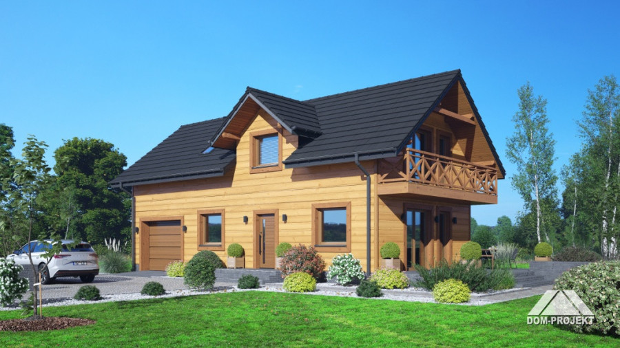 Dom w konstrukcji szkieletu drewnianego. Na parterze salon z aneksem kuchennym oraz wyjściem na taras. Pokój do pracy, łazienka, kotłownia, komunikacja, wiatrołap, garaż. Na poddaszu pięć pokoi, łazienka, komunikacja. Balkon dostępny z dwóch pokoi. Zwarta bryła budynku oraz dach dwuspadowy sprzyjają szybkiej i taniej budowie oraz niskim kosztom eksploatacji.