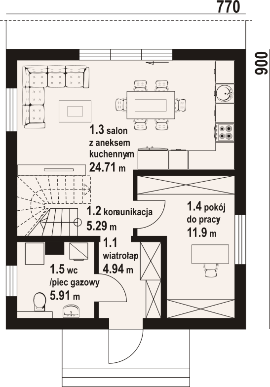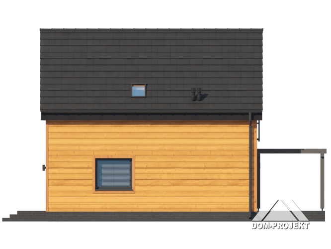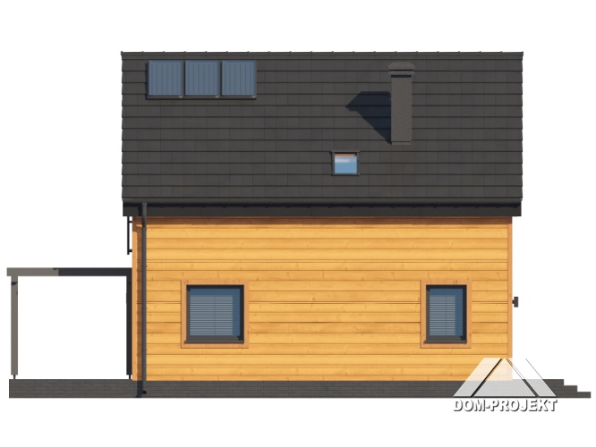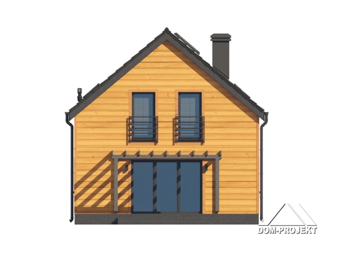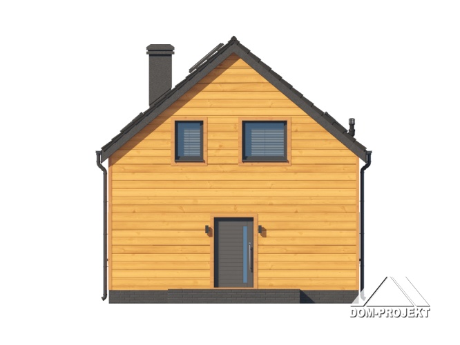 Dom w konstrukcji szkieletu drewnianego. Na parterze salon z aneksem kuchennym, wyjściem na taras i schodami na poddasze. Pokój do pracy, komunikacja, wiatrołap, wc/ piec gazowy. Na poddaszu trzy pokoje, komunikacja, łazienka, garderoba. Zwarta bryła budynku oraz dach dwuspadowy sprzyjają szybkiej i taniej budowie oraz niskim kosztom eksploatacji.
