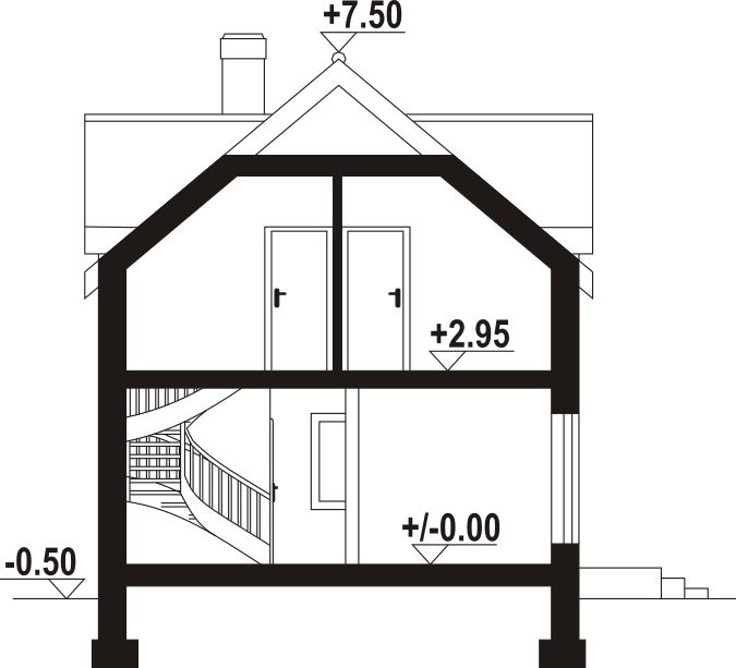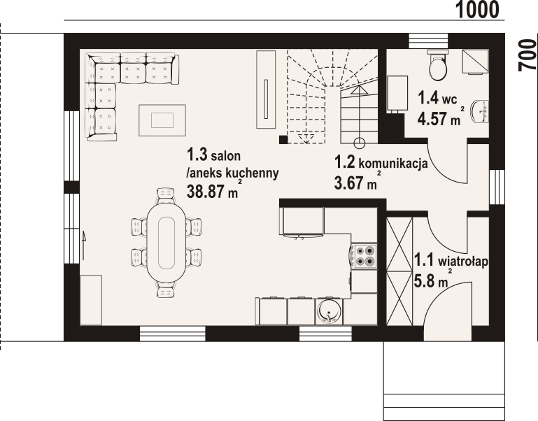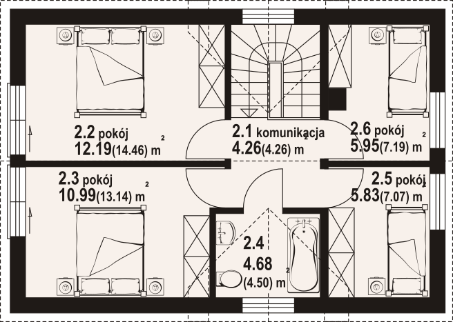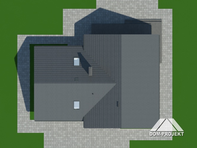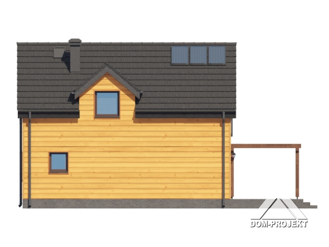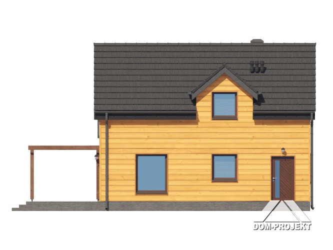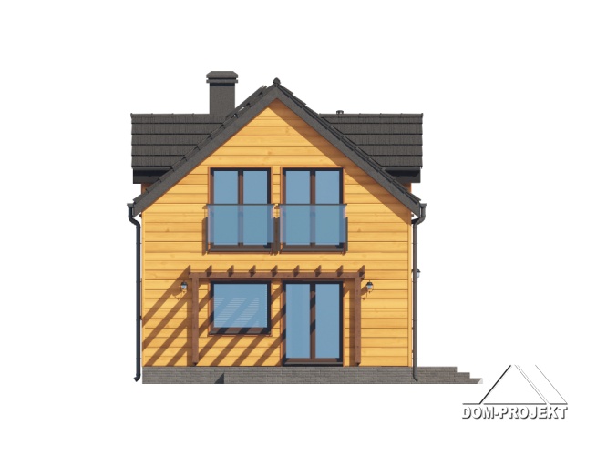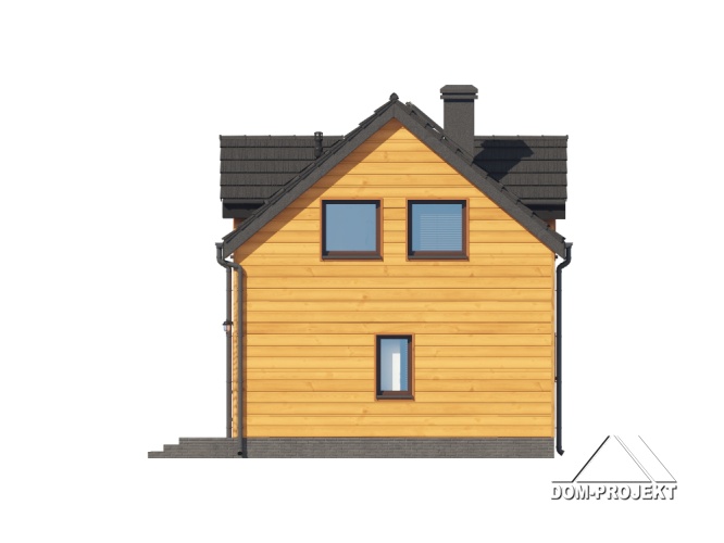 Dom w konstrukcji szkieletu drewnianego. Na parterze salon z aneksem kuchennym, wyjściem na taras i schodami na poddasze. Wc, komunikacja, wiatrołap. Na poddaszu cztery pokoje, łazienka, komunikacja. Zwarta bryła budynku oraz dach dwuspadowy sprzyjają szybkiej i taniej budowie oraz niskim kosztom eksploatacji.