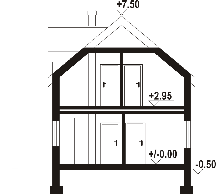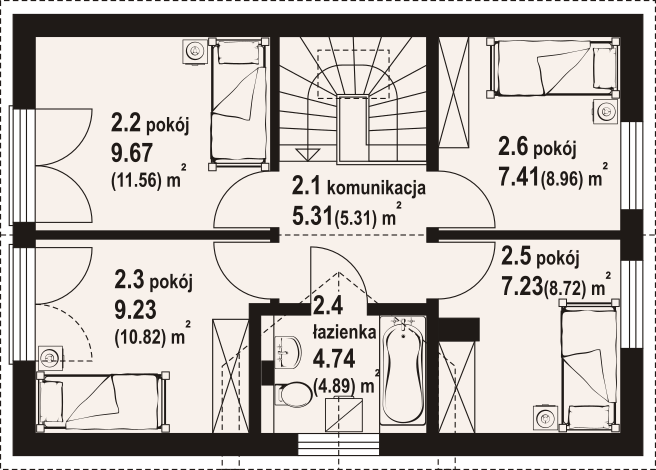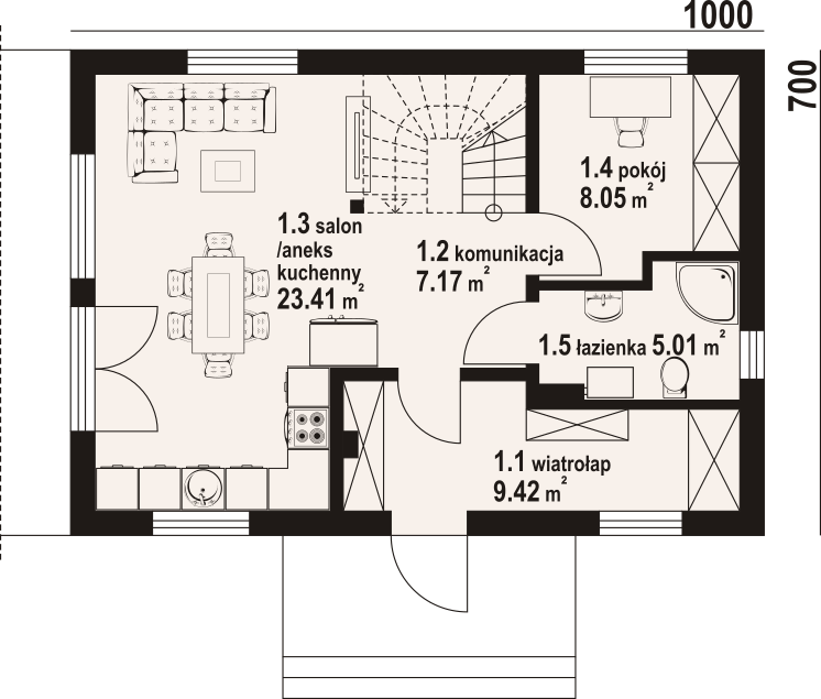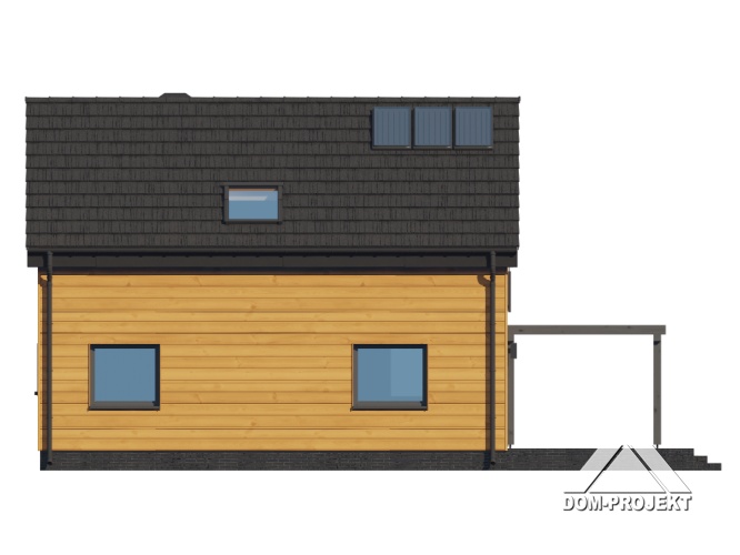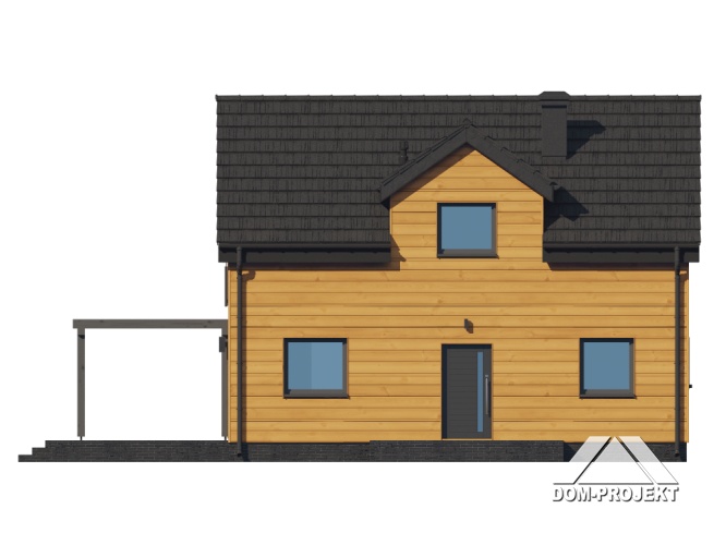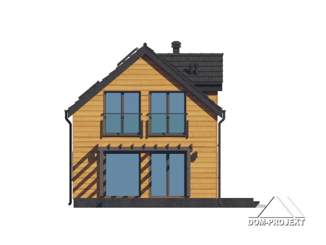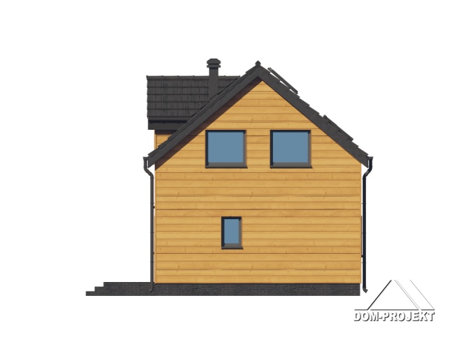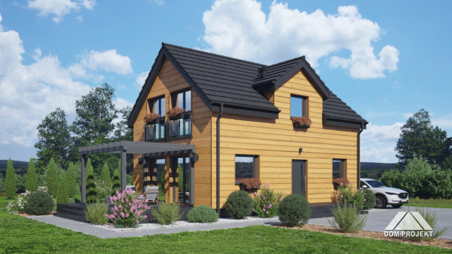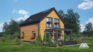 Dom w konstrukcji szkieletu drewnianego. Na parterze salon z aneksem kuchennym, wyjściem na taras i schodami na poddasze. Pokój, łazienka, komunikacja, wiatrołap. Na poddaszu cztery pokoje, łazienka, komunikacja. Zwarta bryła budynku oraz dach dwuspadowy sprzyjają szybkiej i taniej budowie oraz niskim kosztom eksploatacji.