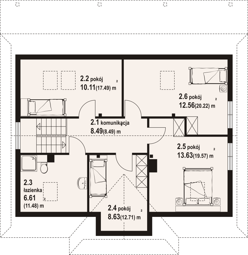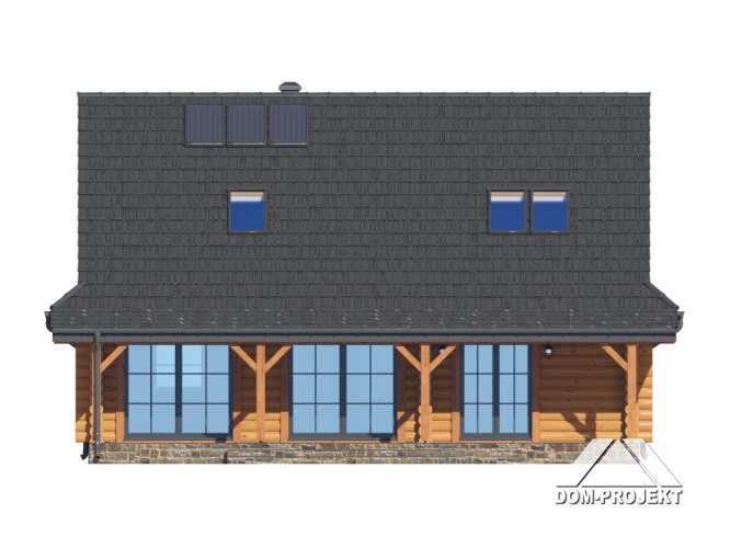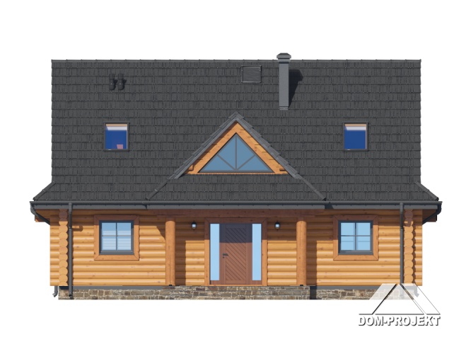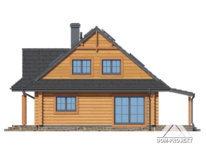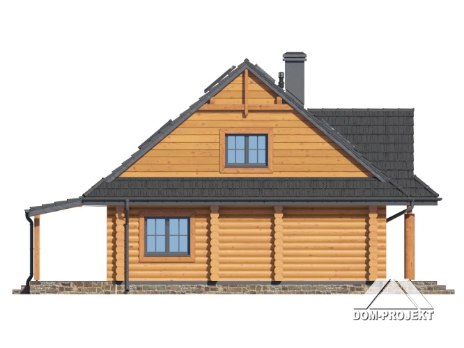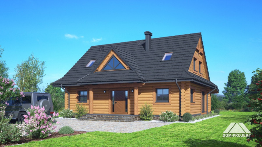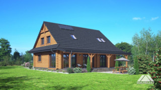 Dom z bali. Na parterze salon z kuchnią, kominkiem oraz wyjściem na duży, zadaszony taras. Komunikacja, pokój, łazienka, spiżarka, wiatrołap, kotłownia. Cztery pokoje, łazienka, komunikacja. Zwarta bryła budynku oraz dach dwuspadowy sprzyjają szybkiej i taniej budowie oraz niskim kosztom eksploatacji.