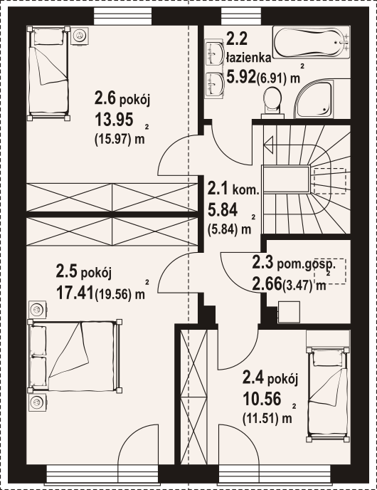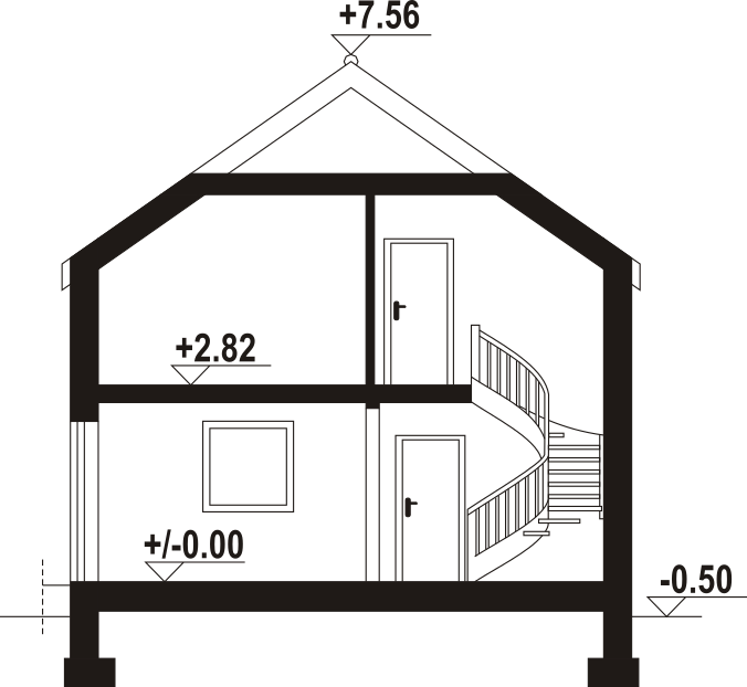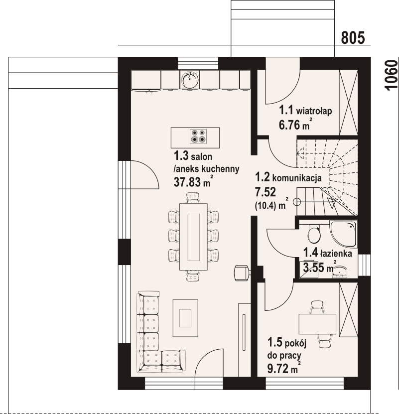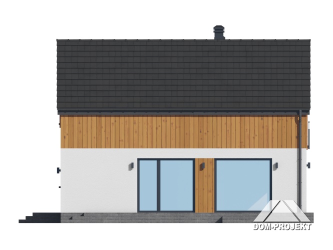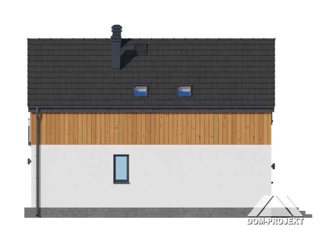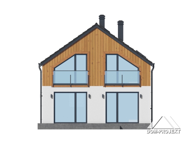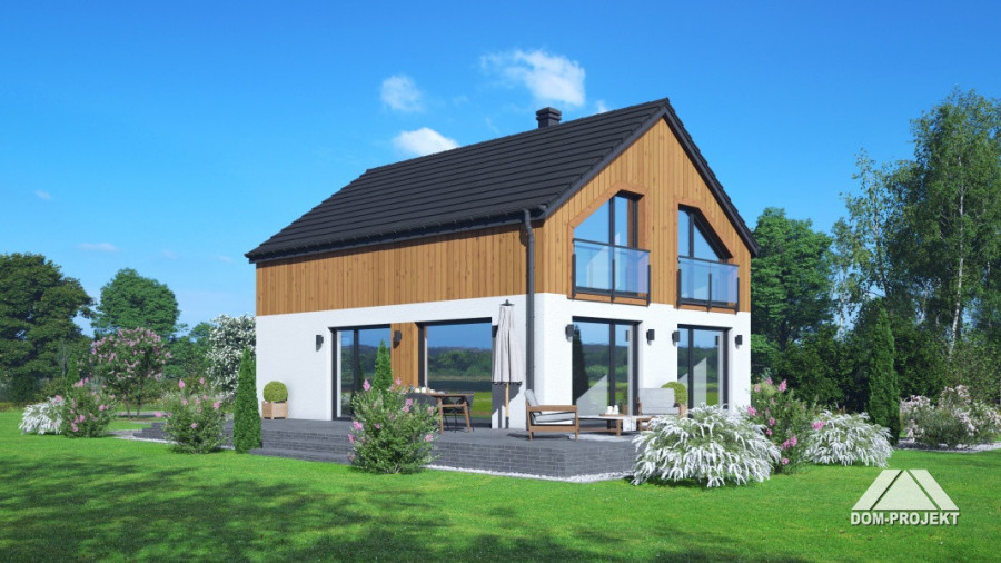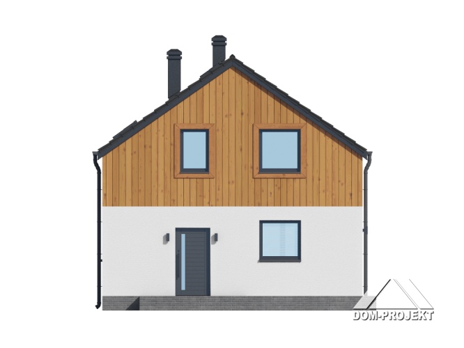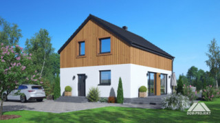 Dom z poddaszem użytkowym. Na parterze salon z aneksem kuchennym, kominkiem oraz wyjściem na taras. Pokój do pracy, łazienka, komunikacja, wiatrołap. Trzy pokoje, łazienka, komunikacja, pomieszczenie gospodarcze. Zwarta bryła budynku oraz dach dwuspadowy sprzyjają szybkiej i taniej budowie oraz niskim kosztom eksploatacji.