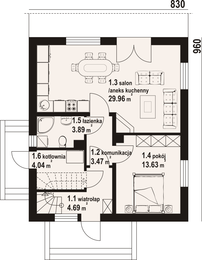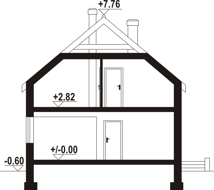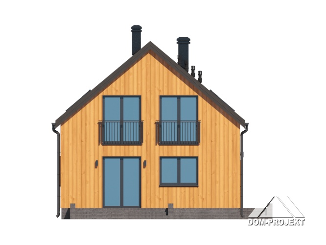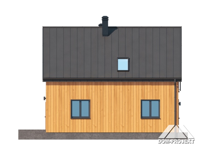 Dom z poddaszem użytkowym. Na parterze salon z aneksem kuchennym, kominkiem oraz wyjściem na taras. Pokój, komunikacja, wiatrołap, kotłownia, łazienka. Na poddaszu trzy pokoje, łazienka, komunikacja. Zwarta bryła budynku oraz dach dwuspadowy sprzyjają szybkiej i taniej budowie oraz niskim kosztom eksploatacji.