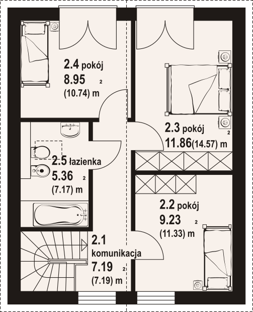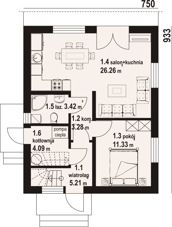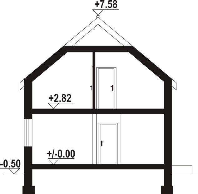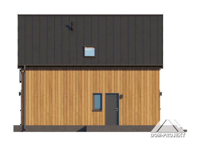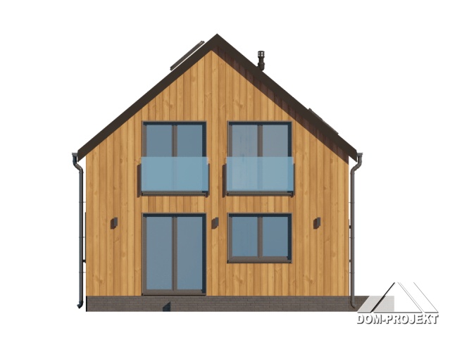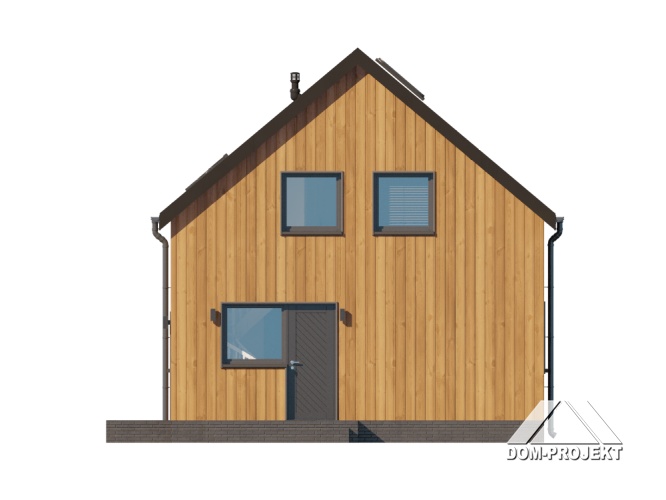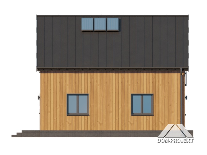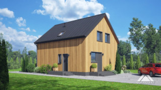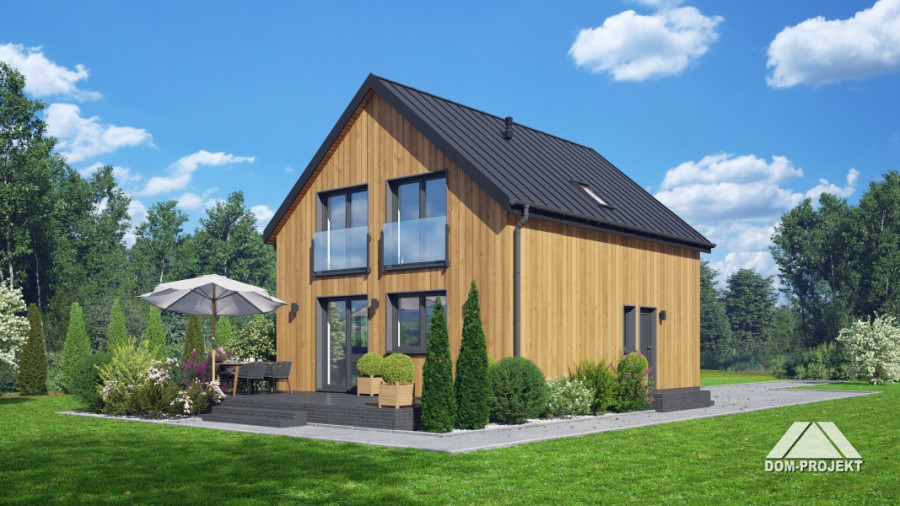 Dom z poddaszem użytkowym. Na parterze salon z kuchnią oraz wyjściem na taras. Pokój, łazienka, kotłownia, komunikacja, wiatrołap. Na poddaszu trzy pokoje, łazienka, komunikacja. Zwarta bryła budynku oraz dach dwuspadowy sprzyjają szybkiej i taniej budowie oraz niskim kosztom eksploatacji.