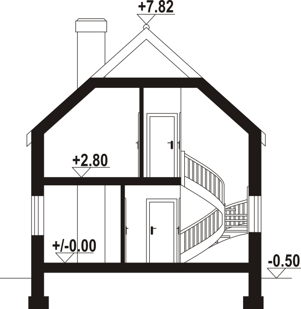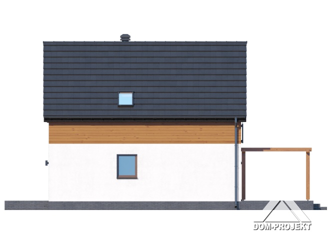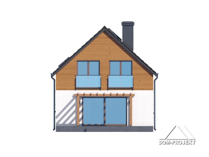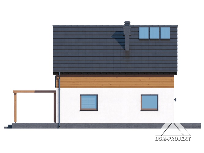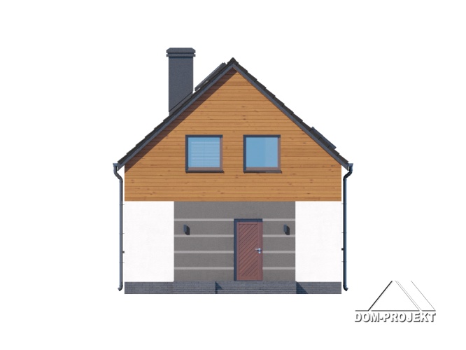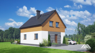 Dom z poddaszem użytkowym. Na parterze salon z aneksem kuchennym, kominkiem, wyjściem n taras. Wiatrołap, kotłownia, łazienka. Na poddaszu trzy pokoje, łazienka, komunikacja. Zwarta bryła budynku oraz dach dwuspadowy sprzyjają szybkiej i taniej budowie oraz niskim kosztom eksploatacji