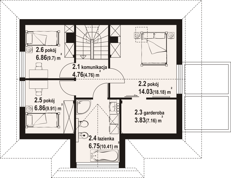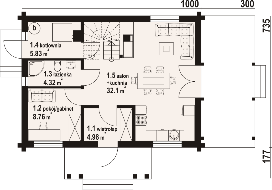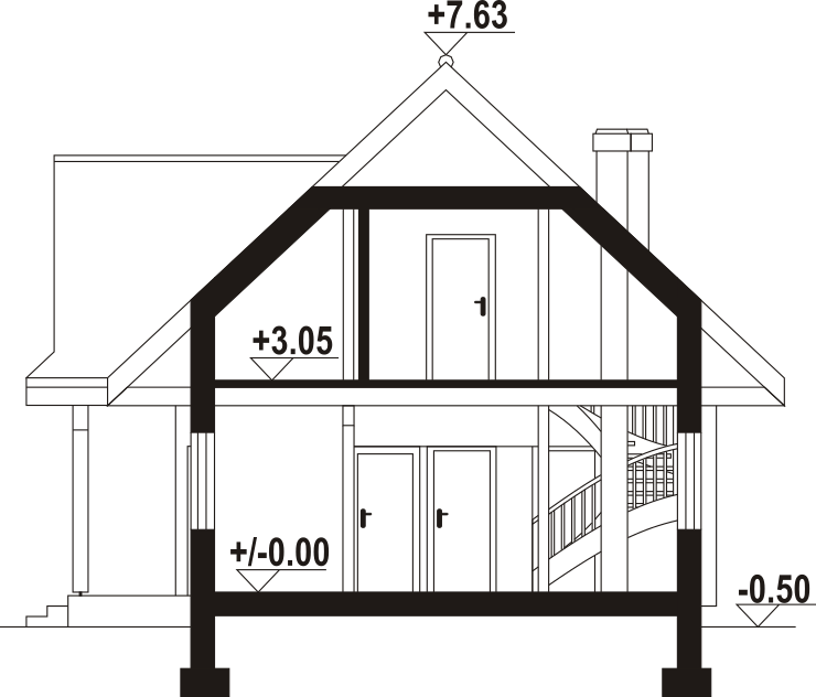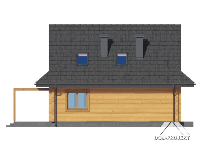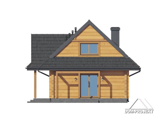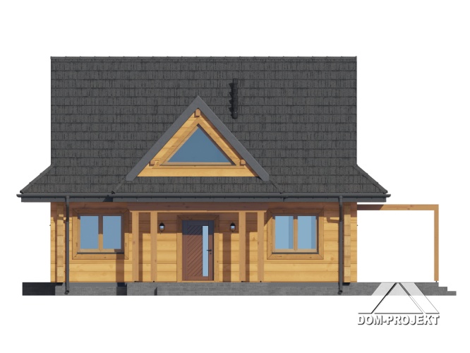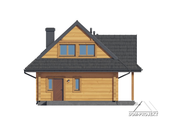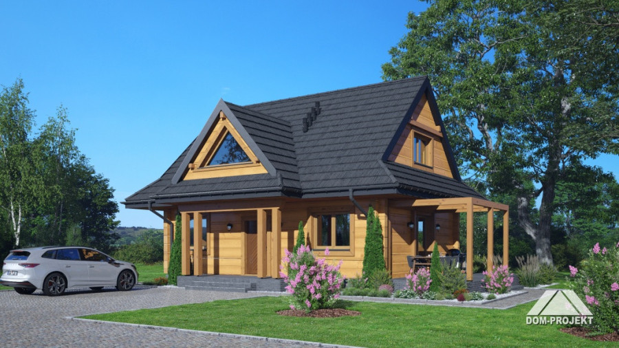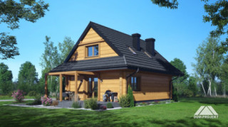 Dom z bali. Na parterze salon z aneksem kuchennym, kominkiem, wyjściem na taras i schodami na poddasze. Kotłownia, łazienka, pokój-gabinet, wiatrołap. Na poddaszu trzy pokoje, łazienka, komunikacja, garderoba. Zwarta bryła budynku oraz dach dwuspadowy sprzyjają szybkiej i taniej budowie oraz niskim kosztom eksploatacji.