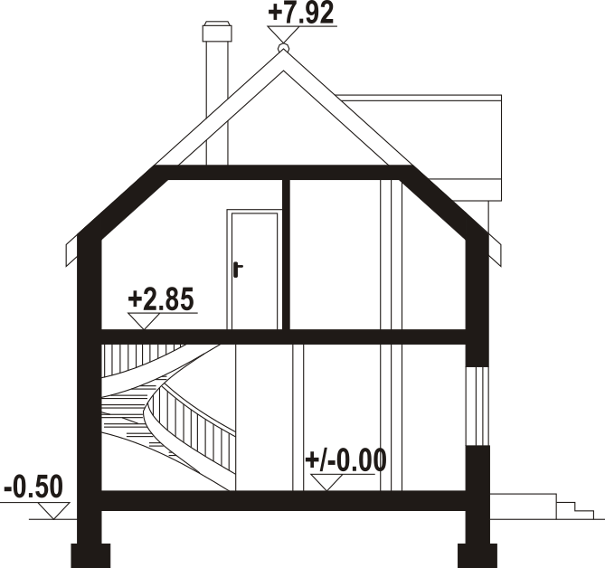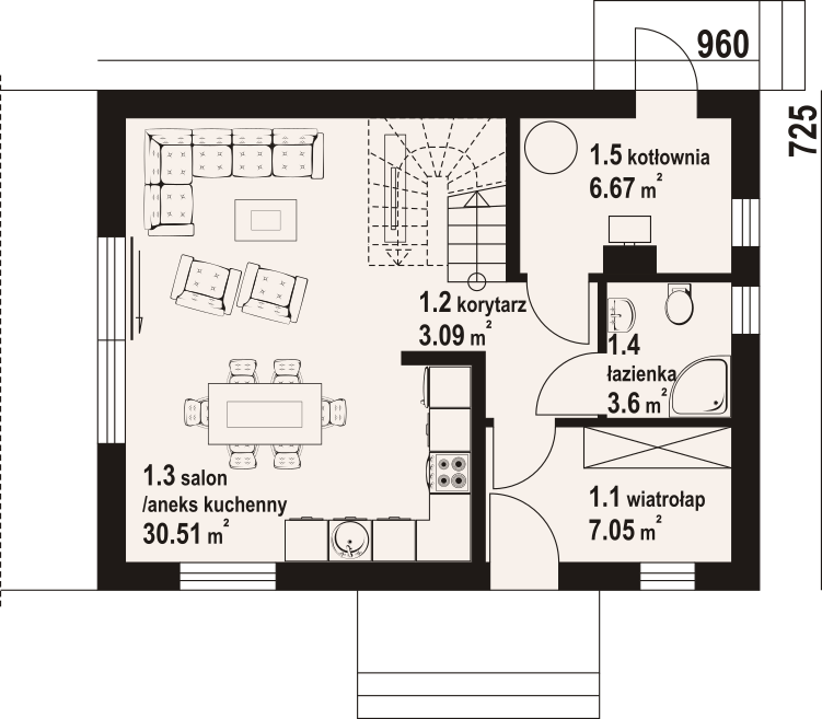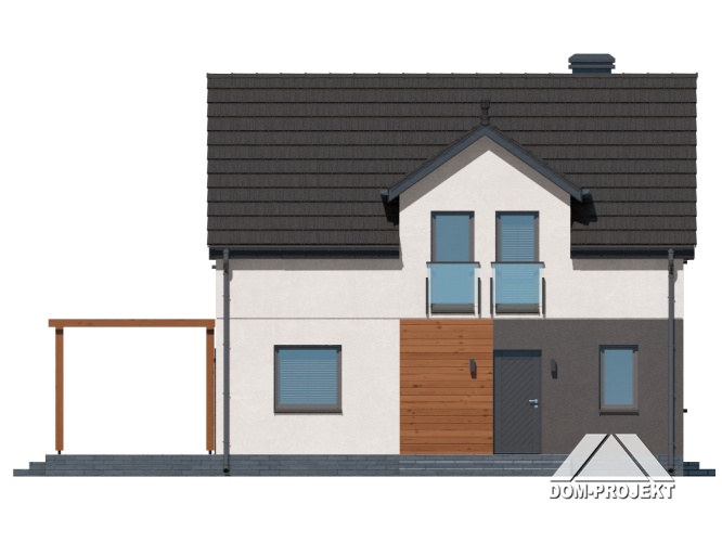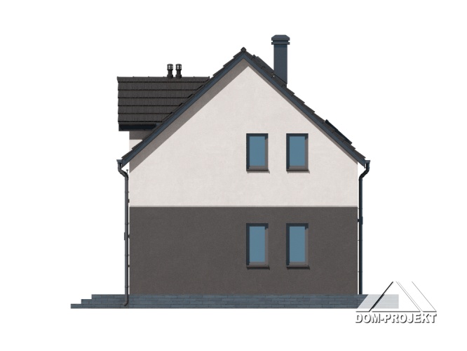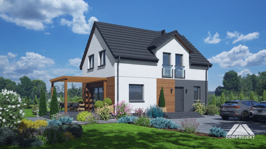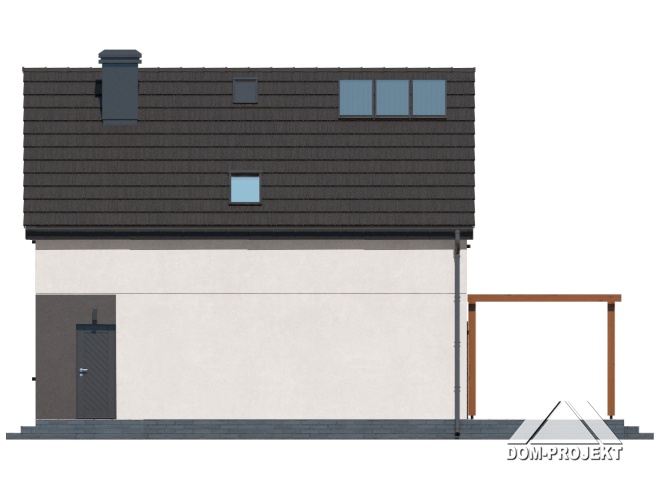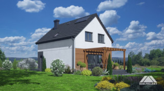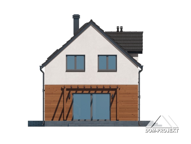 Dom z poddaszem użytkowym. Na parterze salon z aneksem kuchennym, wyjściem na taras i schodami na poddasze. Kotłownia, łazienka, wiatrołap, korytarz. Na poddaszu trzy pokoje, łazienka, komunikacja, wc. Zwarta bryła budynku oraz dach dwuspadowy sprzyjają szybkiej i taniej budowie oraz niskim kosztom eksploatacji.