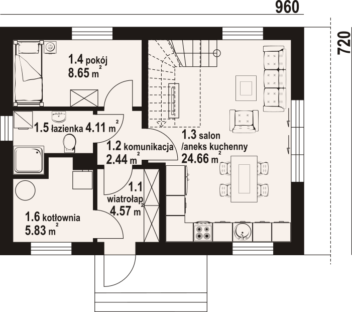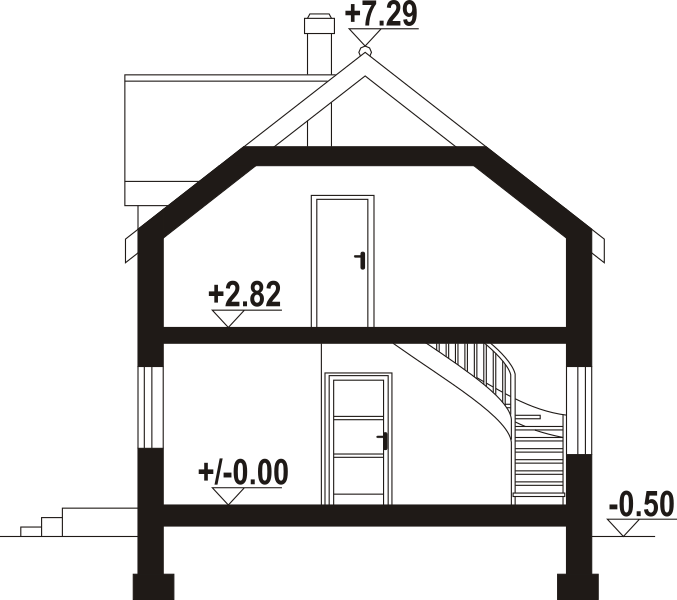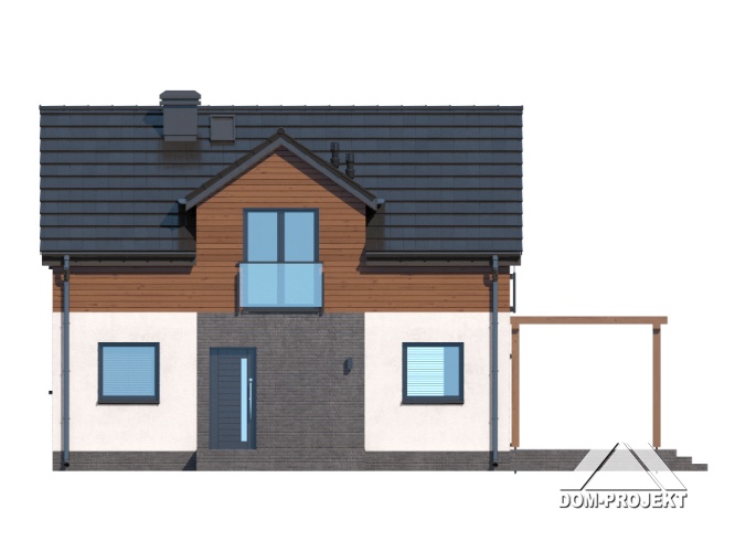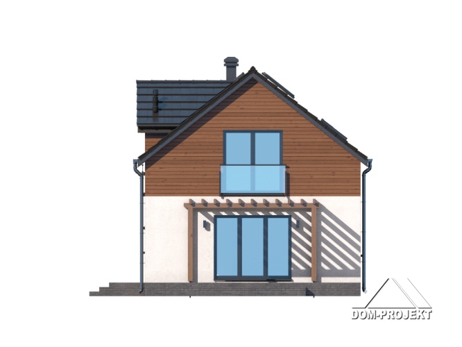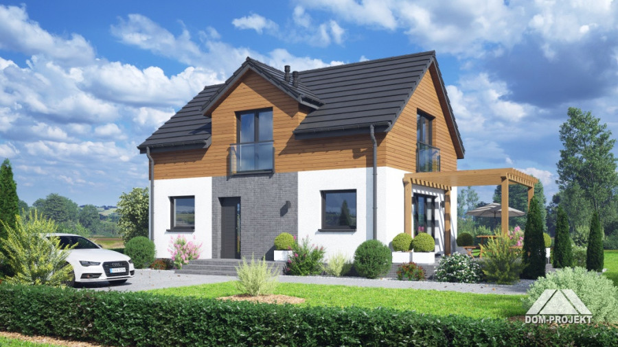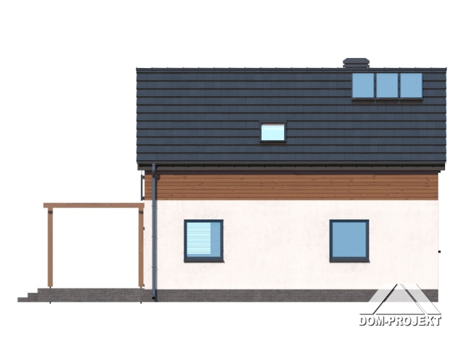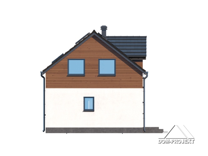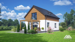 Dom z poddaszem użytkowym. Na parterze salon z aneksem kuchennym, wyjściem na taras i schodami na poddasze. Pokój, łazienka, kotłownia, komunikacja, wiatrołap. Na poddaszu trzy pokoje, komunikacja, łazienka. Zwarta bryła budynku oraz dach dwuspadowy sprzyjają szybkiej i taniej budowie oraz niskim kosztom eksploatacji.