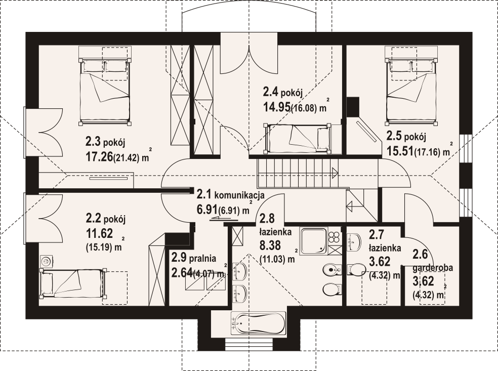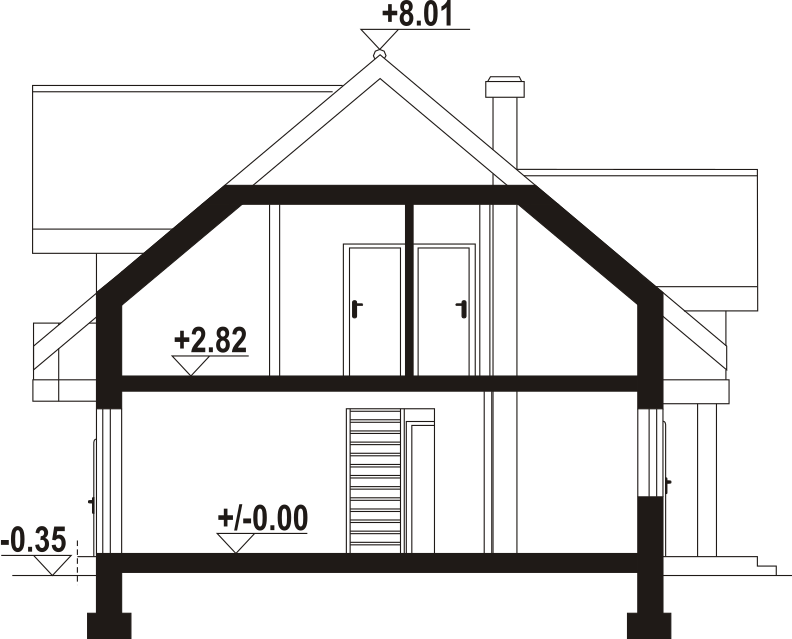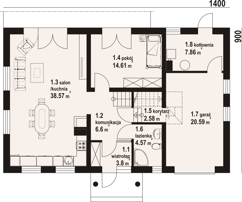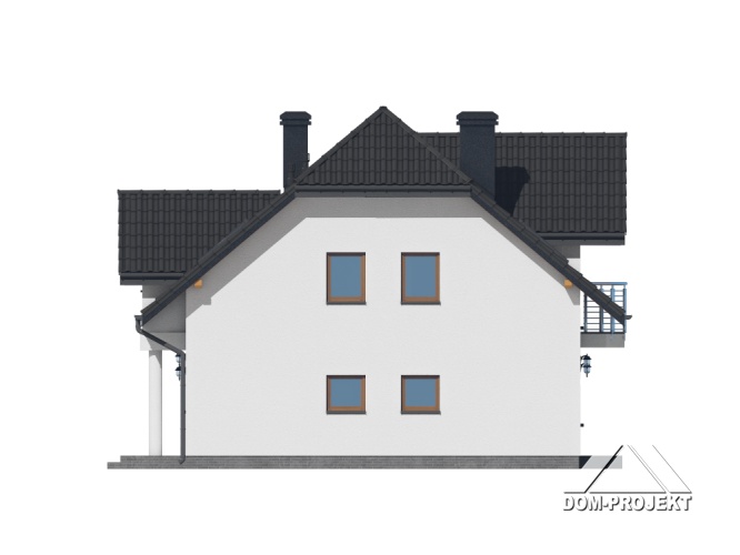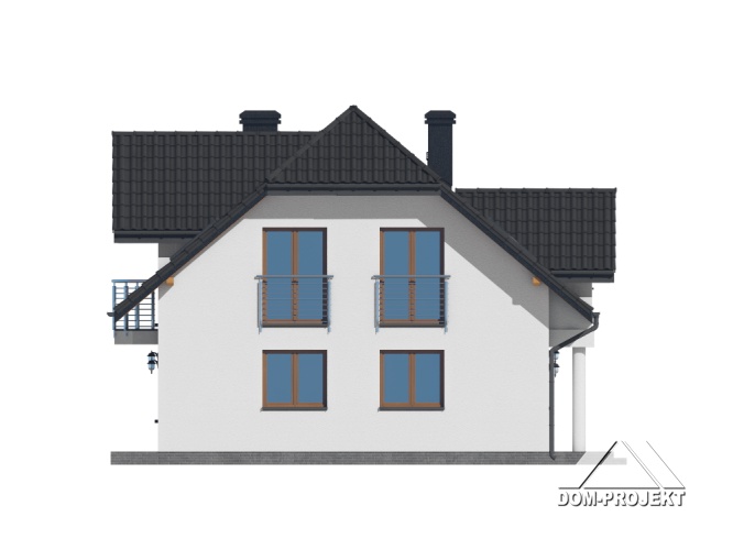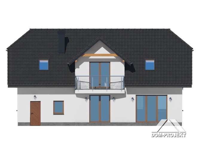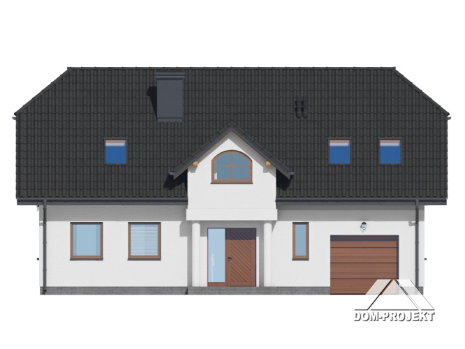Dom z poddaszem użytkowym. Na parterze salon z kuchnią, kominkiem oraz wyjściem na taras. Pokój, komunikacja, wiatrołap, łazienka, korytarz, garaż, kotłownia. Na poddaszu cztery pokoje, dwie łazienki, pomieszczenie gospodarcze, garderoba oraz balkon.