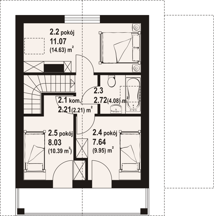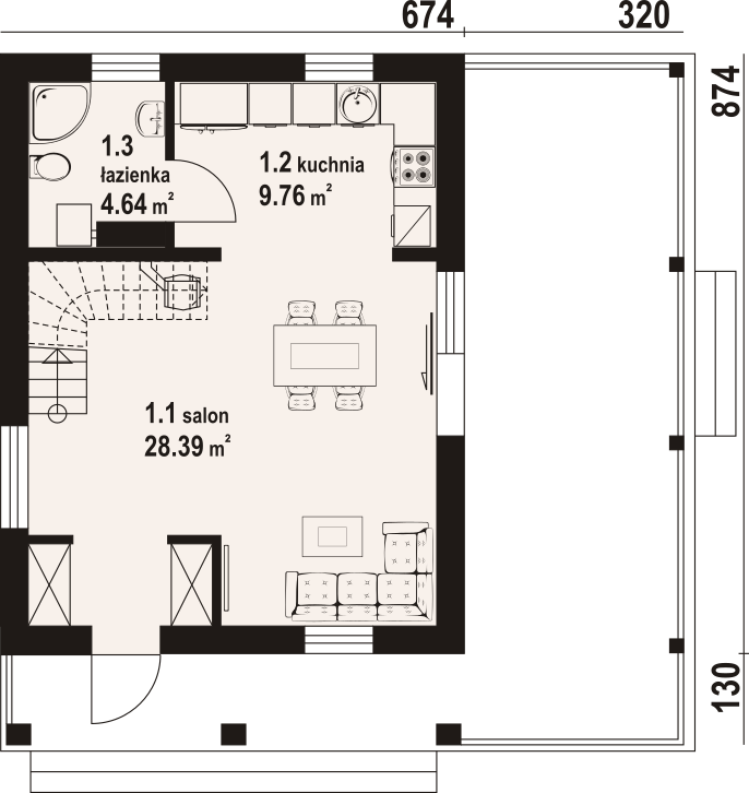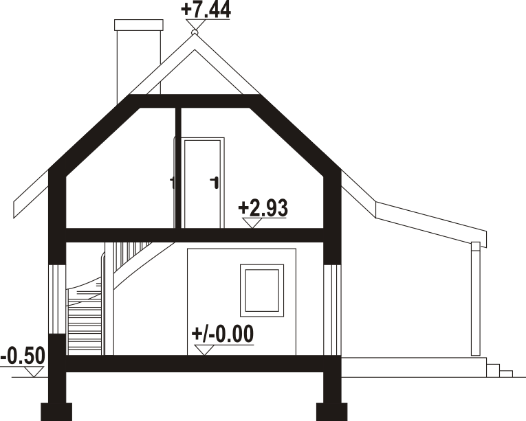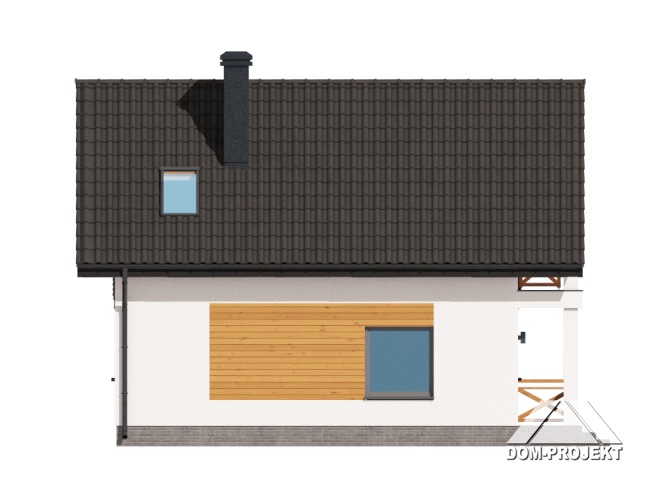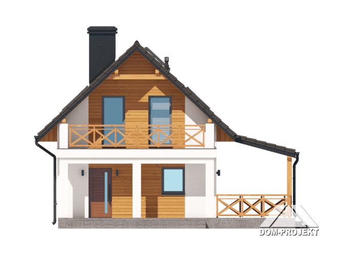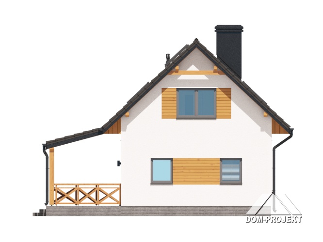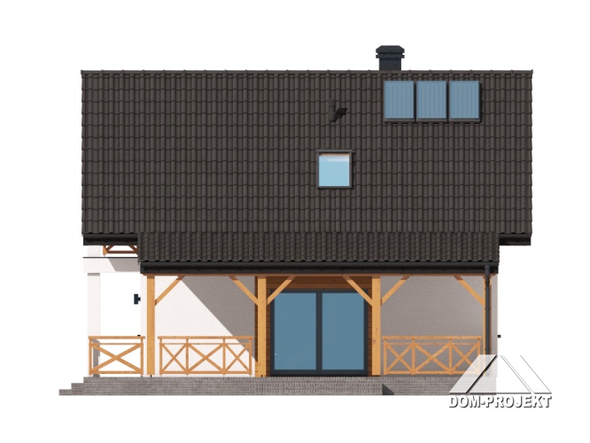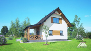 Dom z poddaszem użytkowym. Na parterze salon z kuchnią, kominkiem, wyjściem na duży, zadaszony taras i schodami na poddasze, łazienka. Na poddaszu trzy pokoje, komunikacja, łazienka. Zwarta bryła budynku oraz dach dwuspadowy sprzyjają szybkiej i taniej budowie oraz niskim kosztom eksploatacji.