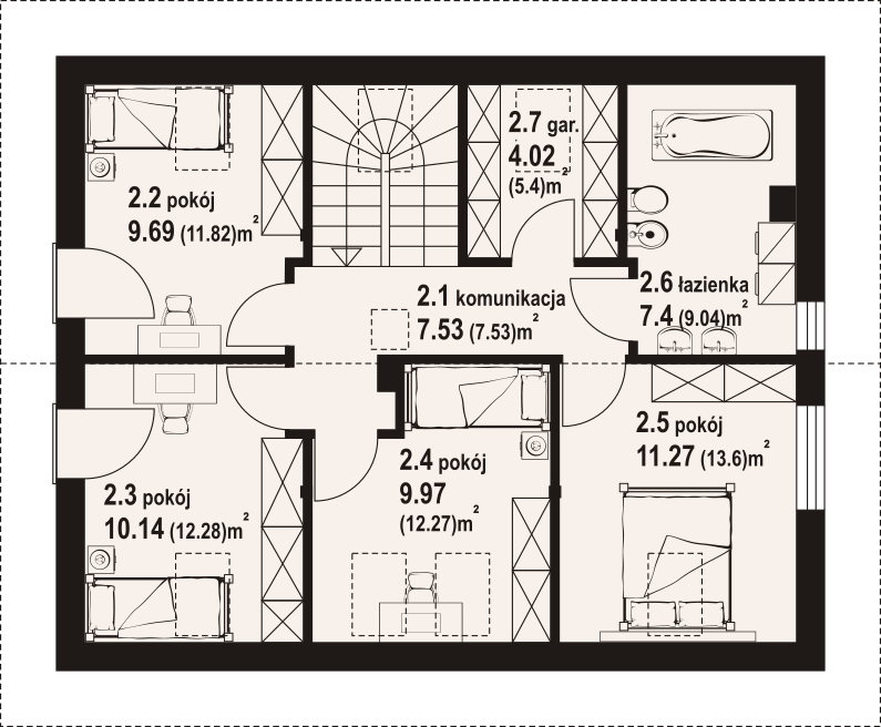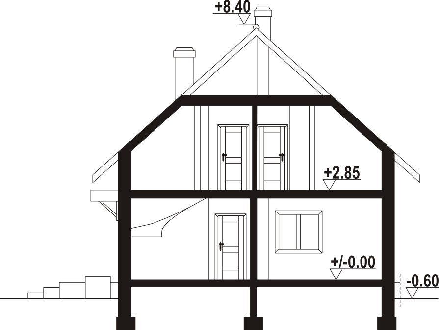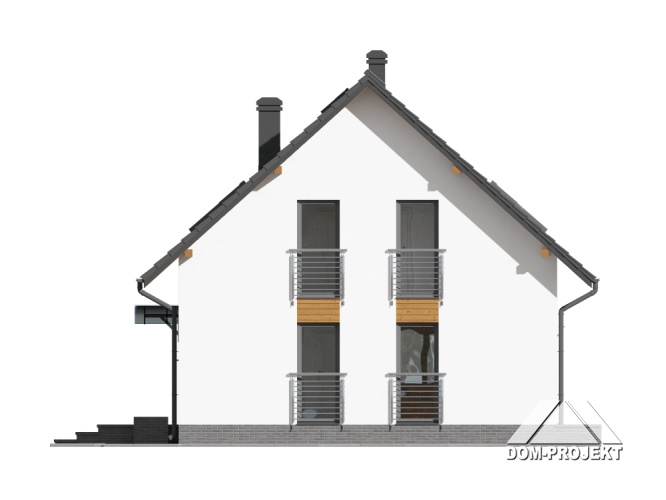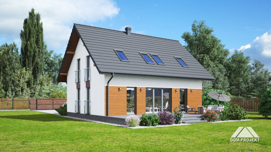Dom z poddaszem użytkowym. Na parterze salon z kuchnią, kominkiem oraz wyjściem na taras. Pokój, komunikacja, łazienka, pomieszczenie gospodarcze, wiatrołap. Na poddaszu cztery pokoje, łazienka, komunikacja, garderoba. Zwarta bryła budynku oraz dach dwuspadowy sprzyjają szybkiej i taniej budowie oraz niskim kosztom eksploatacji.